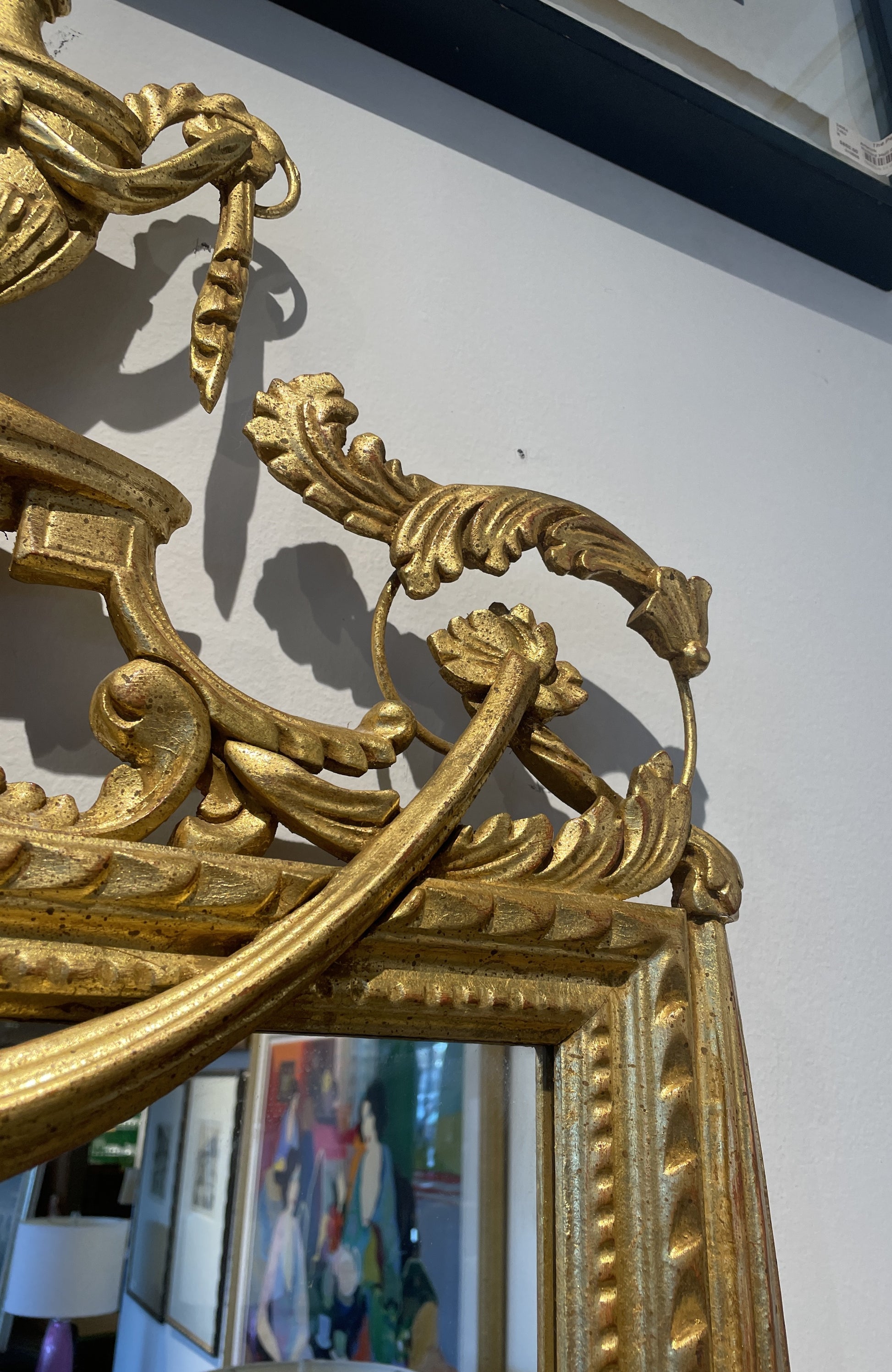 Decorative Crafts Louis XVI mirror. This stunning piece features a large rectangular mirror held in an ornate gilt frame. The frame has a beaded inner border and crown molding in an egg and dart pattern on its outer border. The top of the frame has an intricate and eye catching crest that includes an urn design along with scrolling leaves and other floral motifs. The mirror is further adorned with a draping ribbon detail across the top edge. This stunning mirror is sure to elevate a space with its ornate details and eye catching charm.