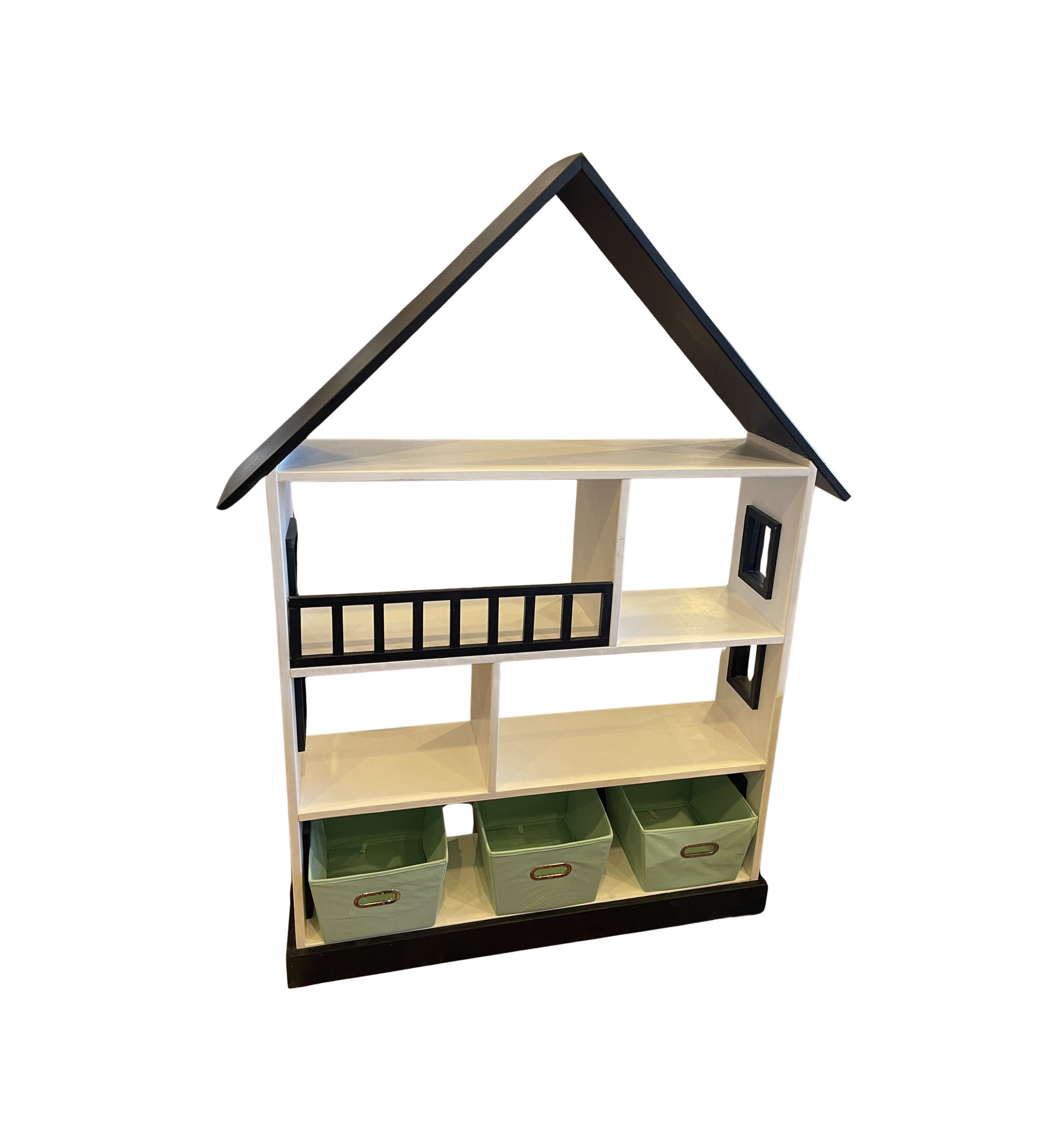 This adorable dollhouse bookcase has white shelves and black details including a roof, base, and windows. The bottom shelf of the piece includes three light green storage baskets. The bookshelf has six shelves in total that vary in size. The most notable part of this piece is its unique dollhouse shape with a tall pointed roof, and cut out windows.