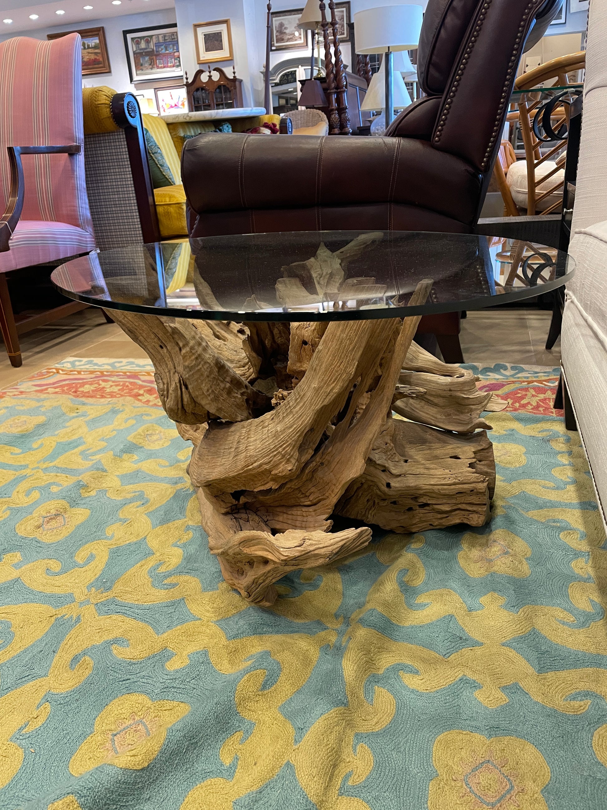 Beautiful drift wood coffee table with oval glass top. This stunning table features a unique freeform drift wood base that supports an oblong clear glass tabletop. The base design includes intertwining pieces of light toned drift wood in varying thicknesses. An eye catching piece with a rustic feel that's sure to elevate a space.
