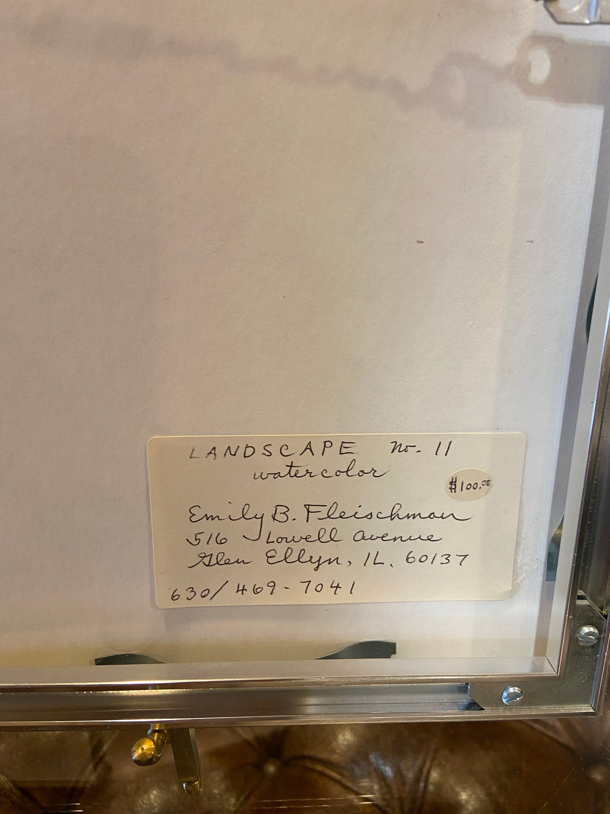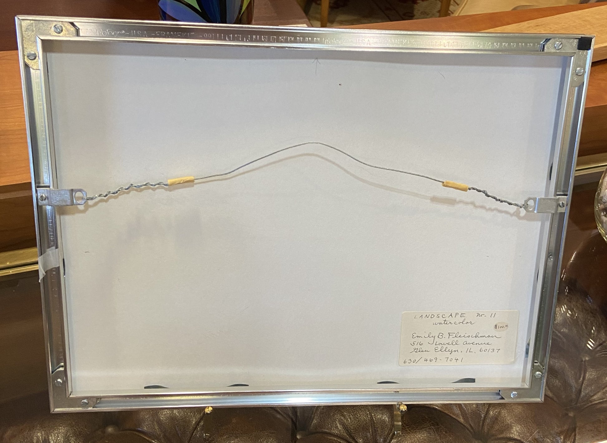 Abstract watercolor item by artist EB Fleishman titled Landscape No. 11. Features a colorful appearance with vibrant blues, golds, pinks, and oranges. Signed in the bottom left corner. Held in a silver, metal frame. Artist and painting information are present on the back of the frame.