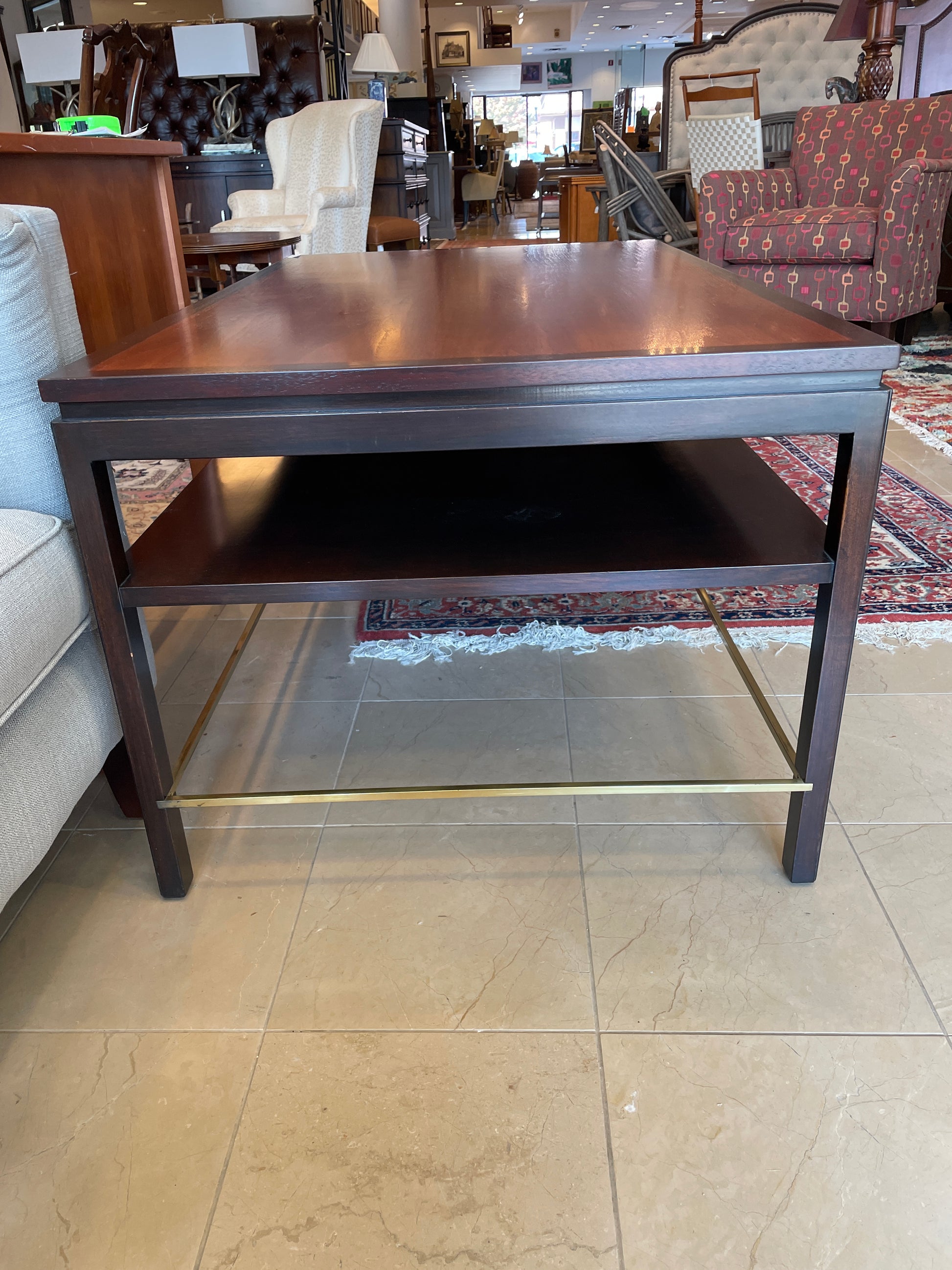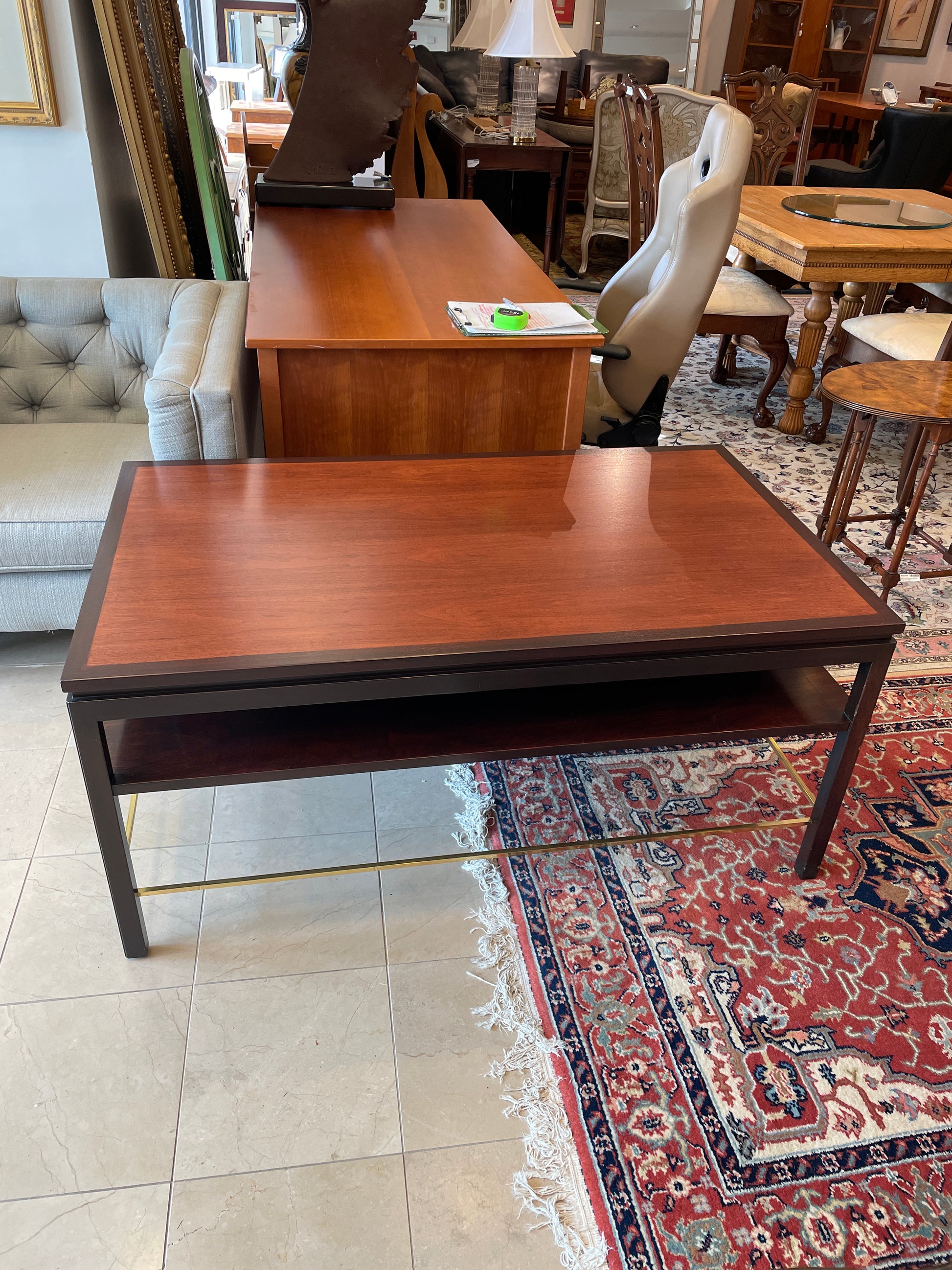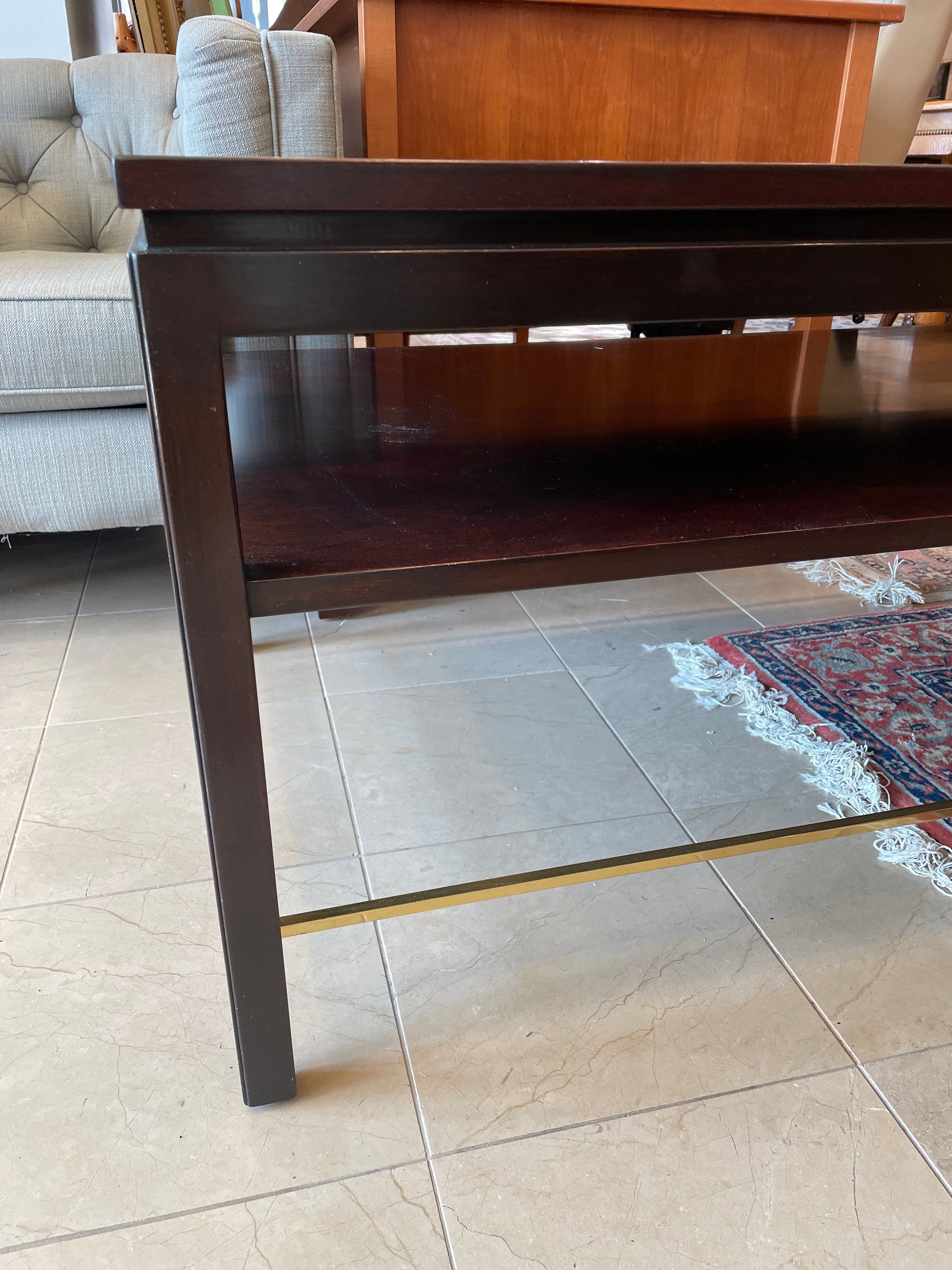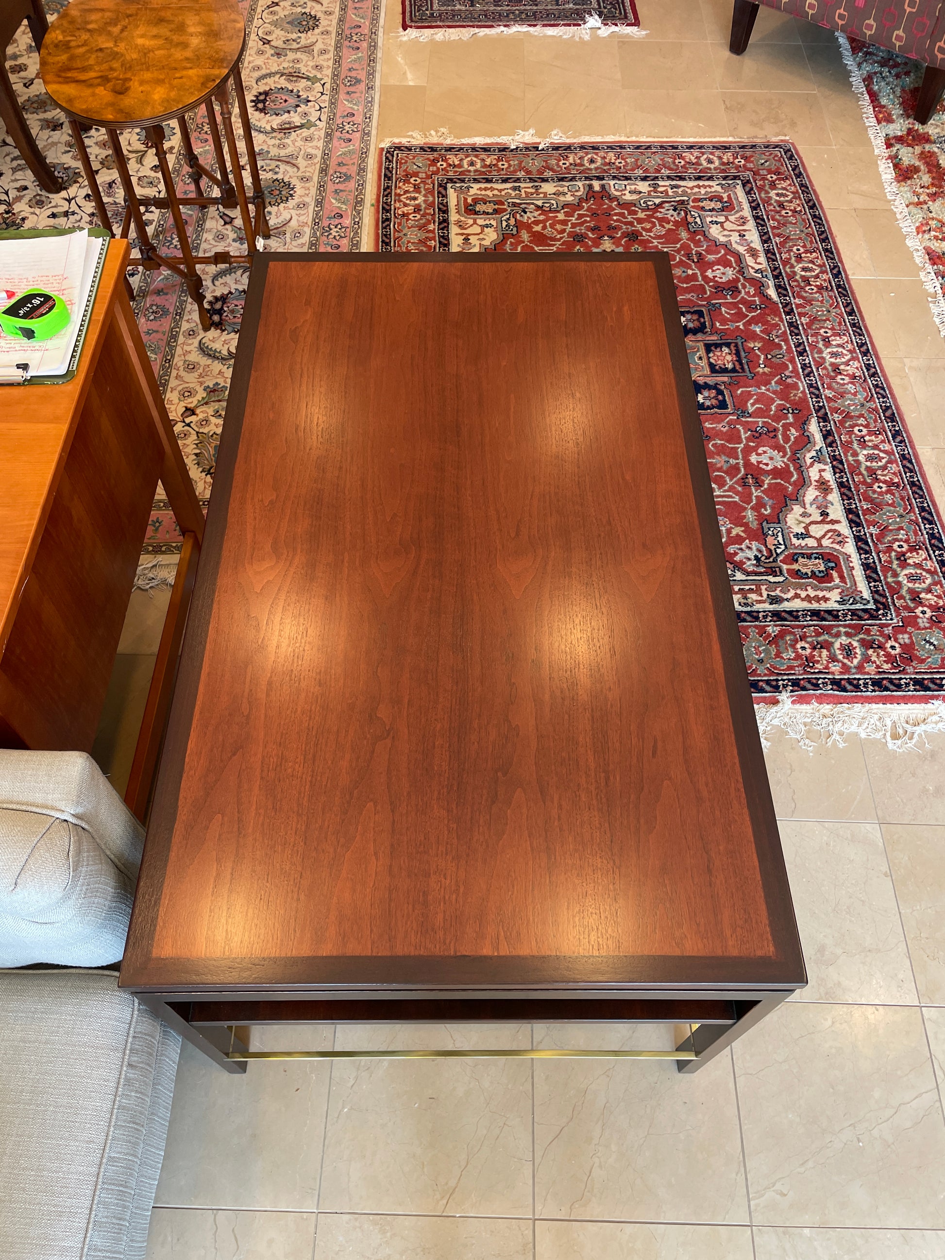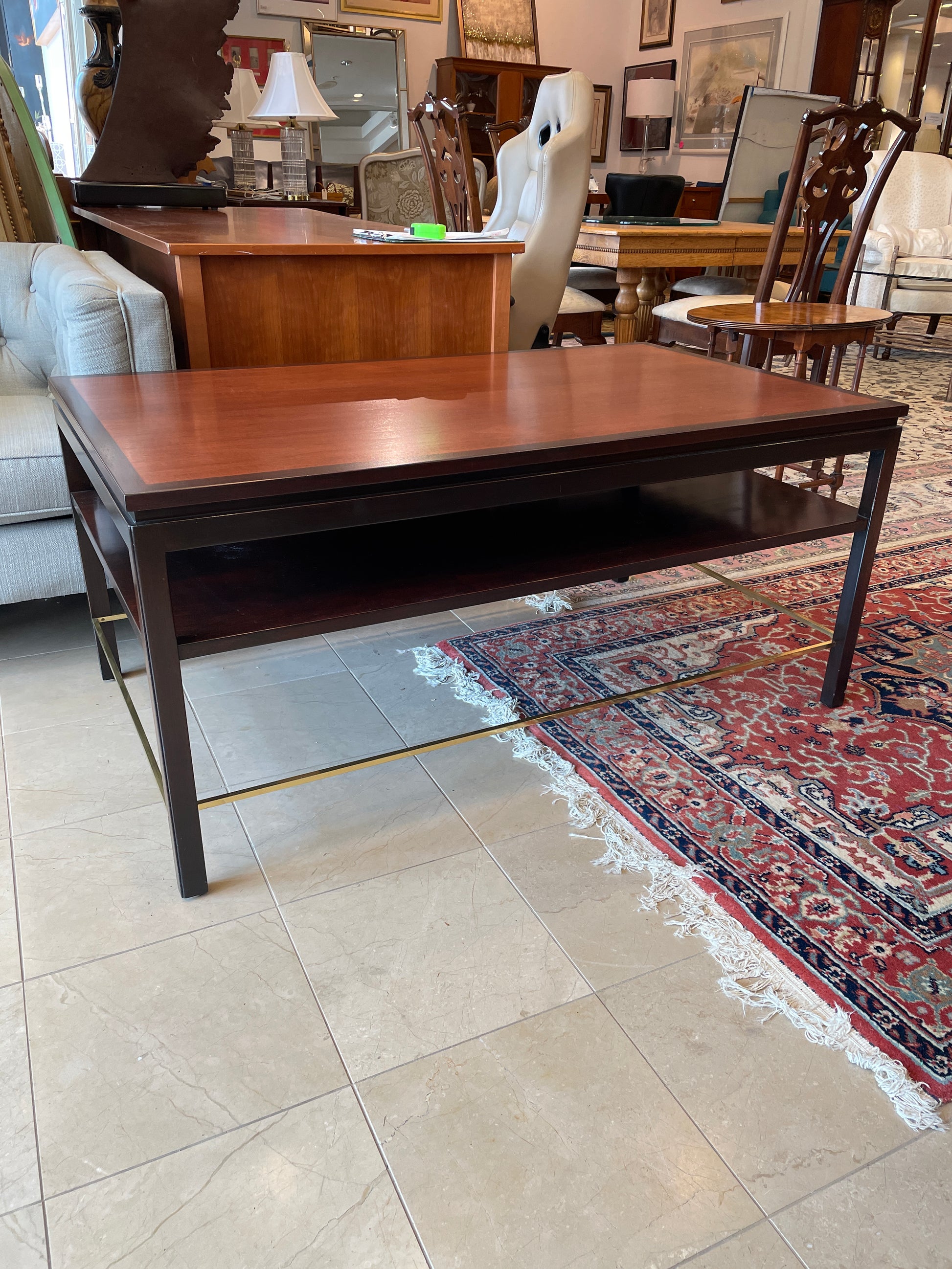 Edward Wormley coffee table for Dunbar. This beautiful rectangular walnut piece features a two-tier design. The base is accented with a brass box stretcher. The table sits on four squared legs. A sleek mid-century modern piece that's sure to add class to a room.