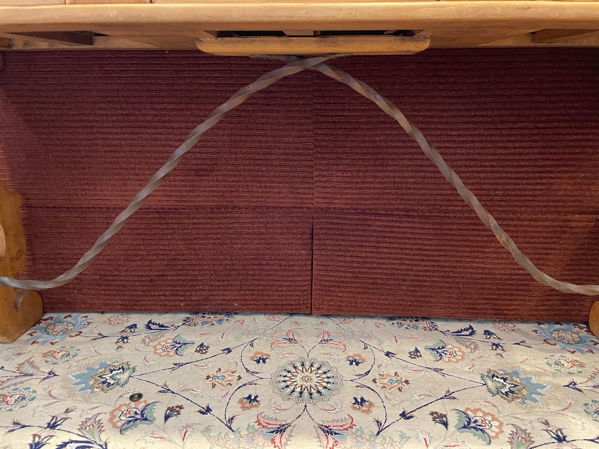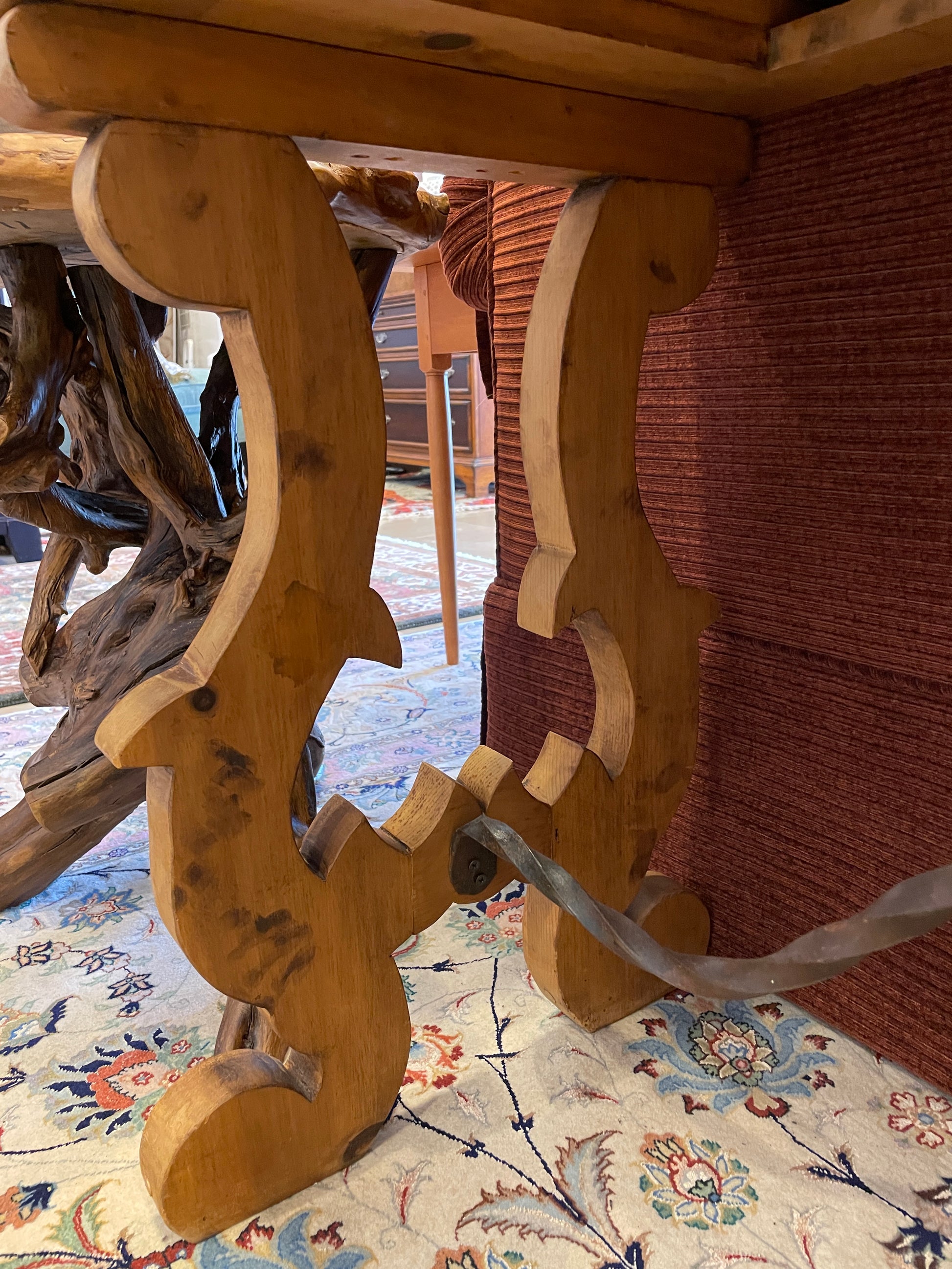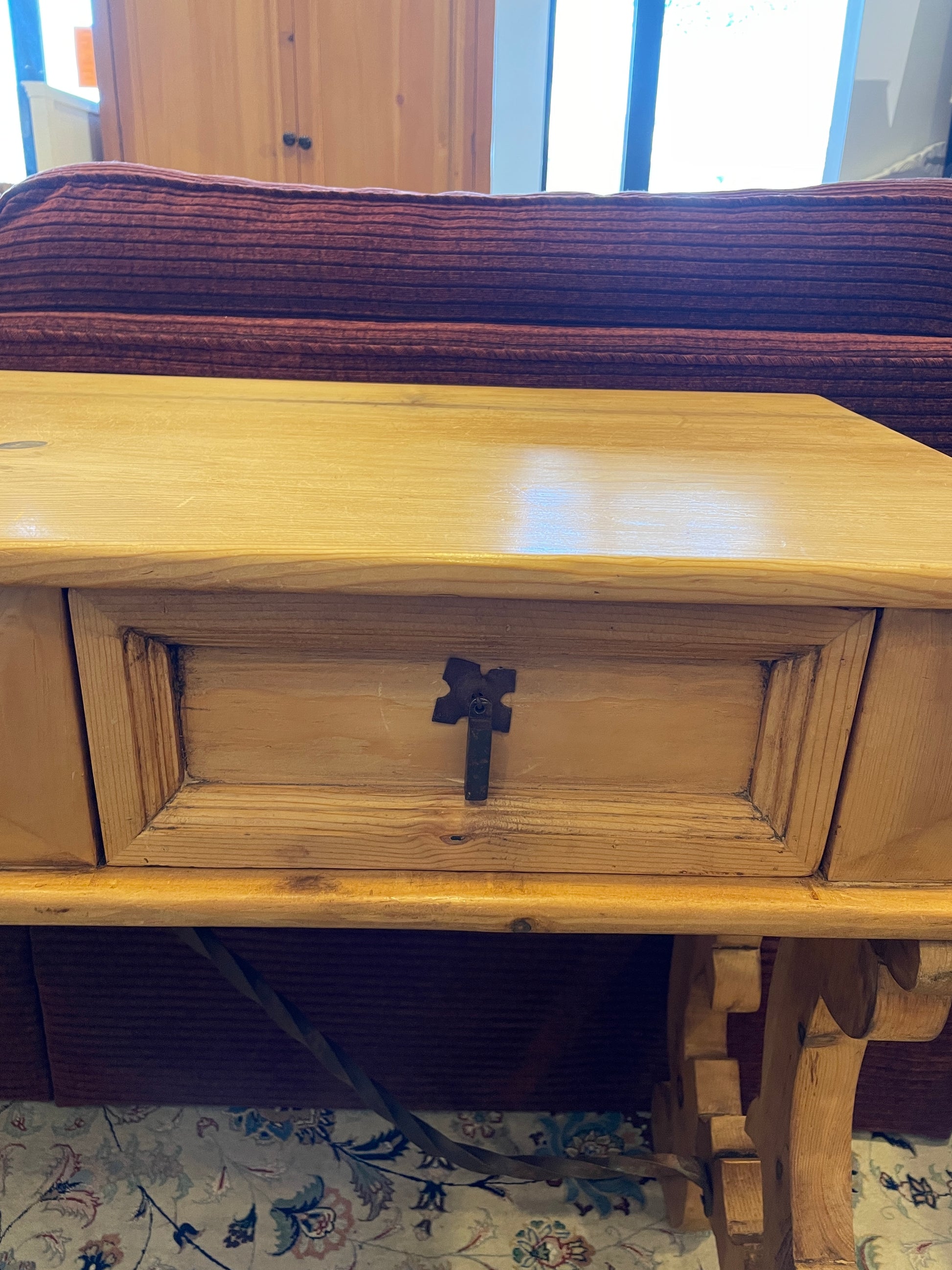 Pine sofa table by the brand El Poeton. Features curved legs and contains three drawers. A wrought metal stretcher twists beneath the sideboard. The legs are cut in a geometric, swirling shape. The finish of the sideboard is natural, displaying the beautiful light coloration of the table and the lovely woodgrain of the pine.