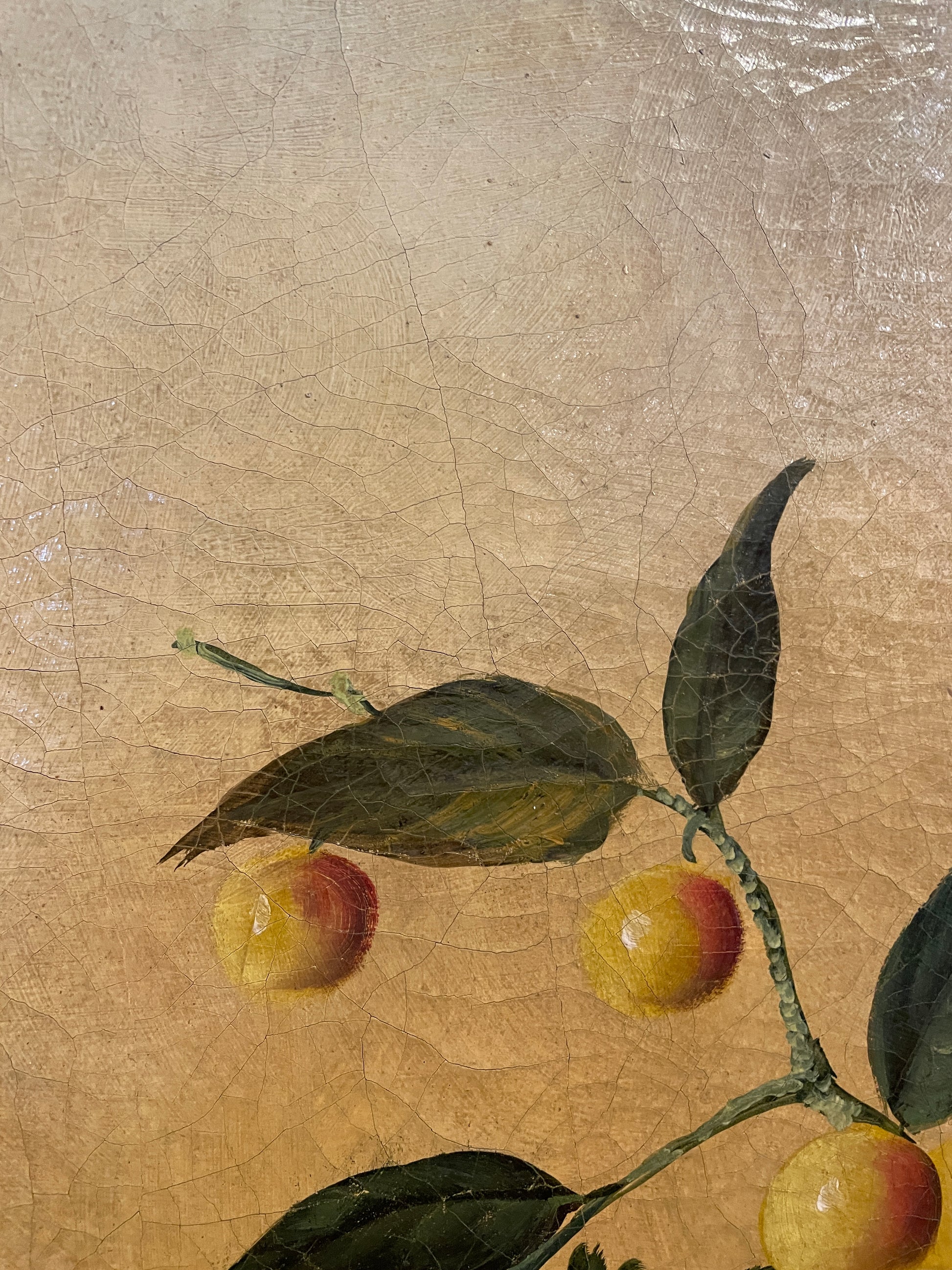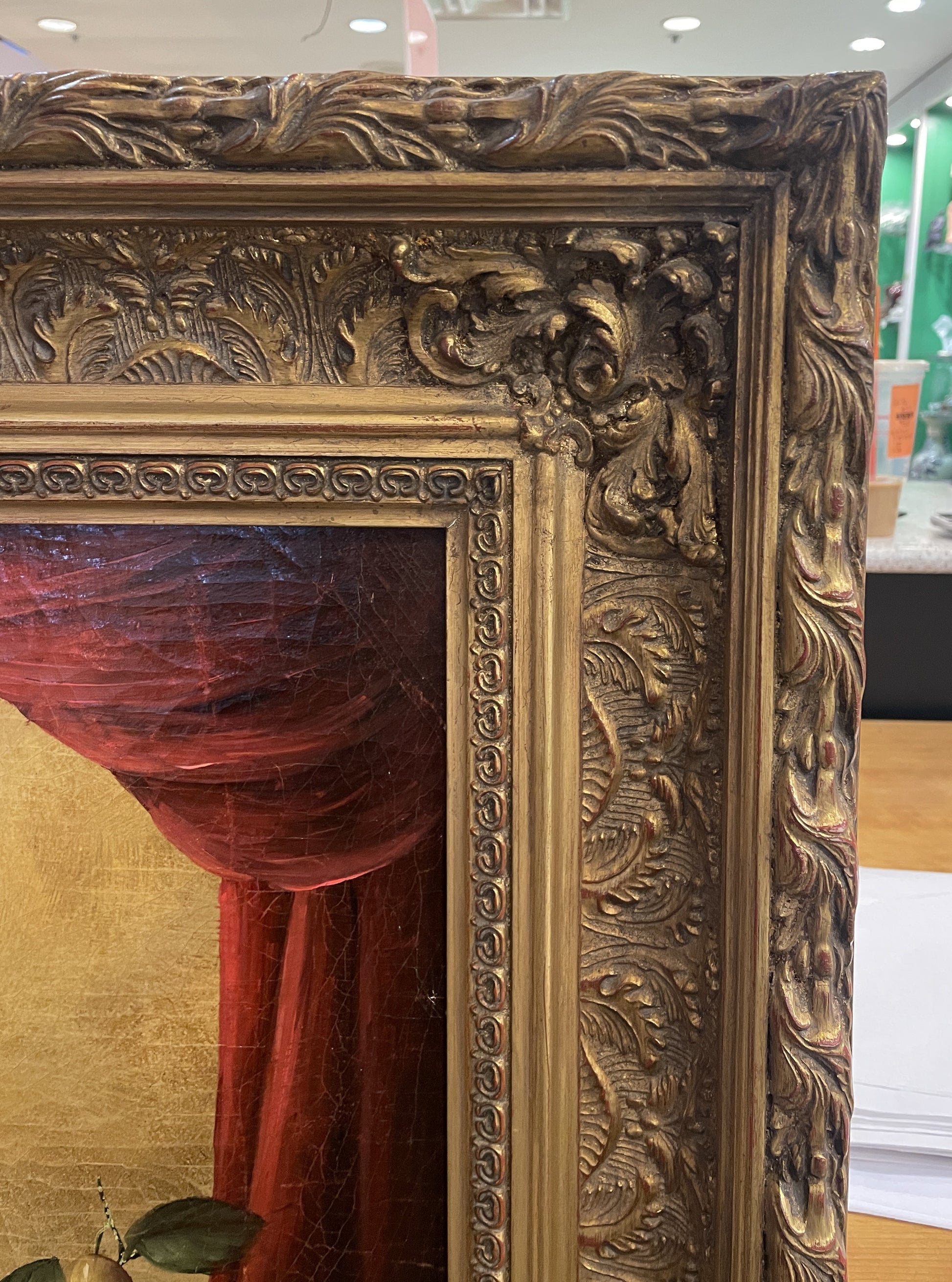 Edilmer Sanchez still life giclee on canvas. This beautiful still life piece depicts a bowl overflowing with fruit. The bowl sits in front of a red curtain on a beige background and atop a neutral table. The bowl itself is white with blue detailing, and a small jar with the same style is placed to its side. A variety of fruit fills the bowl including pears, plums, cherries, apples, grapes, and some foliage. The piece has crazing on its surface. It is held in an ornate carved gilt frame. A serene still life sure to class up any space.