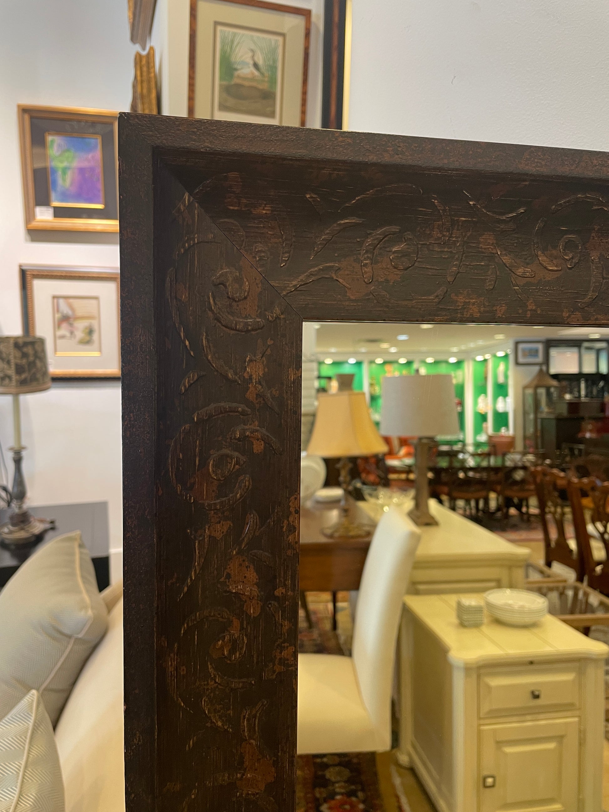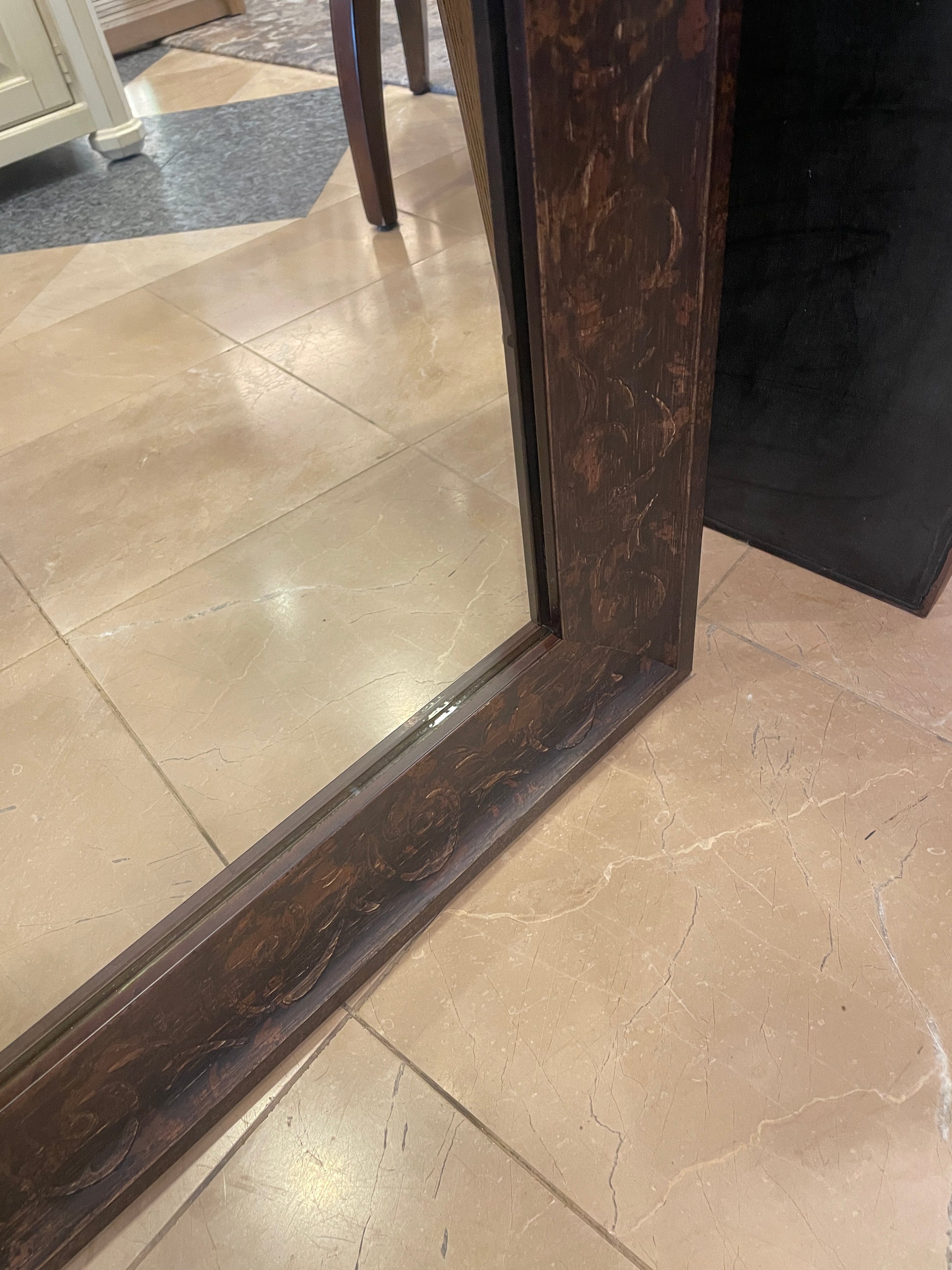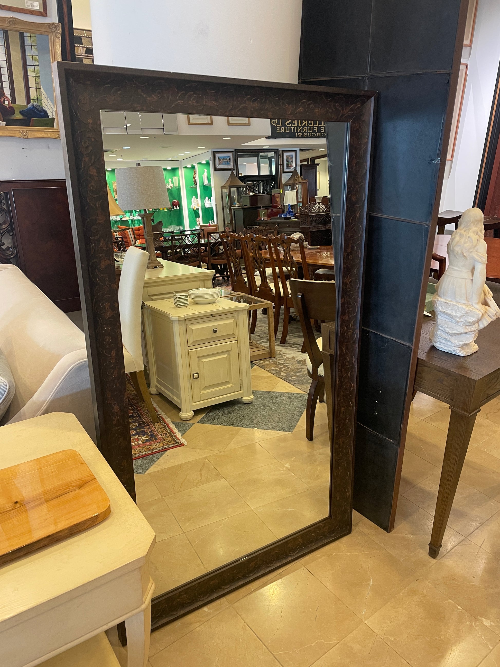 This full-length mirror features a rich, dark wood frame adorned with subtle floral embossing, adding a touch of classic elegance. Its generous size makes it ideal for leaning against a wall in a bedroom, dressing area, or hallway, while the decorative detailing brings understated sophistication to any space.
