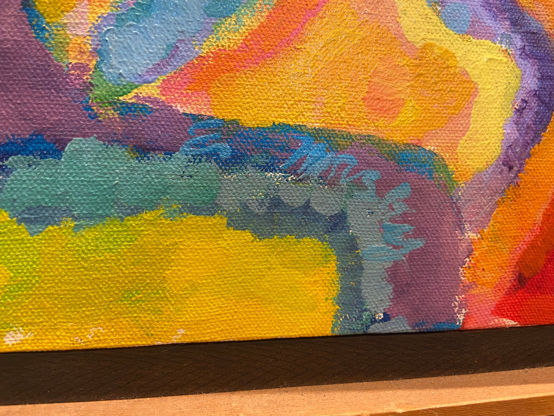 Acrylic on canvas by Emma Masley. Features an abstract composition consisting of bright and colorful shapes. The painting also includes a theme of stars and swirl patterns. Some shapes look like they make up a larger picture like a flower or a moon.