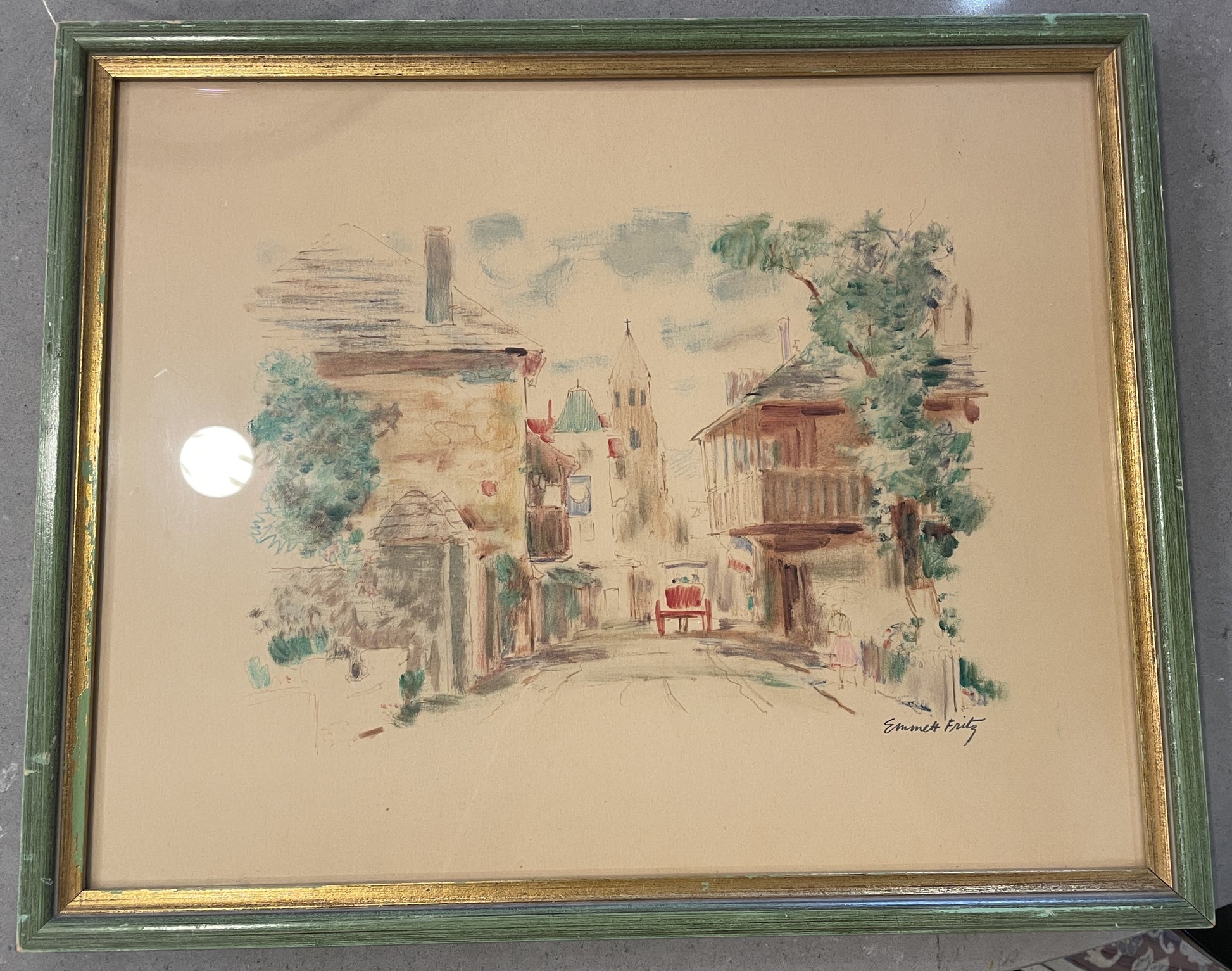 Emmett Fritz print of a watercolor painting of a street scene. Signed lower right. This beautiful painting is a unique combination of impressionism and realism. Light splotches of color are used to portray the scene of a quiet street with a carriage, a variety of different buildings, and foliage. The piece is set in a green frame with a gold inner border. A beautiful and elegant addition to any space.
