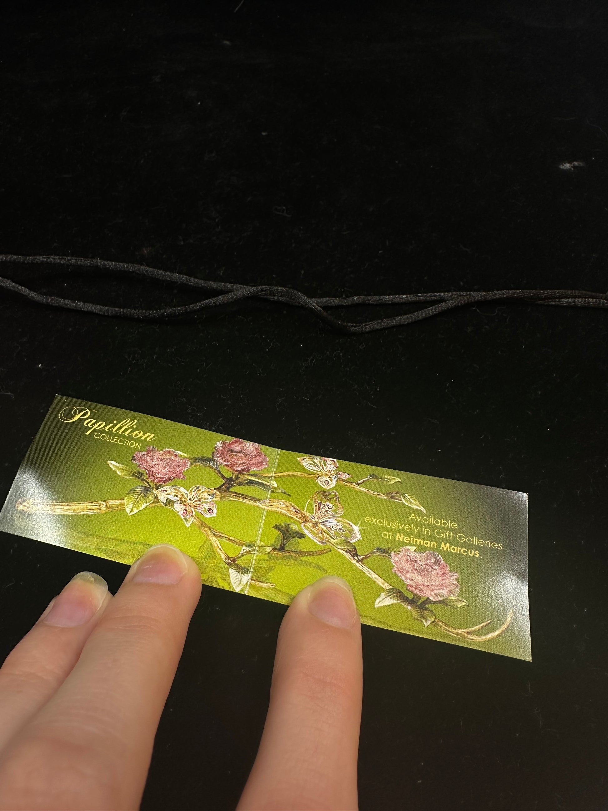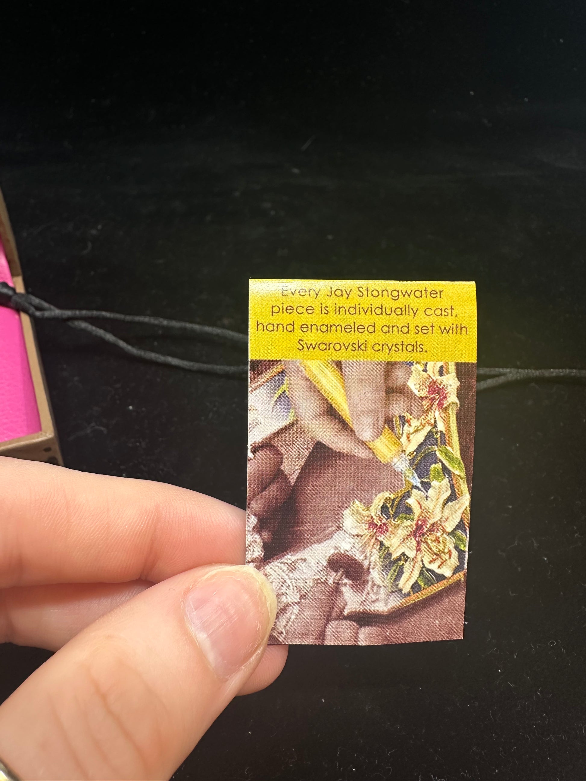 Jay Strongwater butterfly pendant. Features pink, green, and purple tones with matching crystals embedded into the body. From the Papillon Collection sold exclusively at Neiman Marcus. Hand enameled and set with Swarovski crystals. Held in the original box with original card.