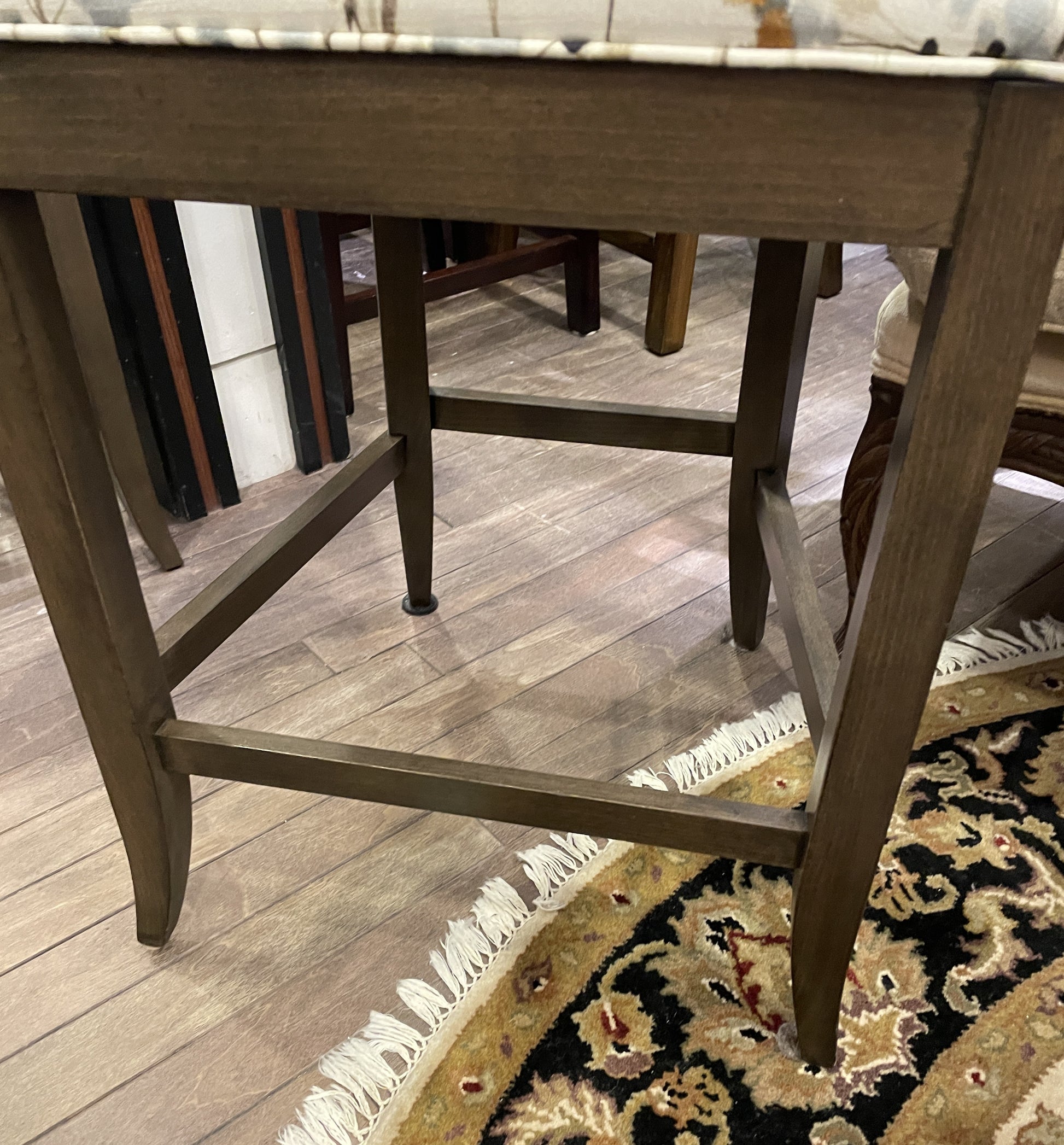 Ethan Allen barstool. This beautiful stool sits on a medium toned wooden frame with a box stretcher. The cushioned seat and backrest have charming upholstered seats in white with abstract splashes and streaks of black, gray, and gold. A perfect modern addition to any space.