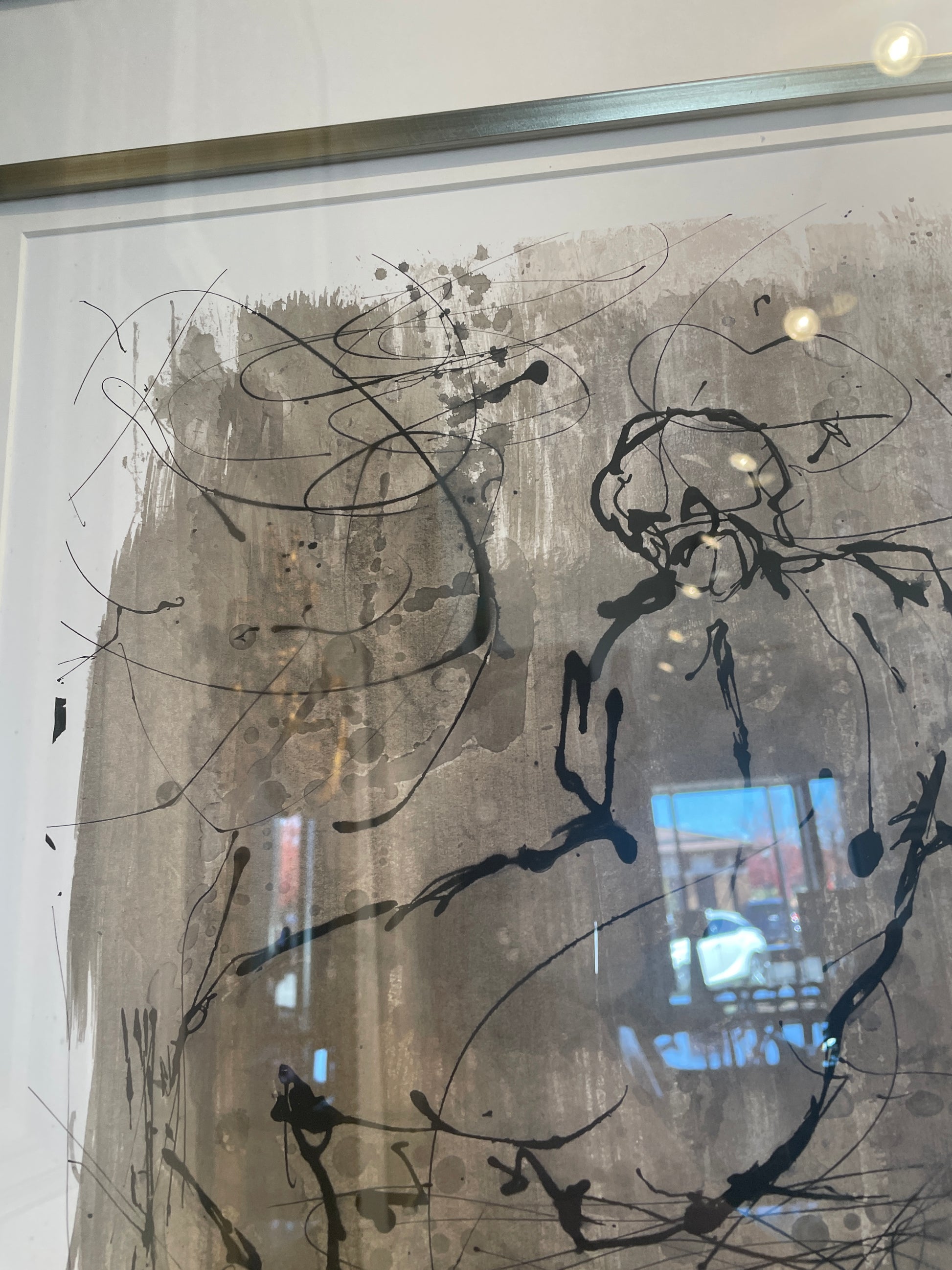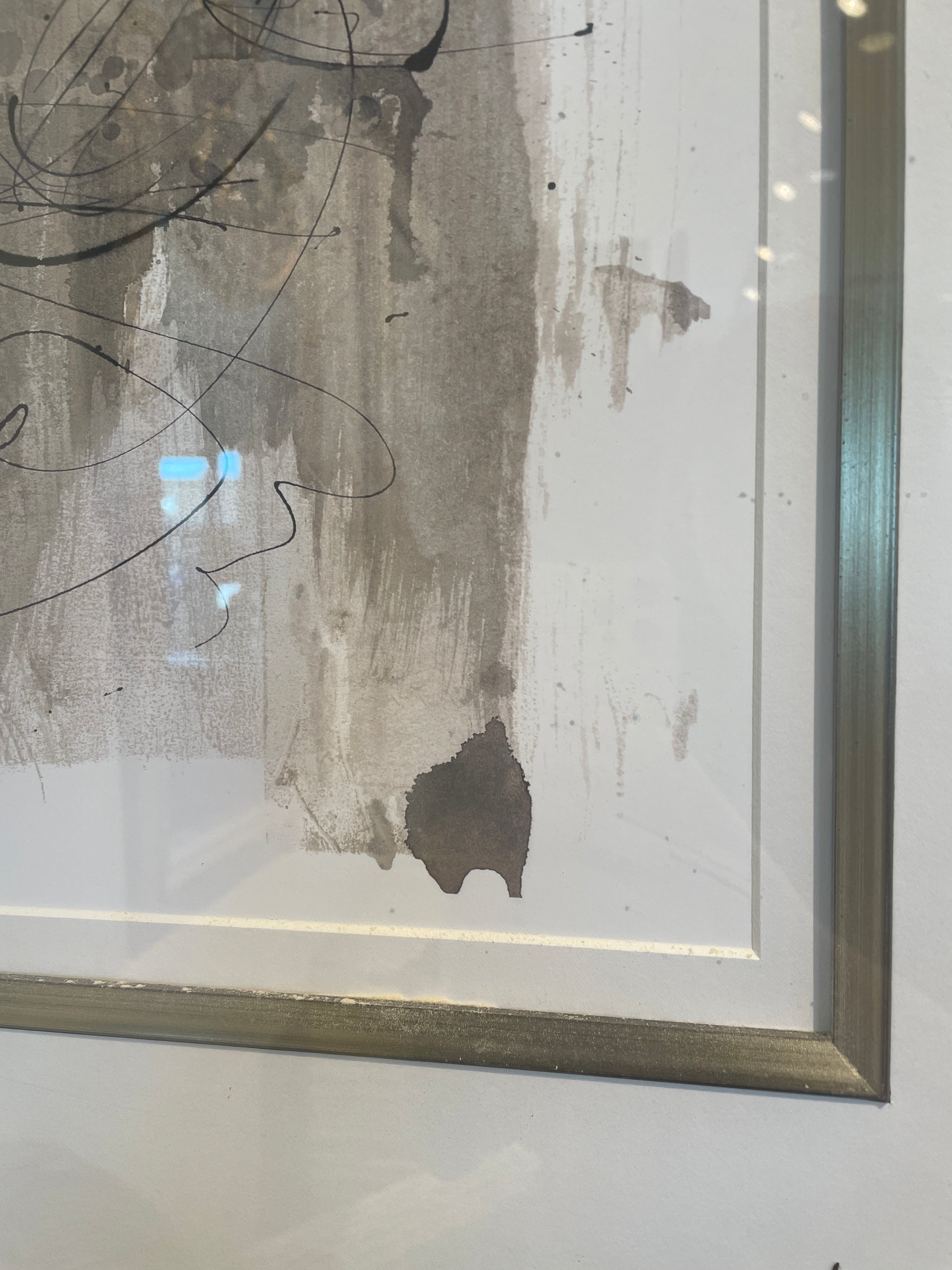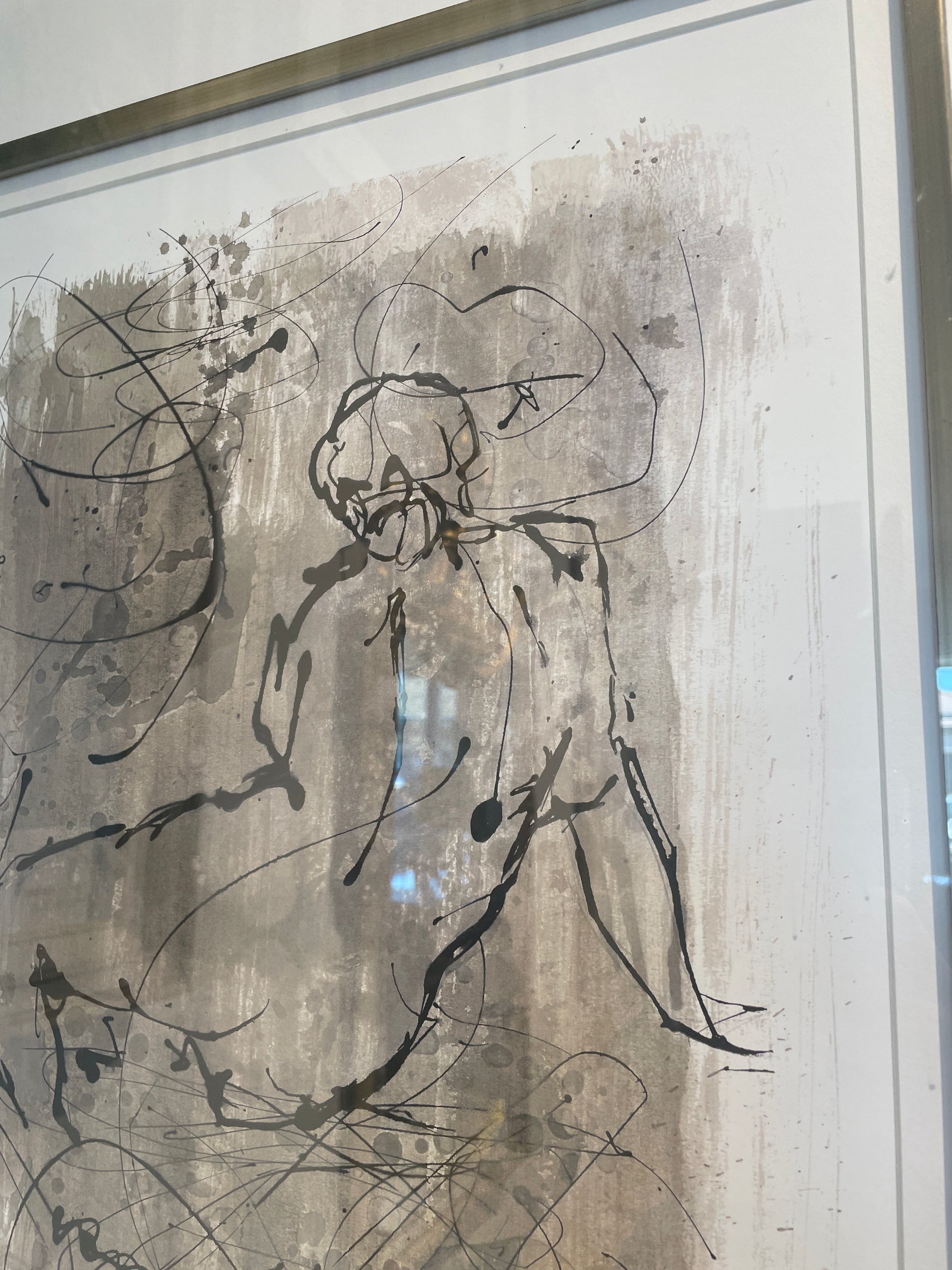 Ethan Allen contour figure. This beautiful piece in shades of gray and black depicts a contour figure of a woman surrounded with abstract details. The details include spots, streaks, stripes, and splashes of gray and black. The work is set on a white mat with gold borders and held in a black wooden frame. A beautiful piece that would complement any space perfectly with its neutral color palette and timeless design.