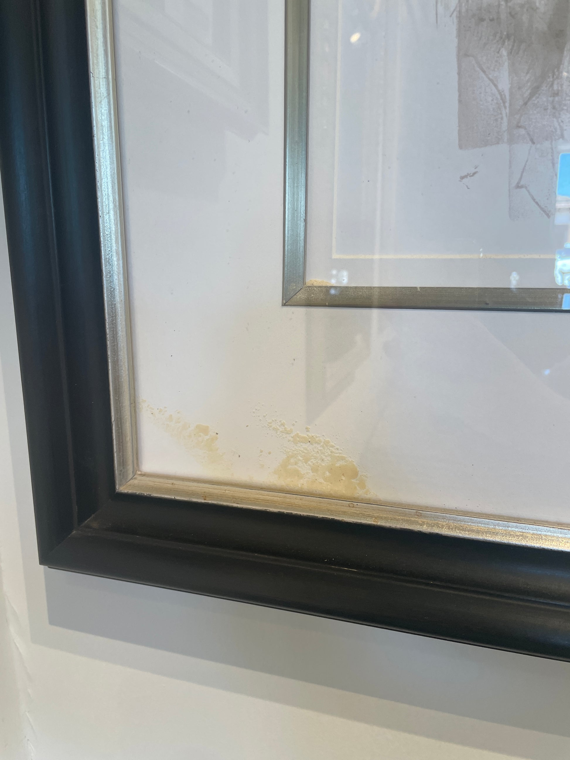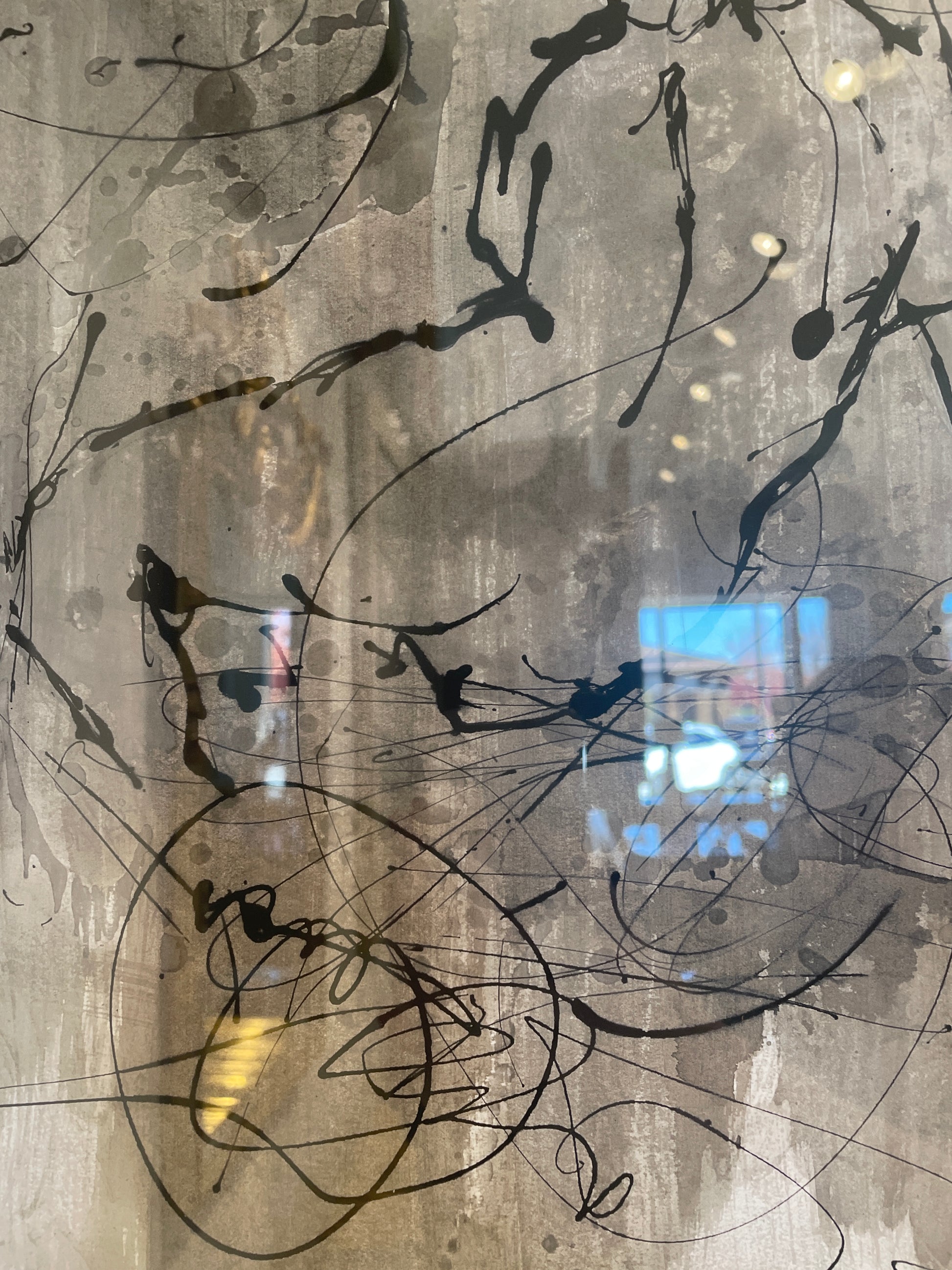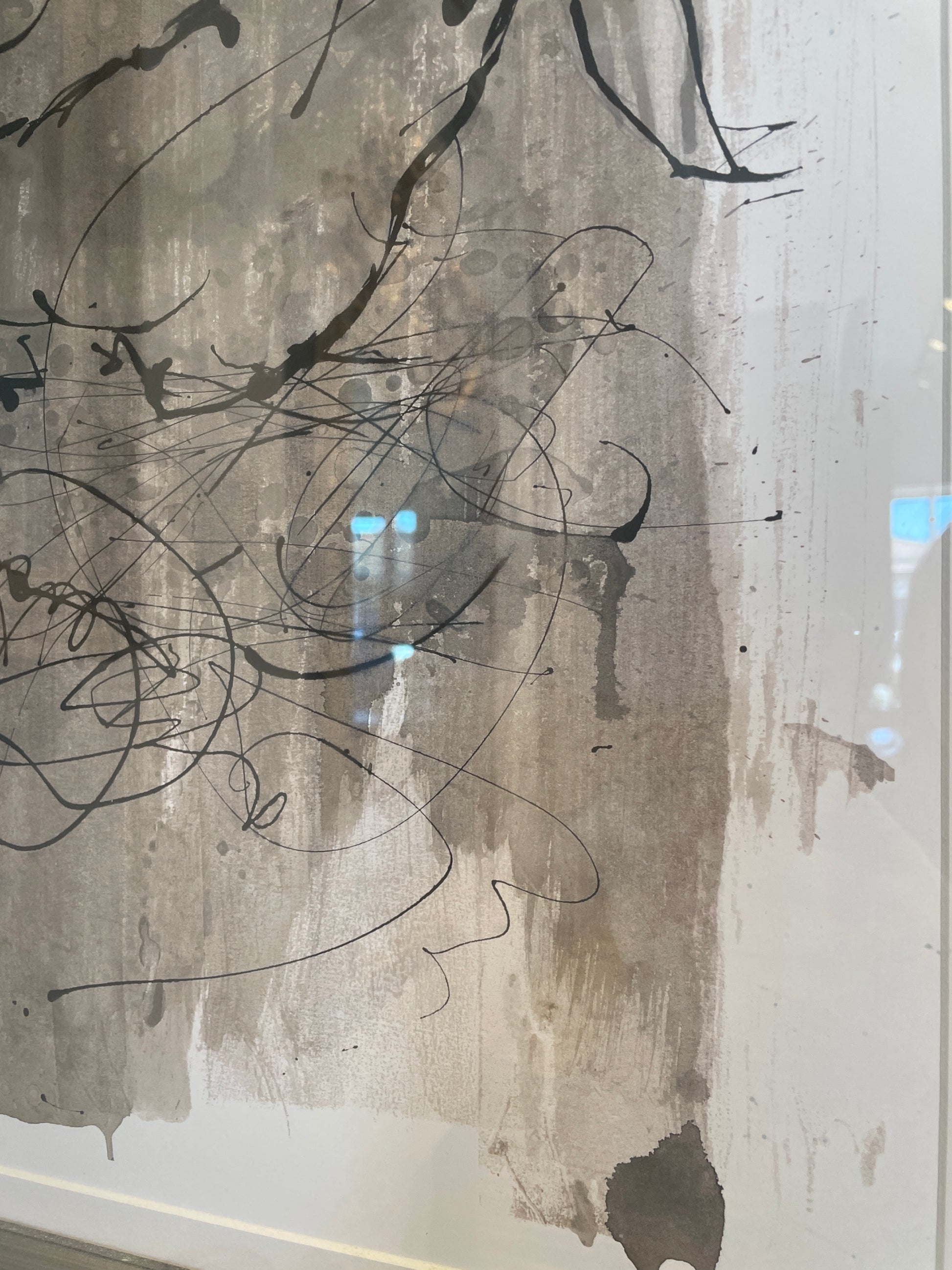 Ethan Allen contour figure. This beautiful piece in shades of gray and black depicts a contour figure of a woman surrounded with abstract details. The details include spots, streaks, stripes, and splashes of gray and black. The work is set on a white mat with gold borders and held in a black wooden frame. A beautiful piece that would complement any space perfectly with its neutral color palette and timeless design.