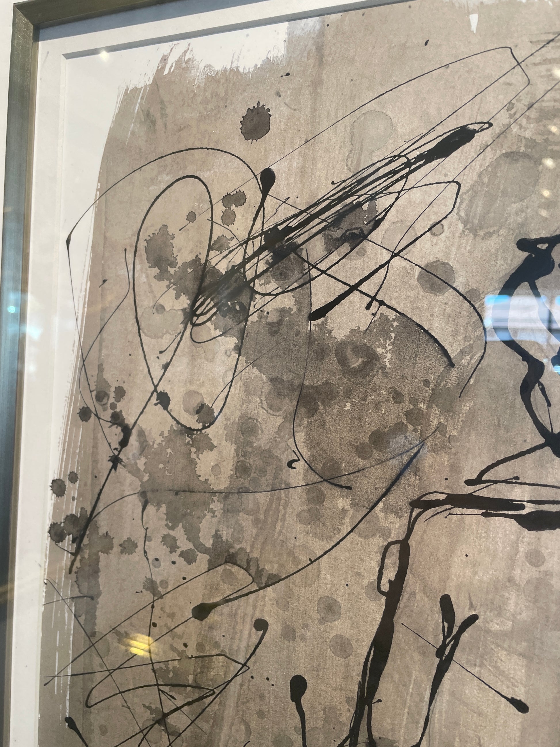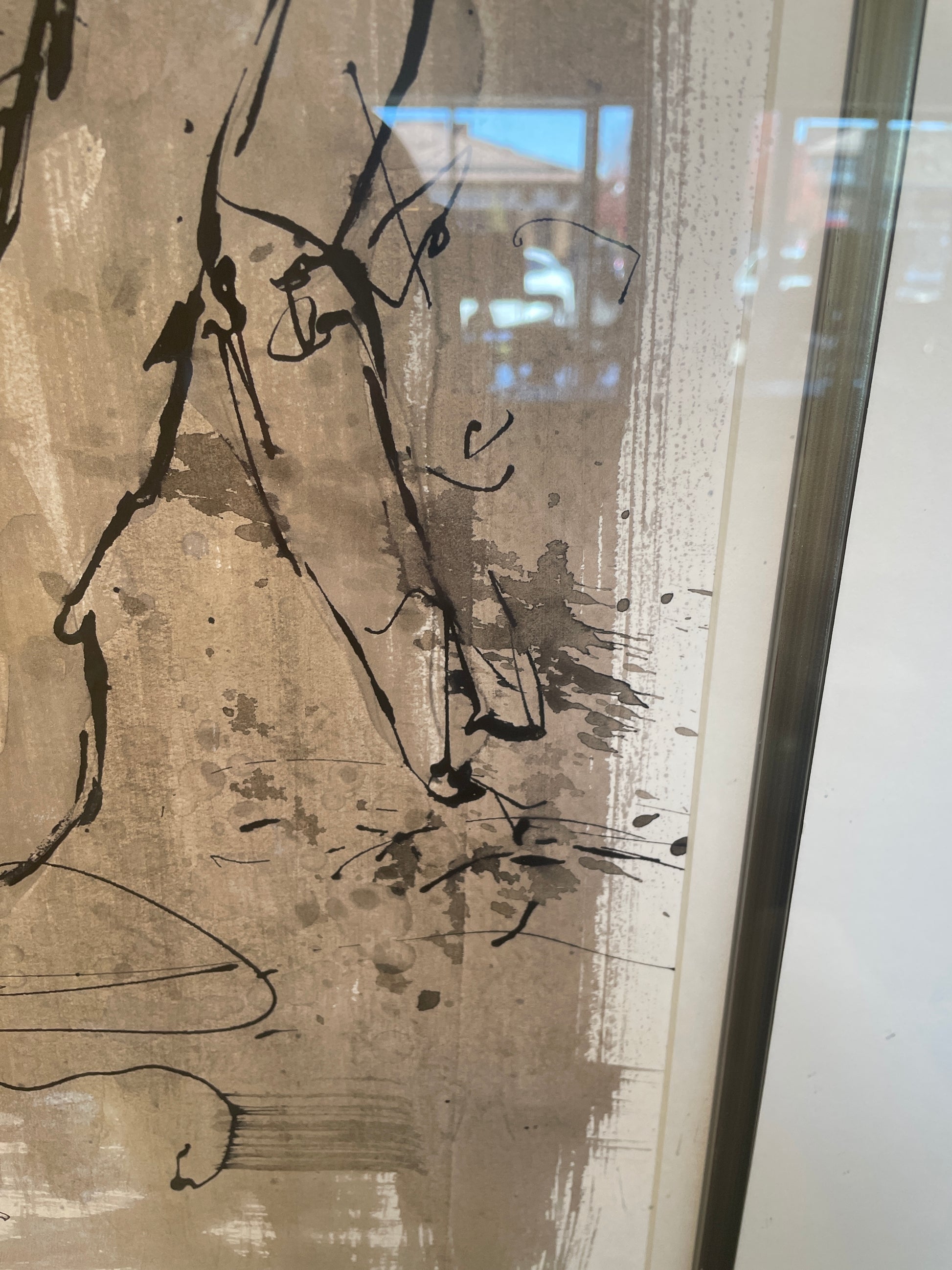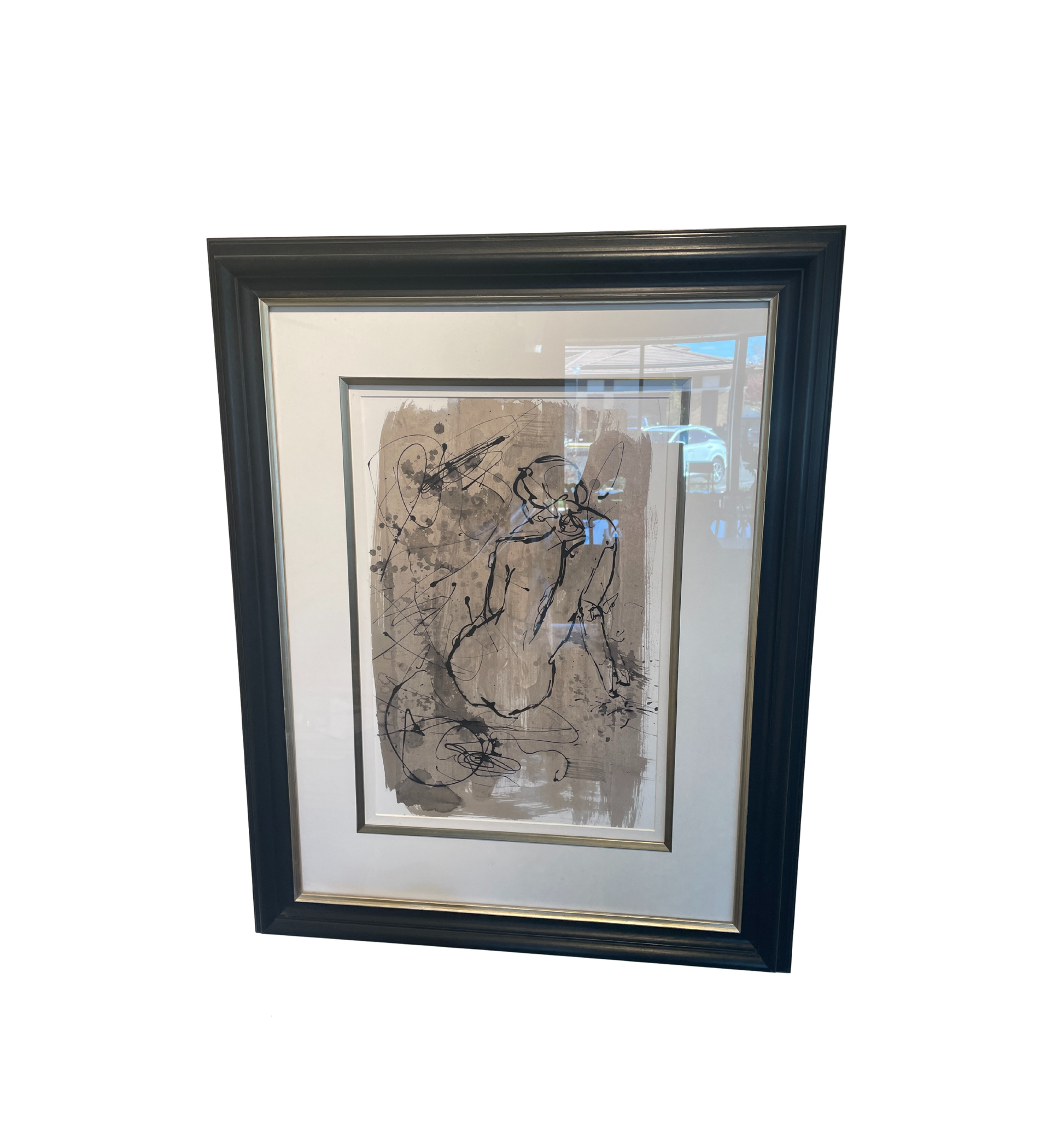 Ethan Allen contour figure. This beautiful piece in shades of gray and black depicts a contour figure of a woman surrounded with abstract details. The details include spots, streaks, stripes, and splashes of gray and black. The work is set on a white mat with gold borders and held in a black wooden frame. A beautiful piece that would complement any space perfectly with its neutral color palette and timeless design.