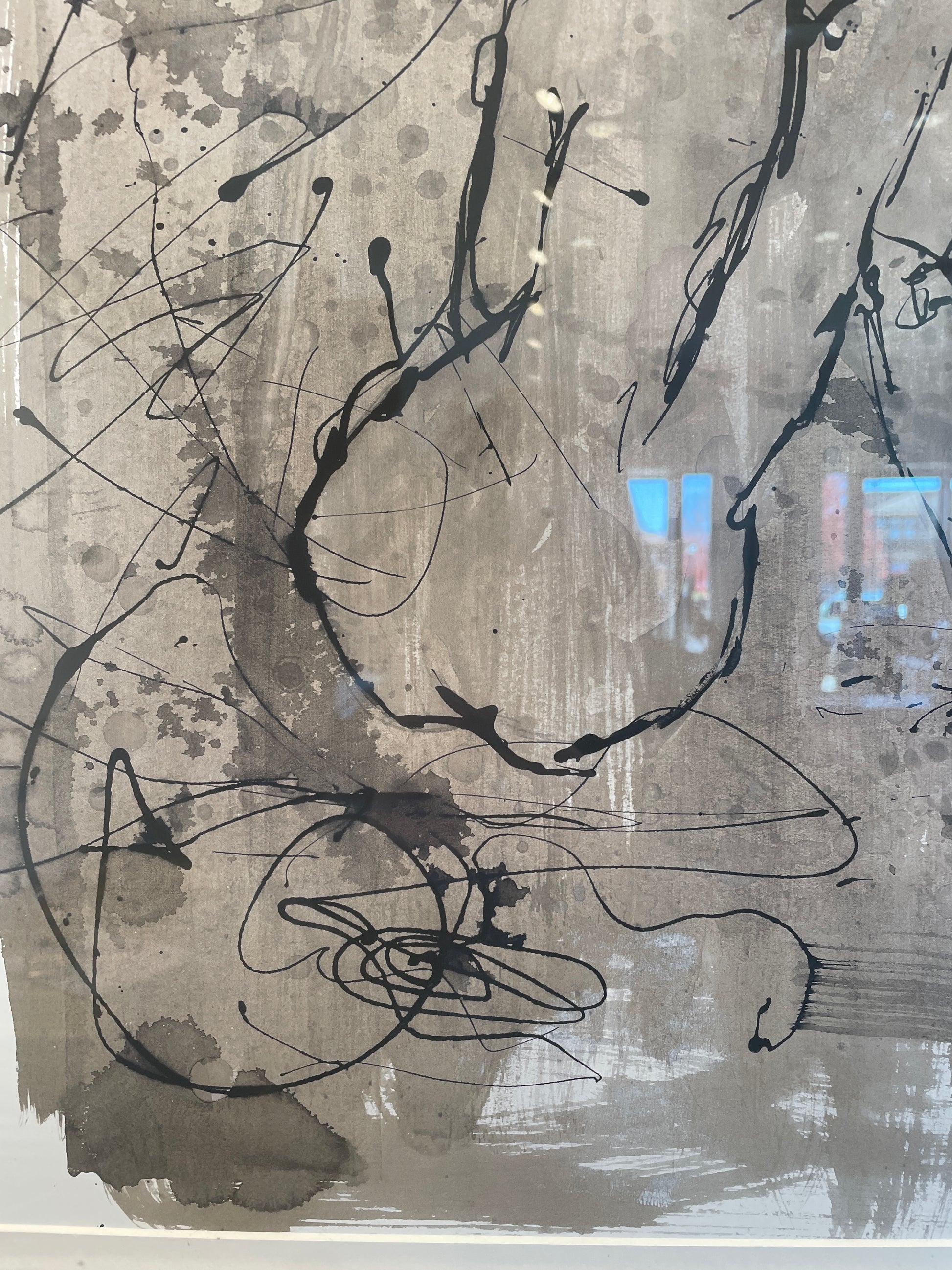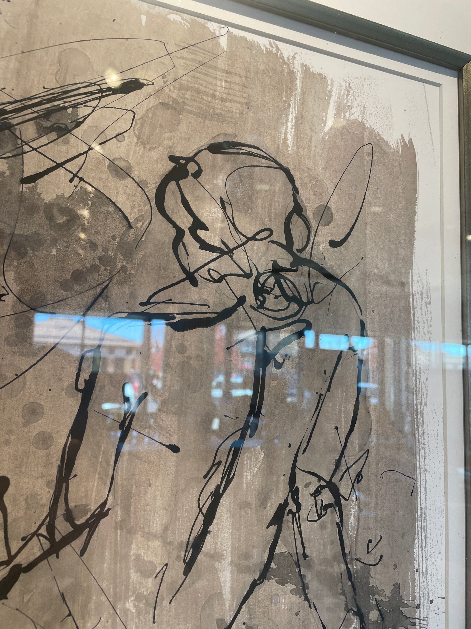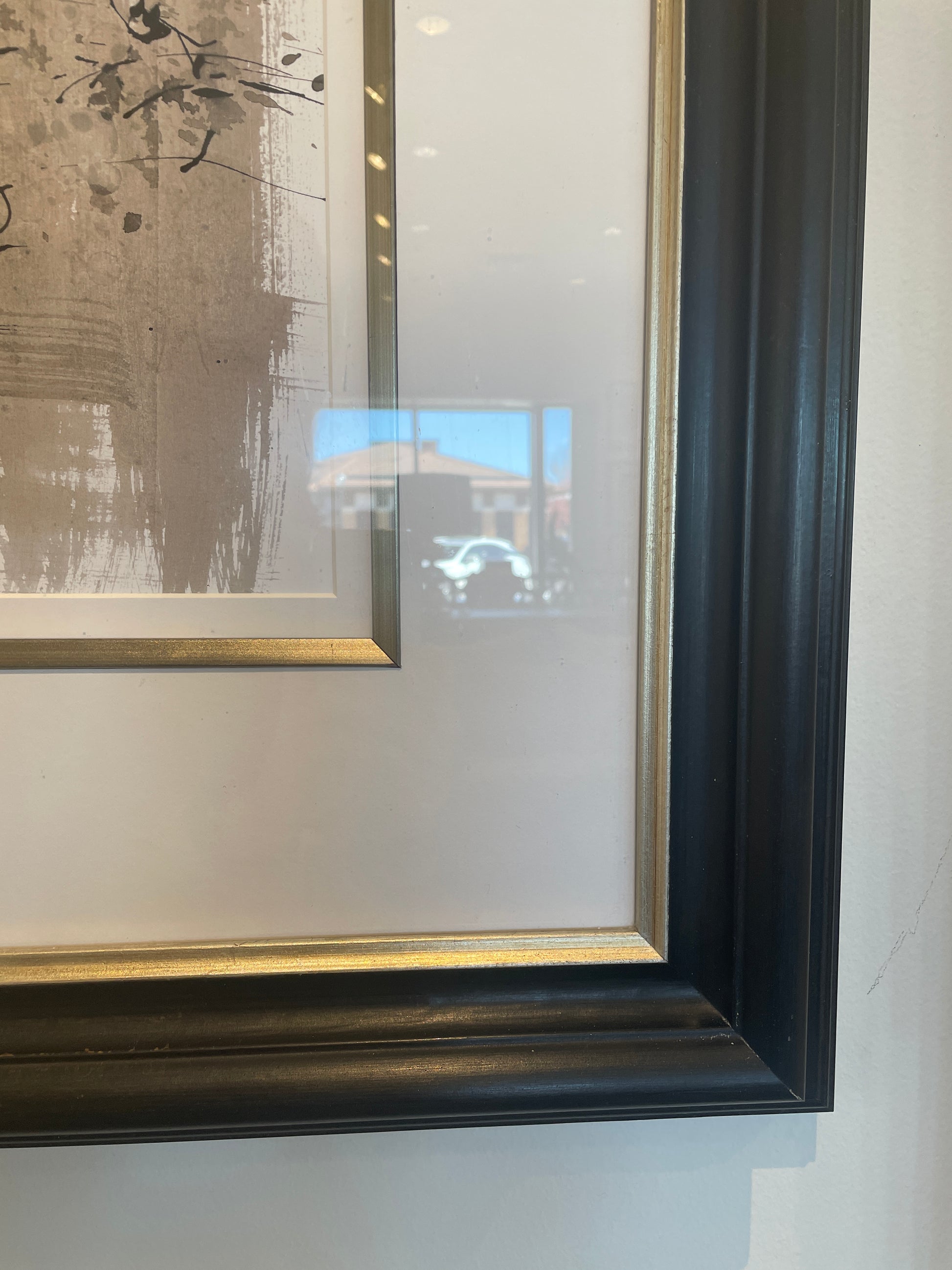 Ethan Allen contour figure. This beautiful piece in shades of gray and black depicts a contour figure of a woman surrounded with abstract details. The details include spots, streaks, stripes, and splashes of gray and black. The work is set on a white mat with gold borders and held in a black wooden frame. A beautiful piece that would complement any space perfectly with its neutral color palette and timeless design.