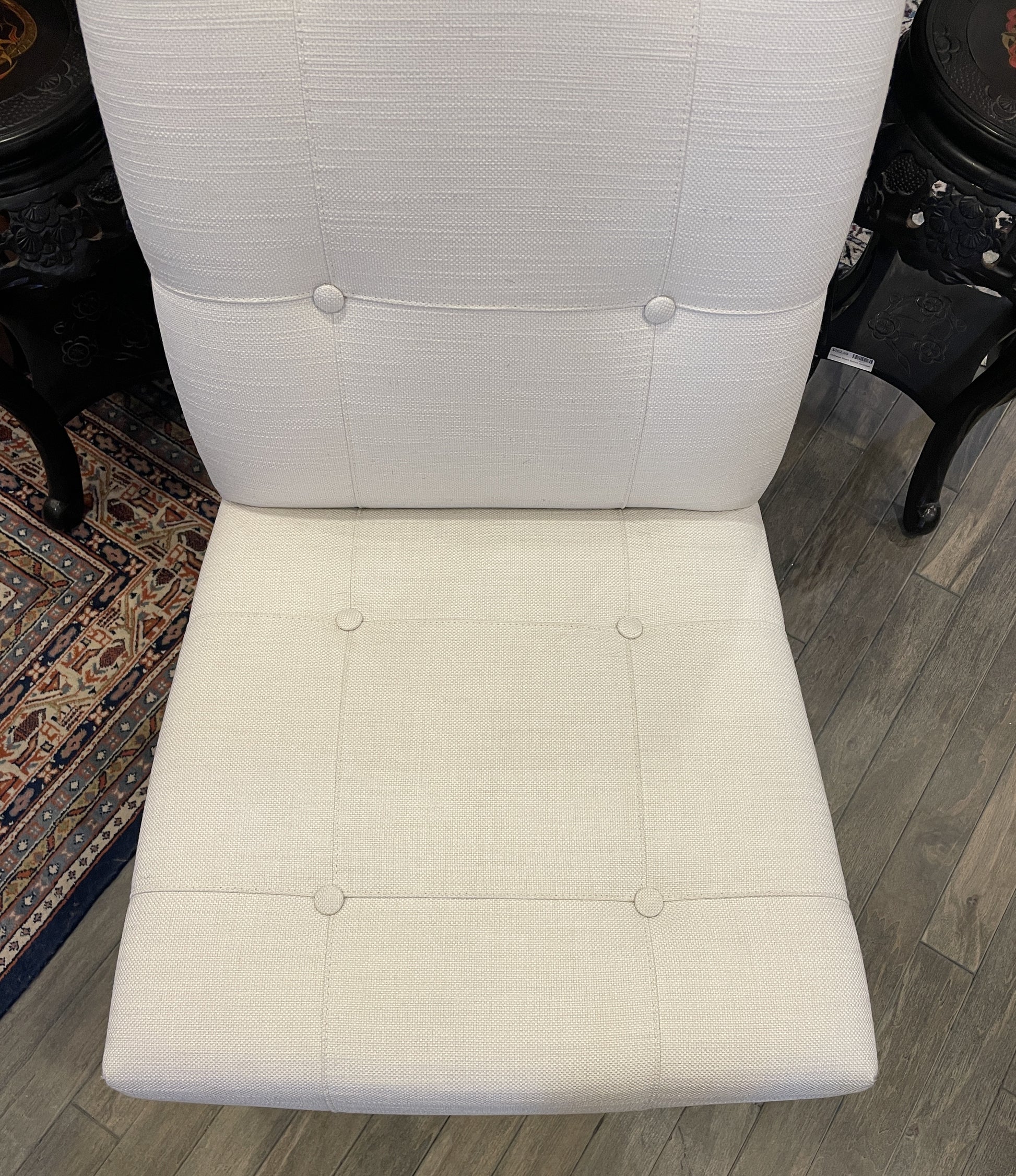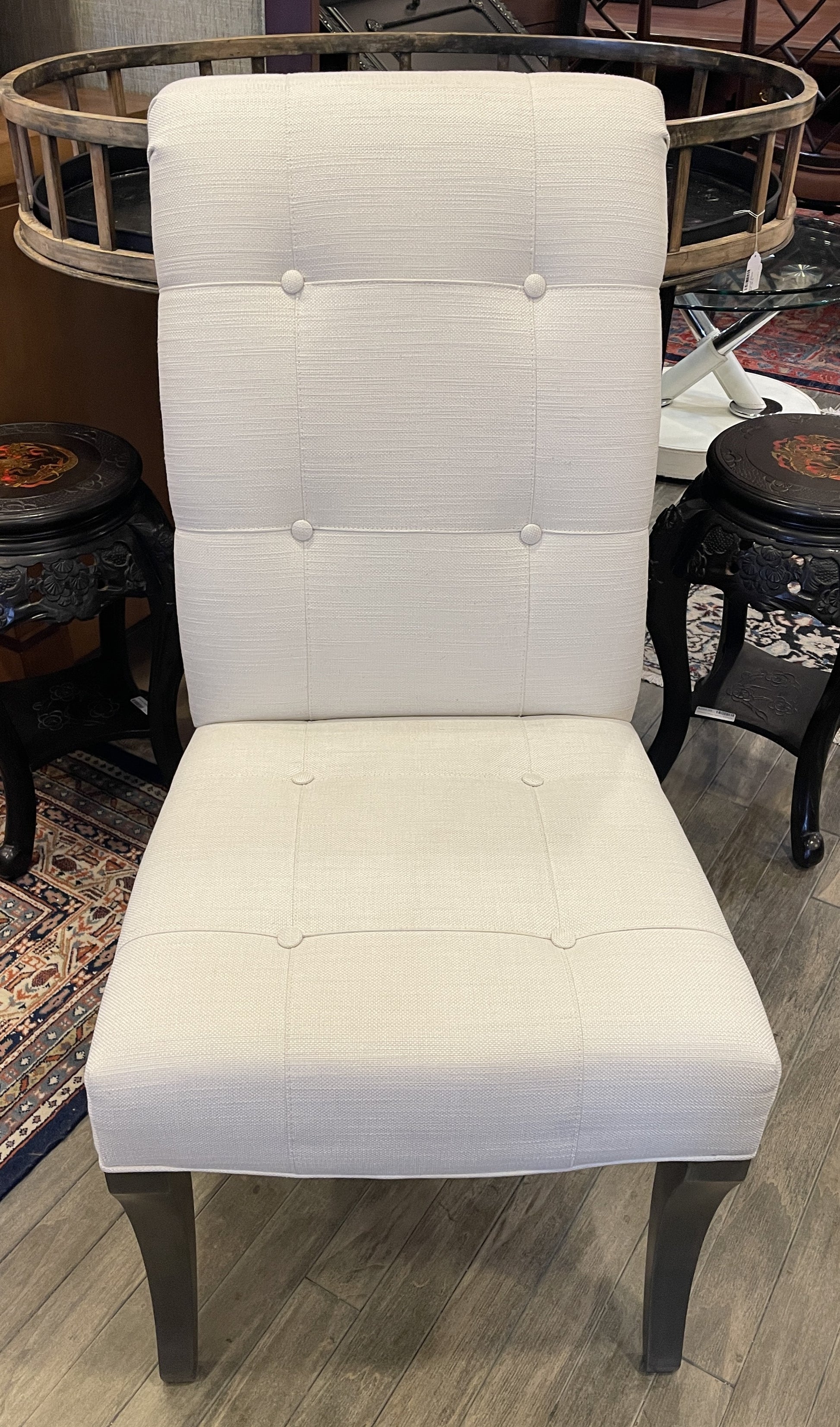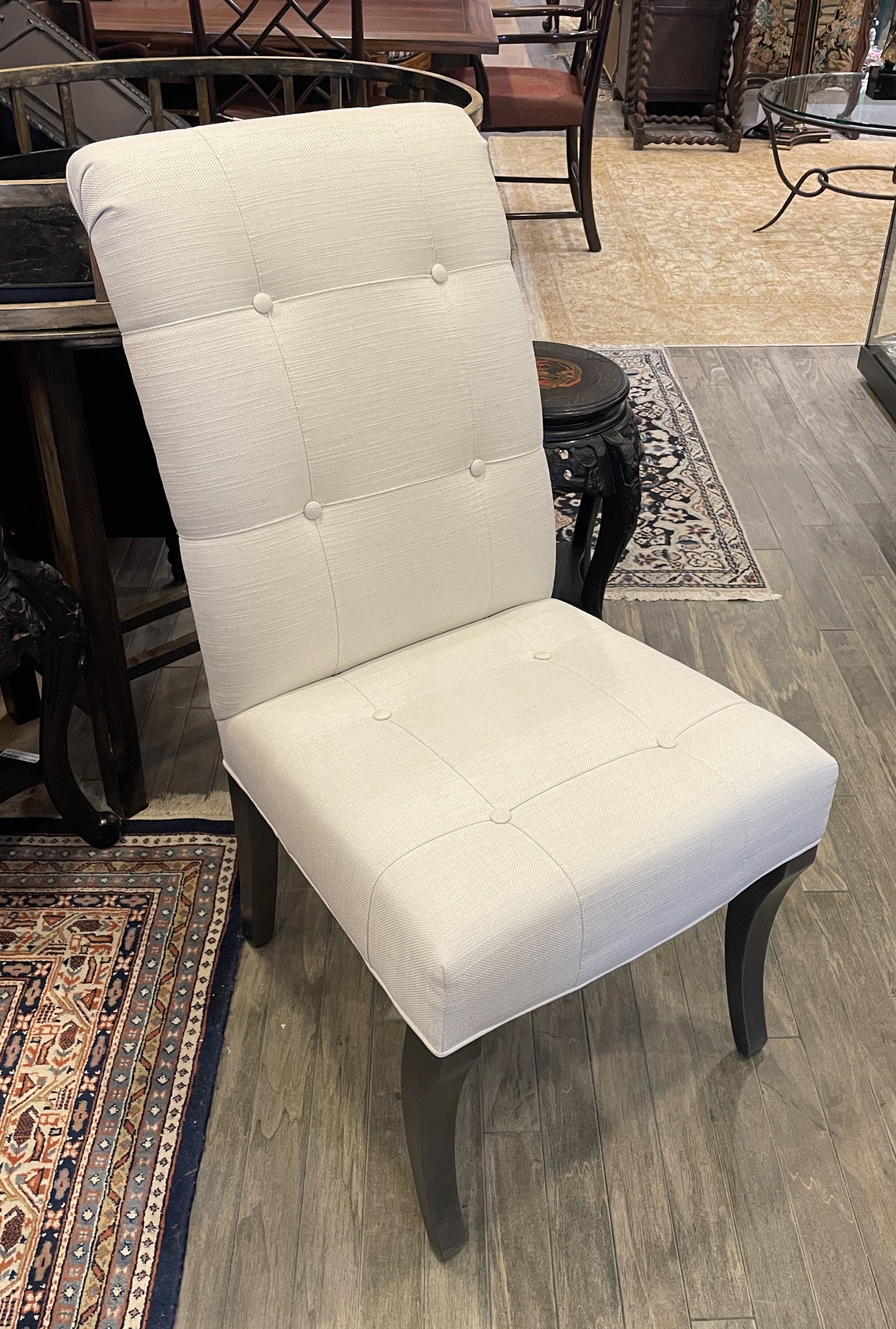 Ethan Allen Dayton side chair, tufted. This beautiful chair features button tufted white upholstery on a cushioned seat with a high back rest. The chair sits on four dark toned wooden legs, the front two of which are sabered. The top side corners of the backrest are pleated for added design. A sleek chair that's sure to elevate a space.
