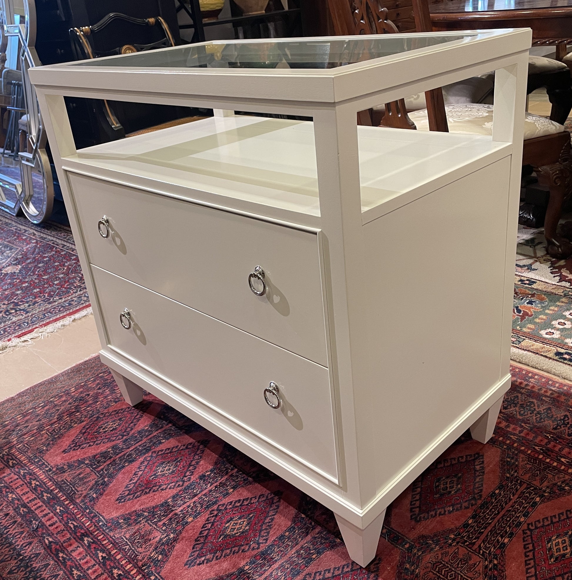 Ethan Allen Heston nightstand in white. This elegant nightstand is made of oak and has a chic glass top. Two drawers sit in the lower portion of the nightstand, each of which has two silver circular drawer pulls. The piece sits on short tapered feet. The top of the nightstand is elevated above the rest of the piece from the four corners. The frame extends up to hold the tempered glass top. A beautiful nightstand full of character and charm.