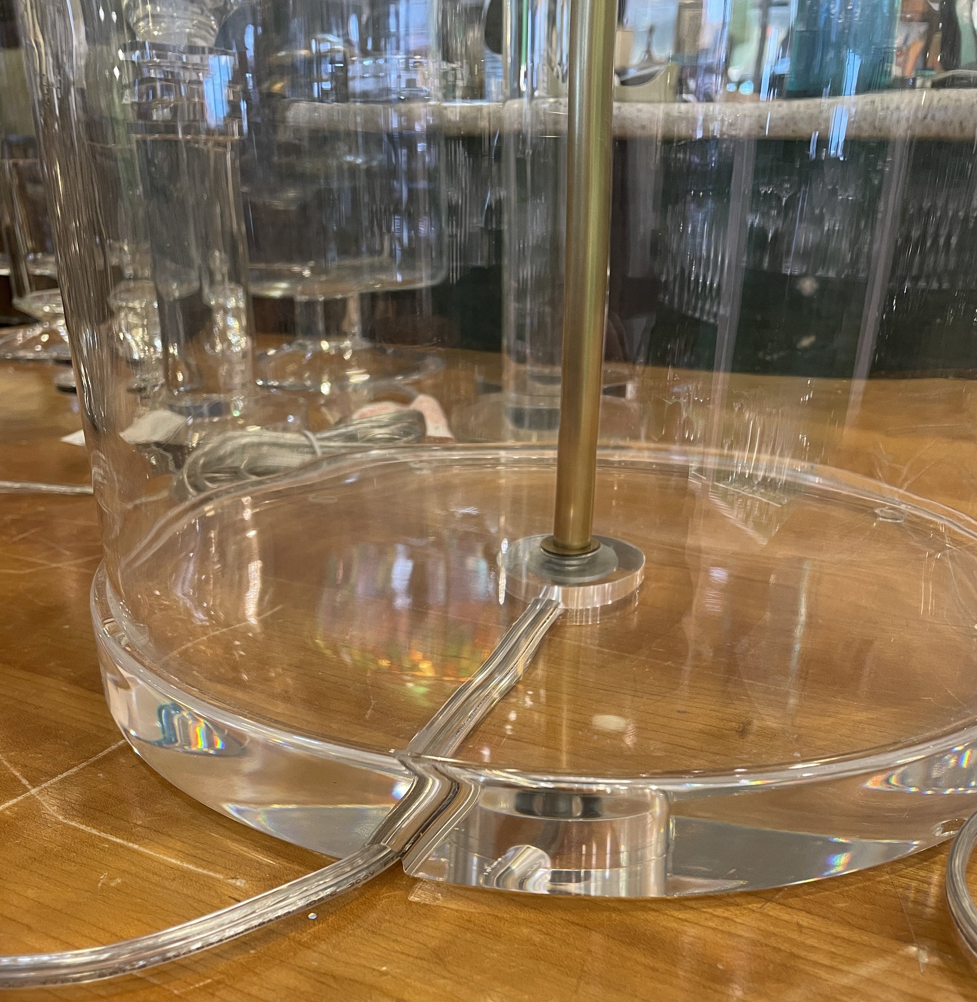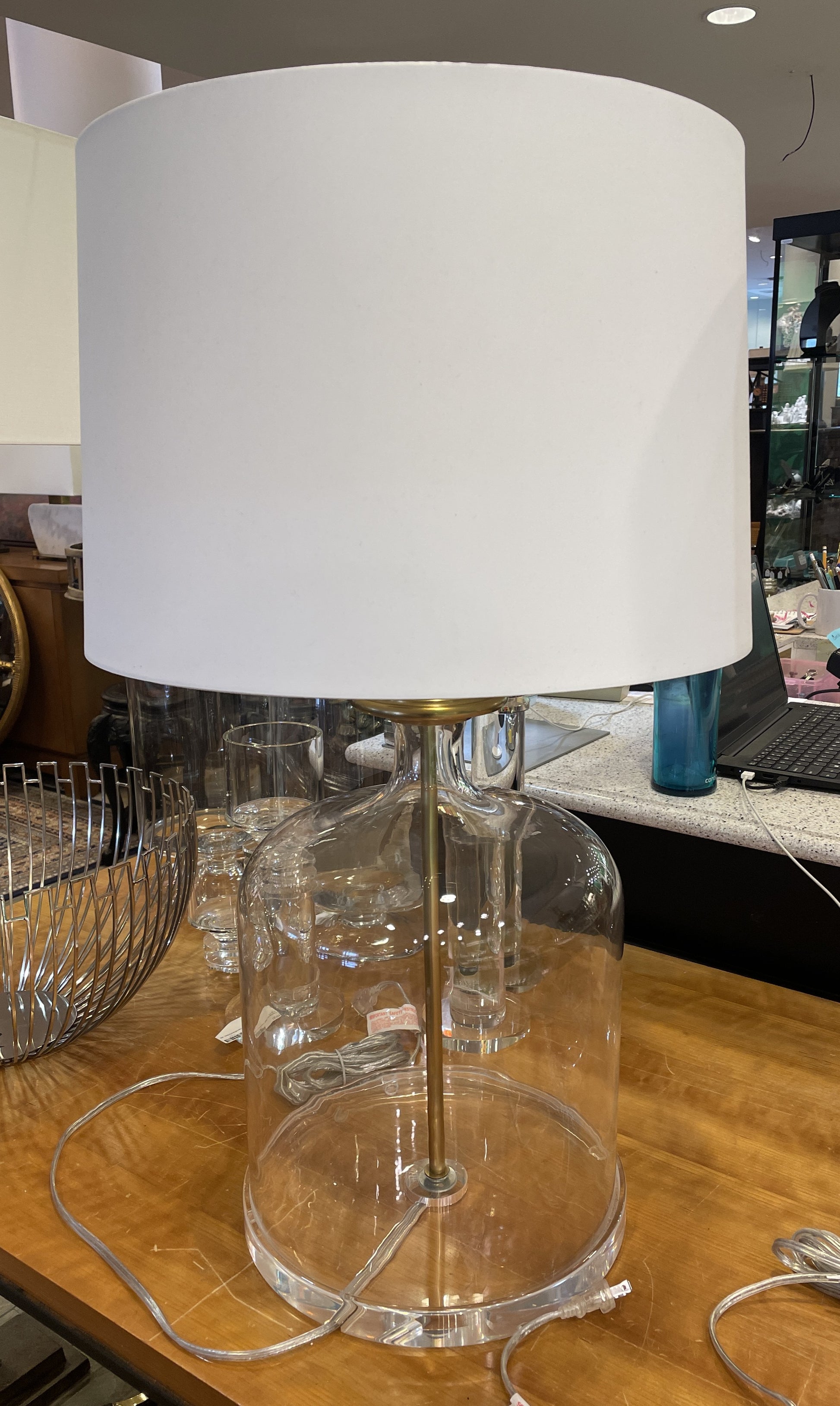 Ethan Allen Nolan table lamp. This beautiful lamp features a clear glass base that abruptly tapers into a thin neck. The neck holds up an antique brass finished collar whose stem you can see in the center of the vase. Atop the base sits a large, round ivory shade that allows the clear cylindrical finial to peek out the top.