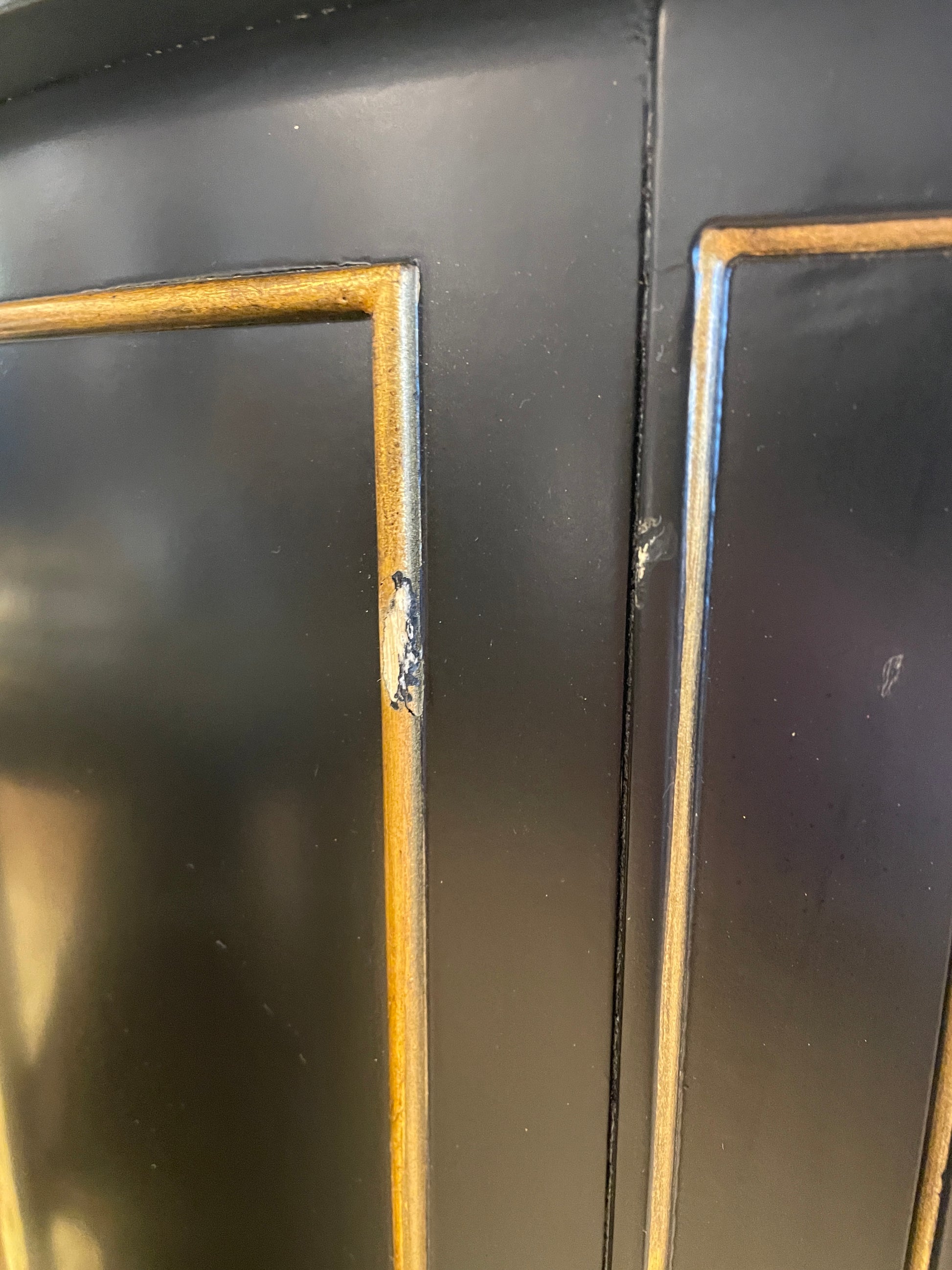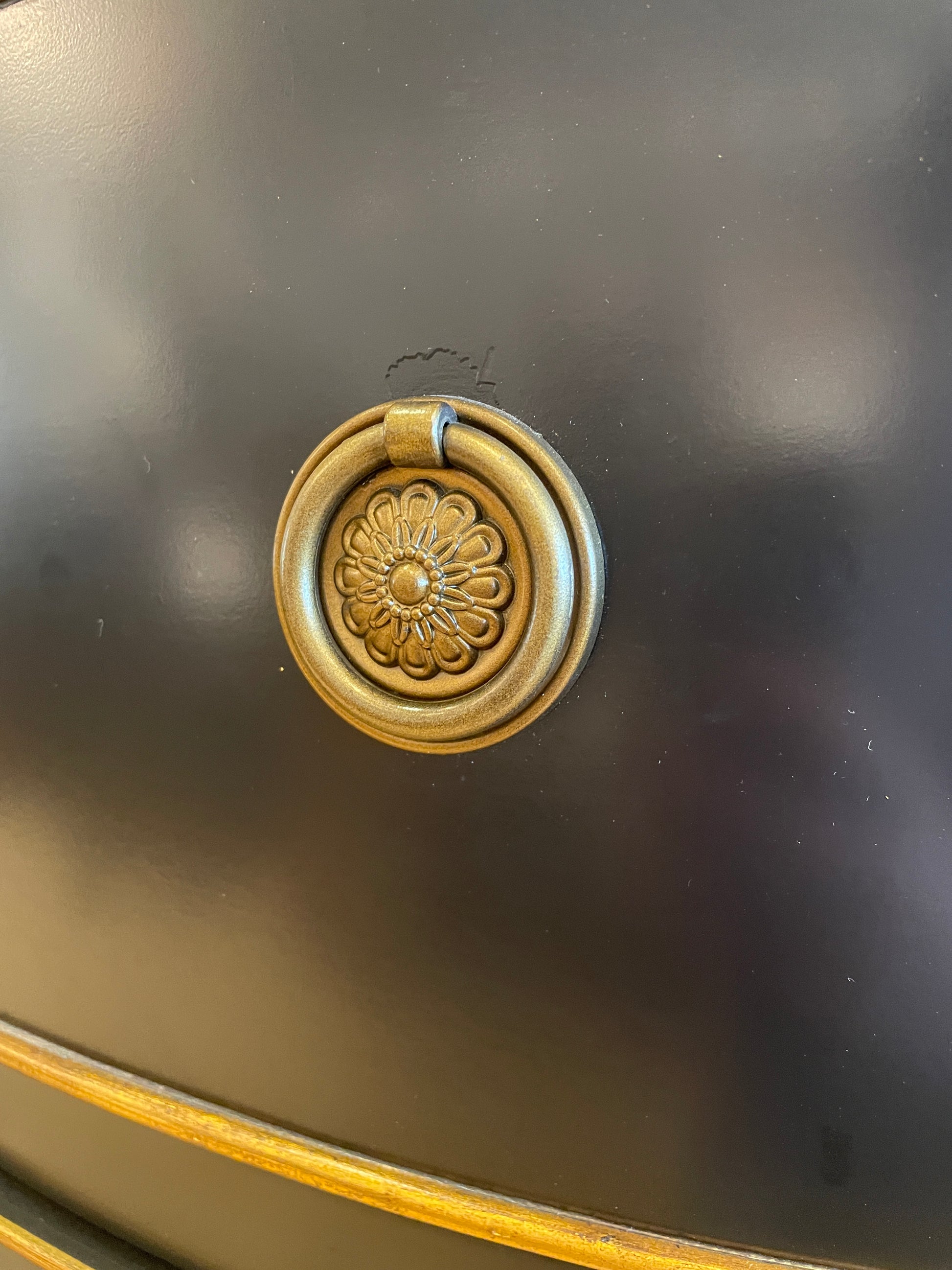 Ethan Allen Stratton black and gilded demilune chest. This beautiful half moon-shaped chest has three drawers. Each drawer has two circular pull handles. Gold trim accents the top, bottom, sides, drawers, and handles of this piece. The chest is sat on four short fluted legs. And elegant and classic piece that's sure to add a neoclassic flare to any space.