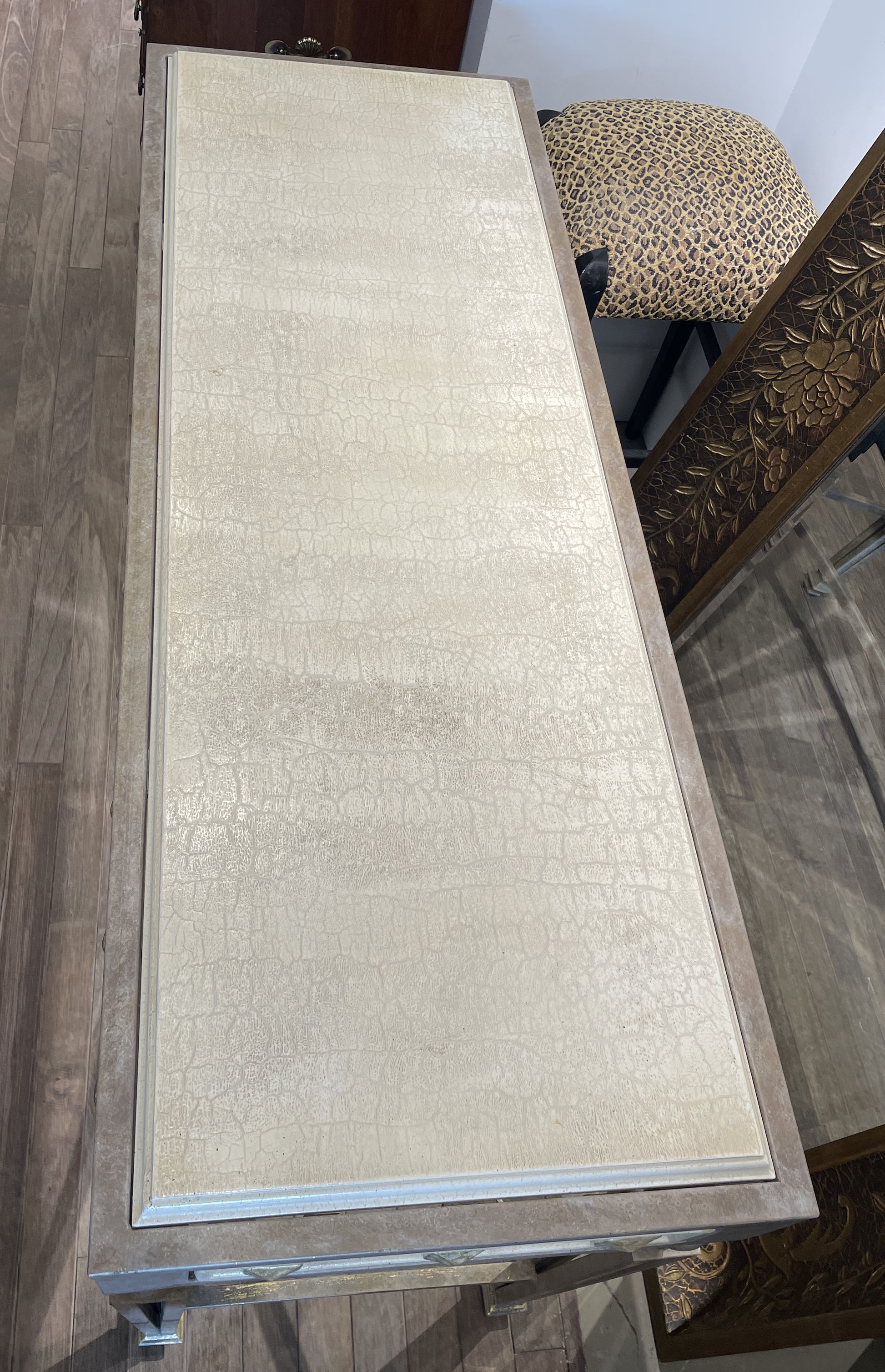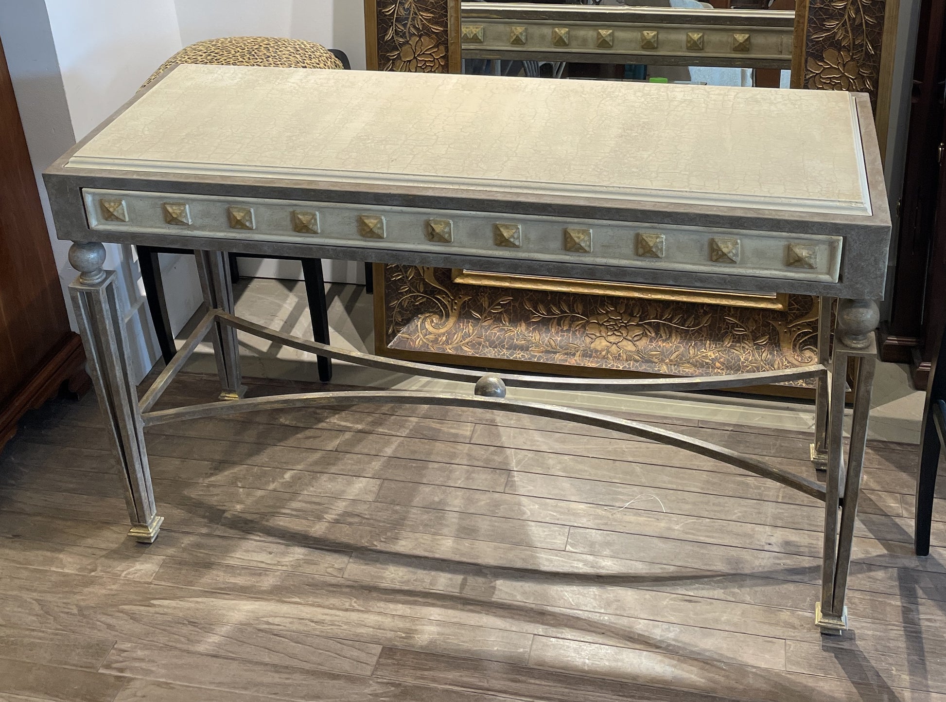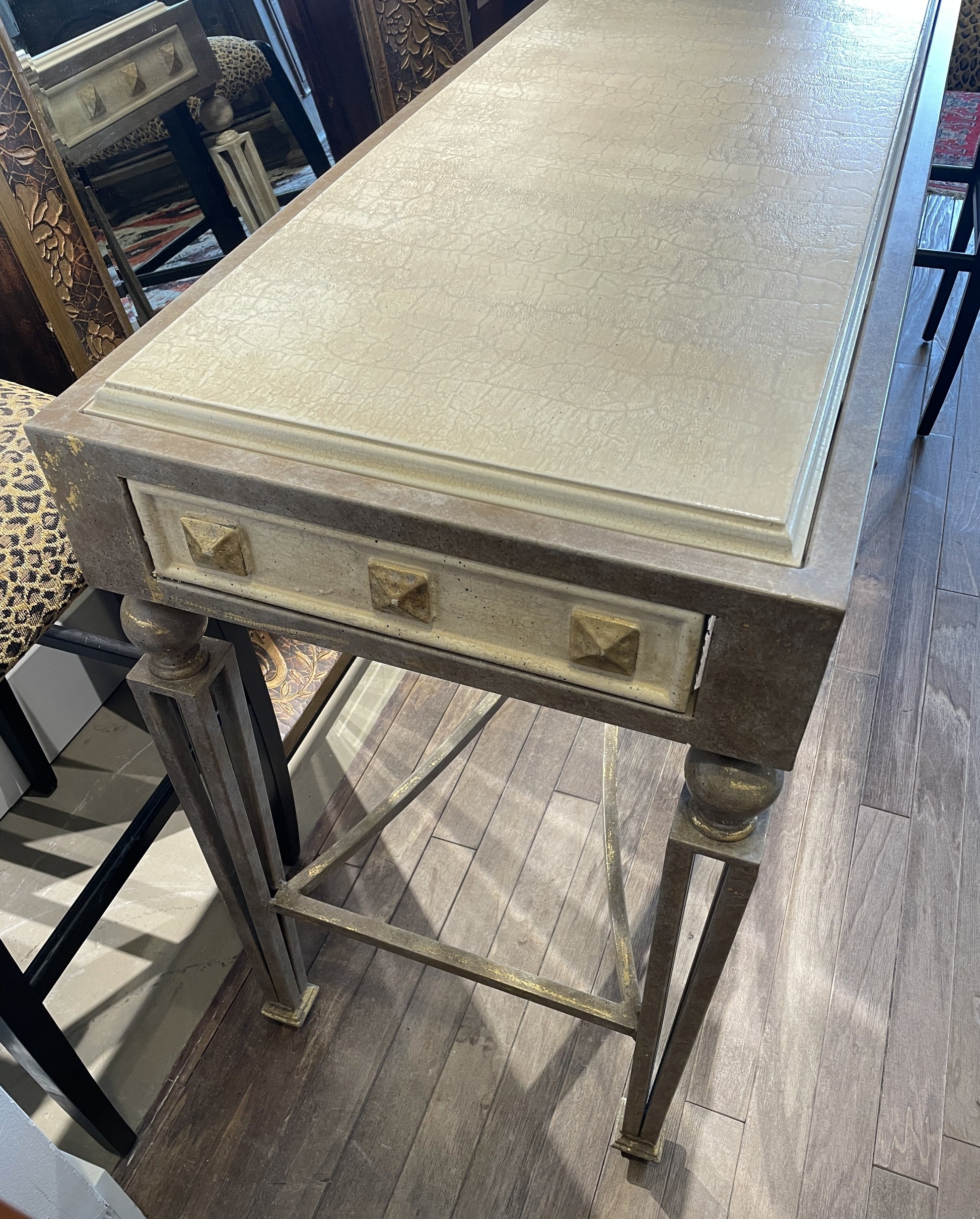 Faux finished console with metal base. This beautiful table in shades of gray, white, and gold sits atop four unique legs. The legs are composed of four squared posts atop block feet. At the tabletop, the legs are joined with a spherical accent. Similarly, the stretcher is joined in the center with a sphere. The frieze has large, gold, stud-like details on each side, and the top is has crackled off-white finish. A unique and charming piece for a space.