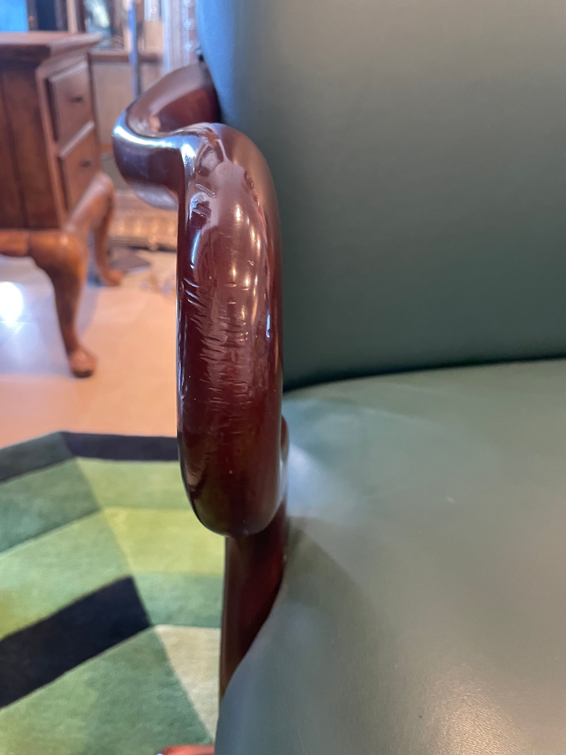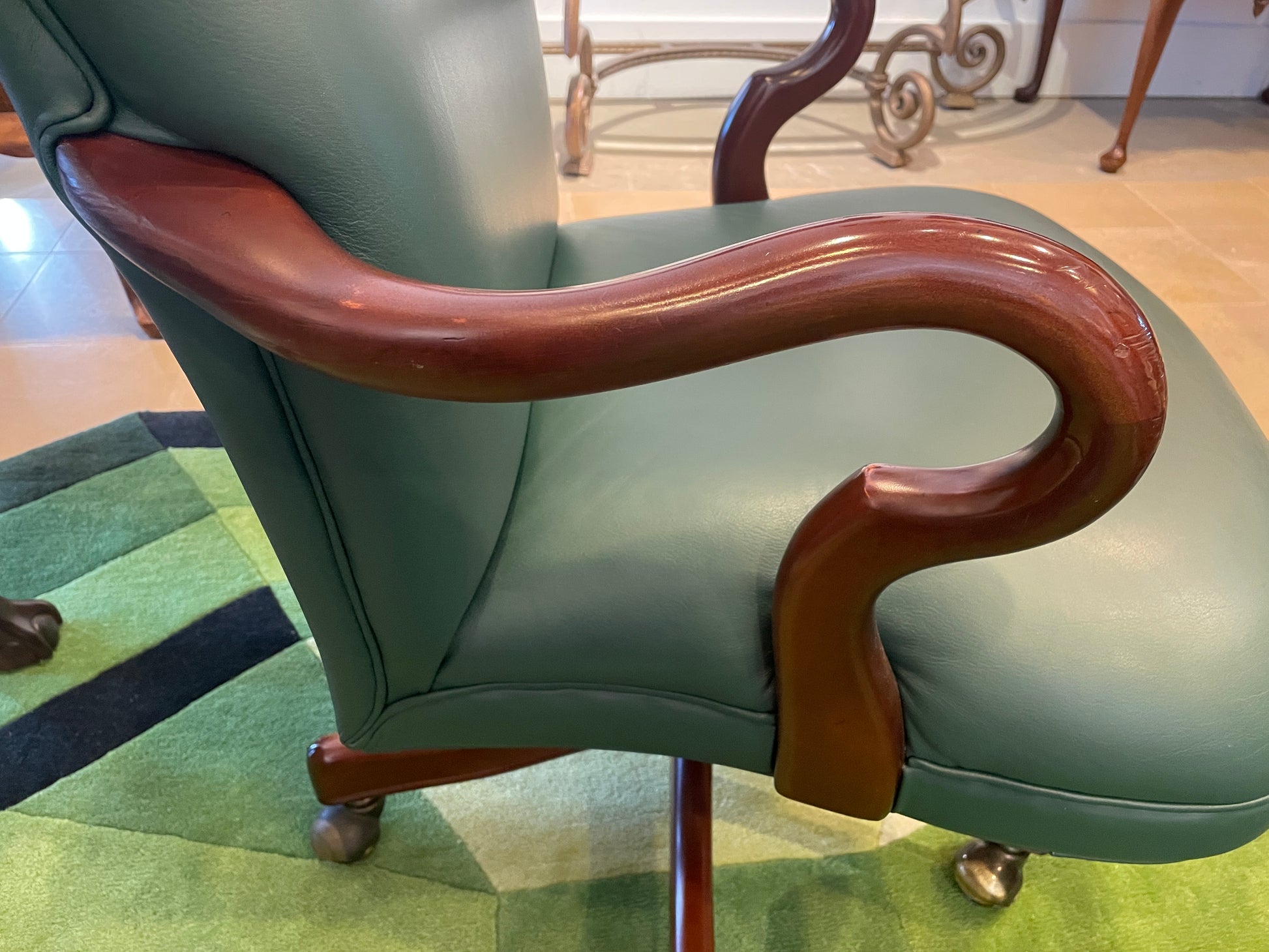 Faux leather executive desk chair in green. This gorgeous chair sits on a sleek, dark toned wooden star base with wheels. The seat itself is upholstered with a beautiful forest green faux leather on all sides of the back and seat cushion. Either side of the seat is capped with an elegantly curved arm in wood that matches the base. A stunning chair with a charming color and timeless design.