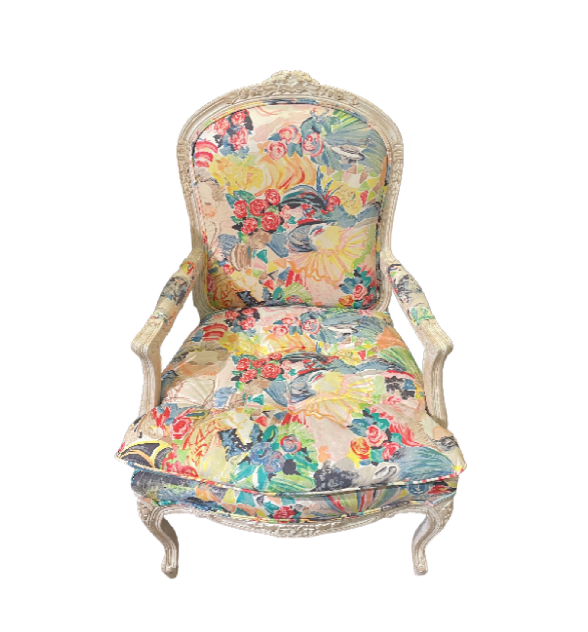 This vibrant Bergère chair features a carved wood frame with a distressed white finish, adding a touch of vintage charm. The upholstery bursts with color in a bold, floral and bird print, creating a lively and artistic statement piece perfect for eclectic or French-inspired interiors.
