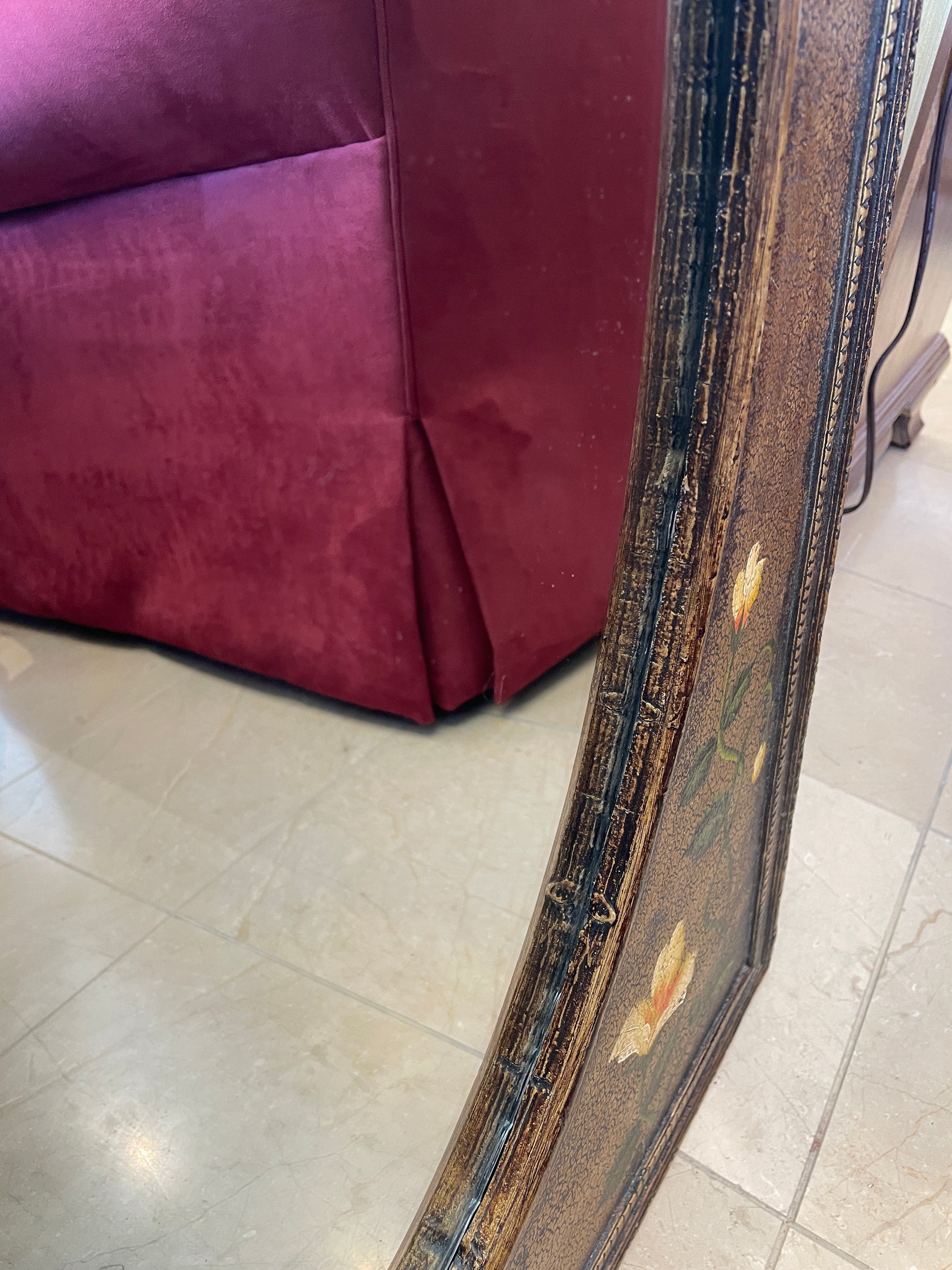 Floral painted mirror. This charming mirror features a rectangular painted frame surrounding an oval-shaped mirror. The painted details include yellow flowers on twisting green stems. The frame itself has a gilt appearance with a distressed, antique finish. A perfect mirror to brighten up a space.