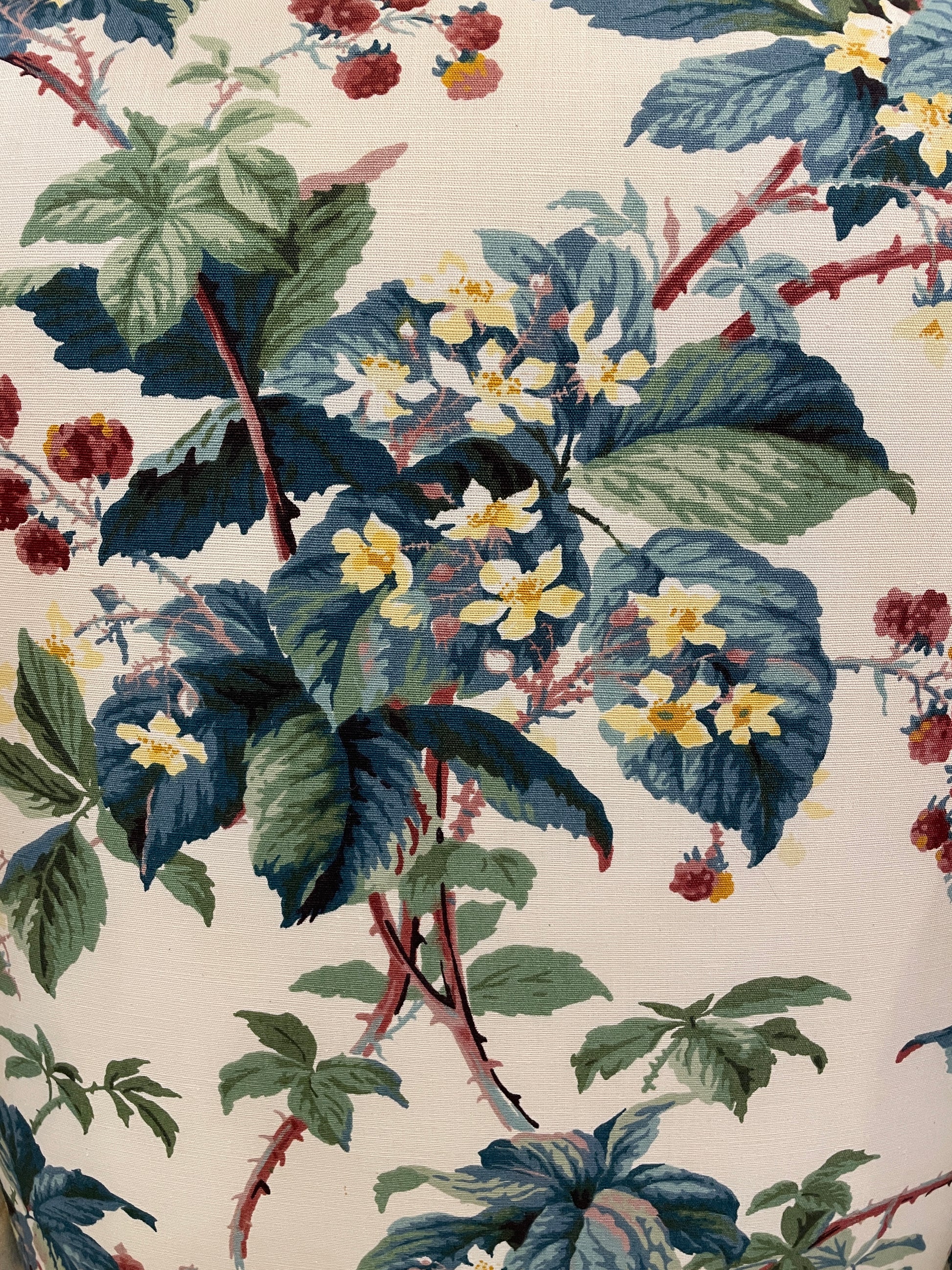 Elegant floral wing back chair. This beautiful piece is upholstered with white fabric that is adorned with a botanical motif in hues of green, blue, and red. It sits atop medium toned wood cabriole legs. The chair has a wide back and short arms. This chair is full of charm and is sure to catch eyes in any space.