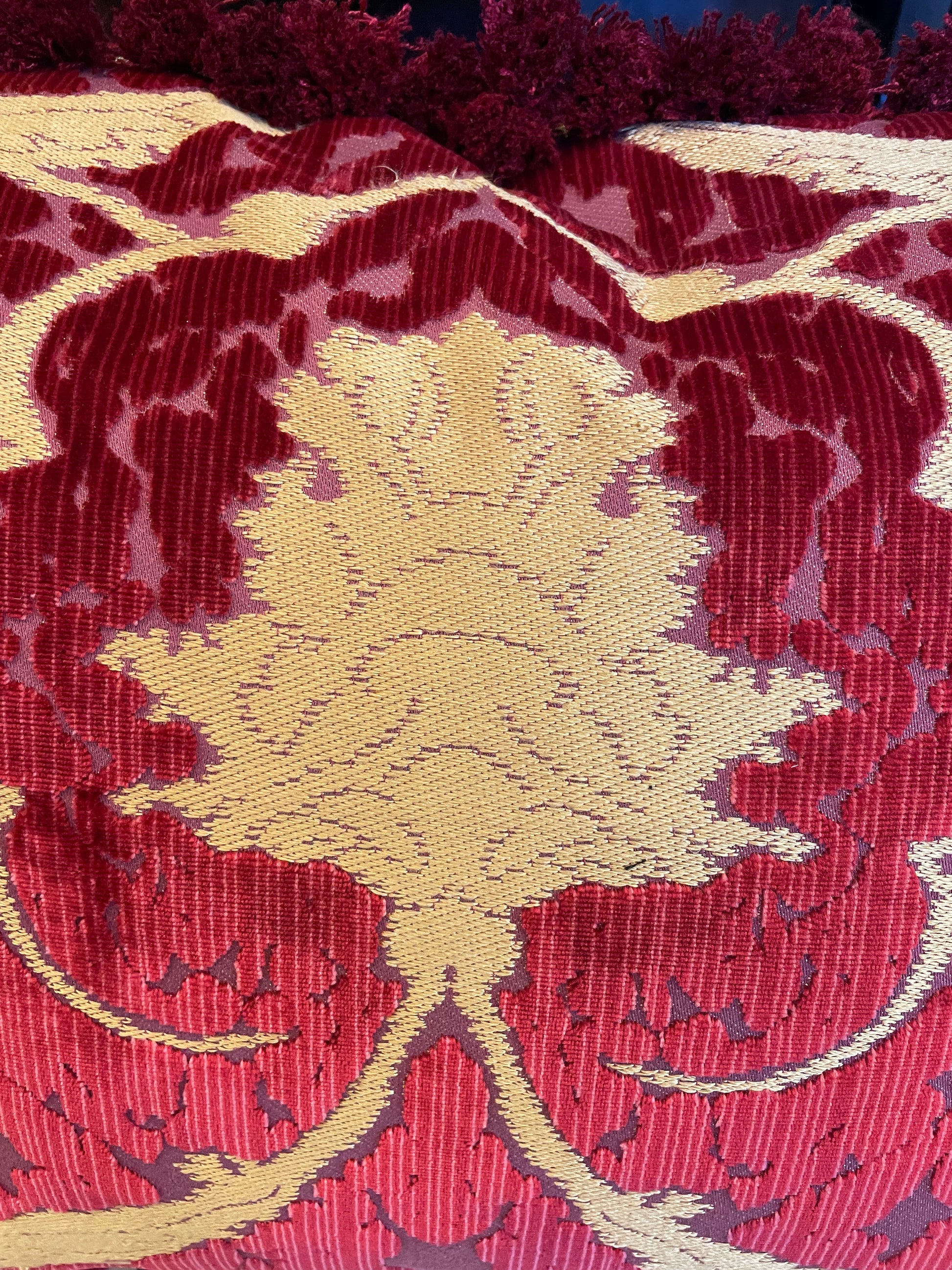 These beautiful burgundy and gold damask pillows are a perfect example of the quality and craftsmanship that Fortuny prides themselves on. Their symmetrical floral motif has a stunning visual flare that will elevate any space. The red velvet and gold woven accents add a textural element for even greater appeal. The outer edge of these pillows is ornamented with a gold trim and fluffy burgundy tassels. Plain, pink hued backs complete these eye catching pillows. Luxurious and full of history, these pillows are sure to add a high class feel to any space.