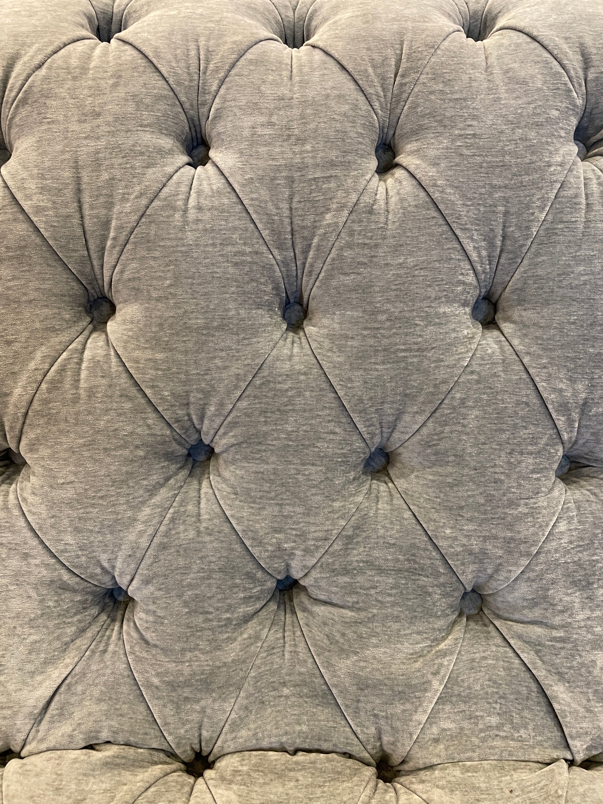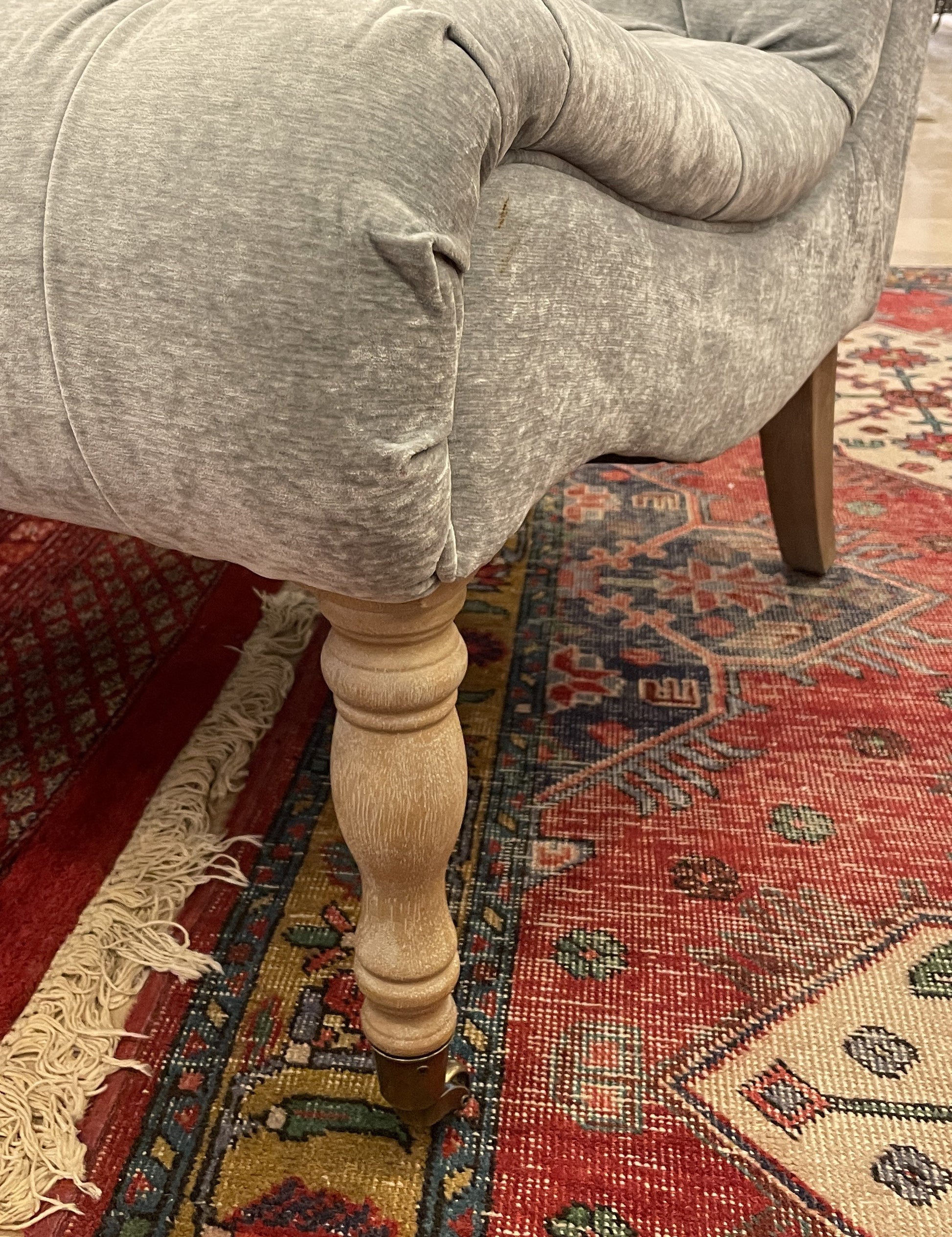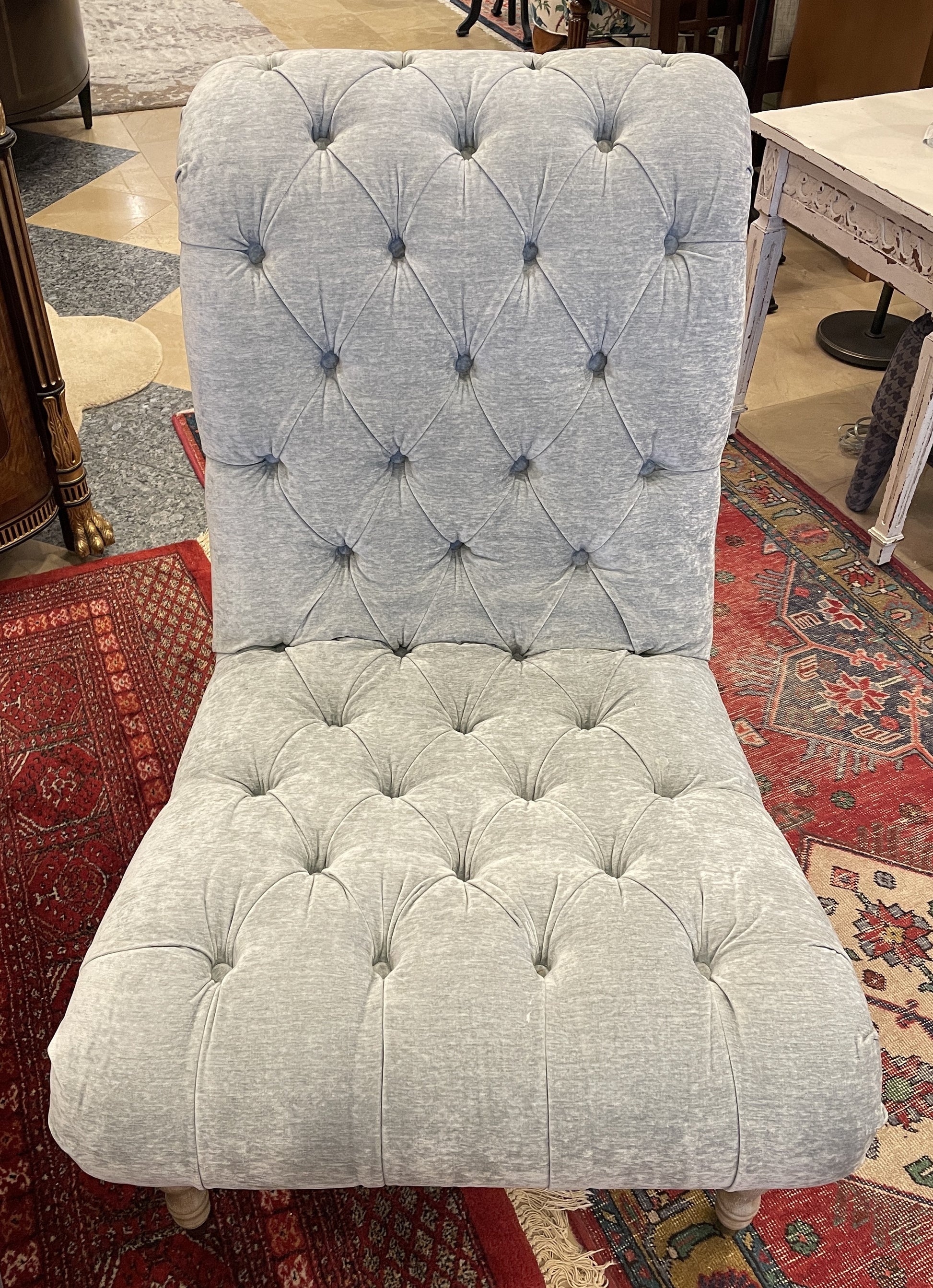 Four Hands Michelle tufted armless chair. This beautiful chair is upholstered with a pale blue velvet. The chair sits on four legs crafted from a light-toned wood. The front two legs are turned and sit on casters. The hind two legs are sabered. The seat itself is deep and low to the ground with a high, rolled back. The front of the chair is covered with deep button tufting for added appeal. A glamorous chair that showcases both comfort and class.