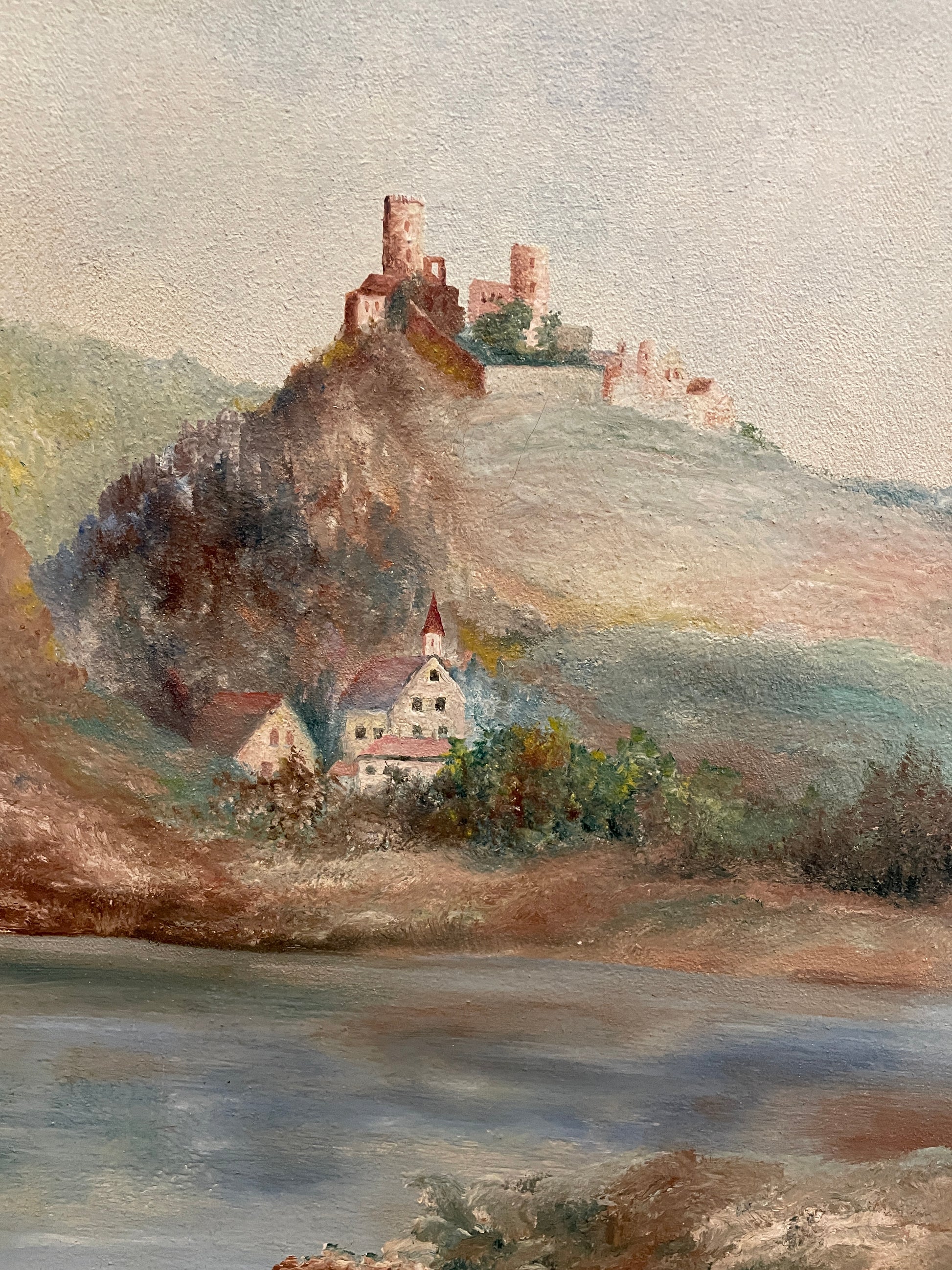 Frank Speck print of an oil on canvas painting. Signed lower right. This beautiful scene displays a couple of buildings sitting atop and beside rolling hills. The buildings beside the hill seem to be a village, and the ones sitting atop the hill look like a fortress or castle. The foreground of this piece features a gently flowing river, and just before the first building sits a small forest of trees. The piece is set in a thick, gold sloped frame. A beautiful impressionist piece that's sure to brighten up a space.