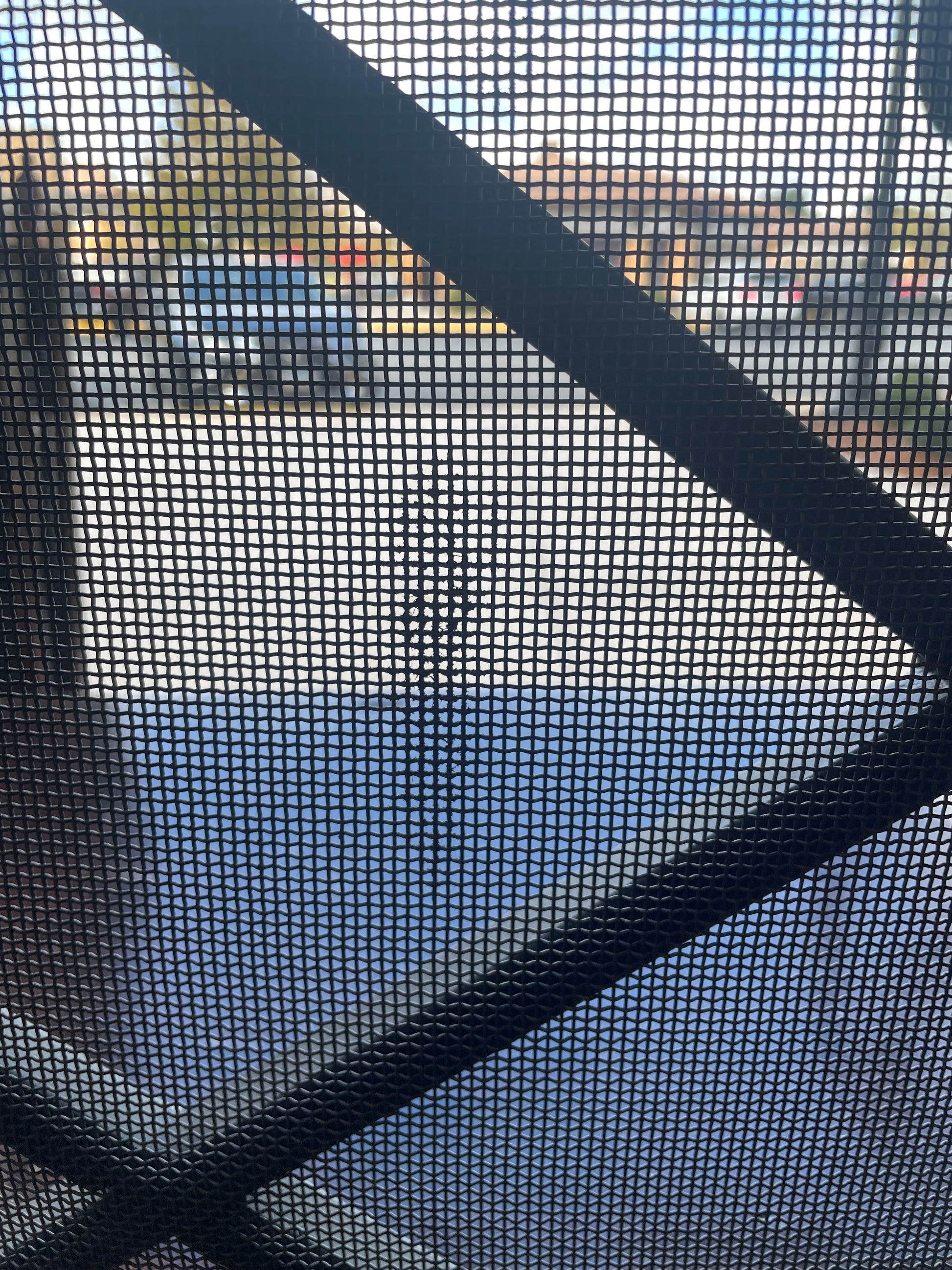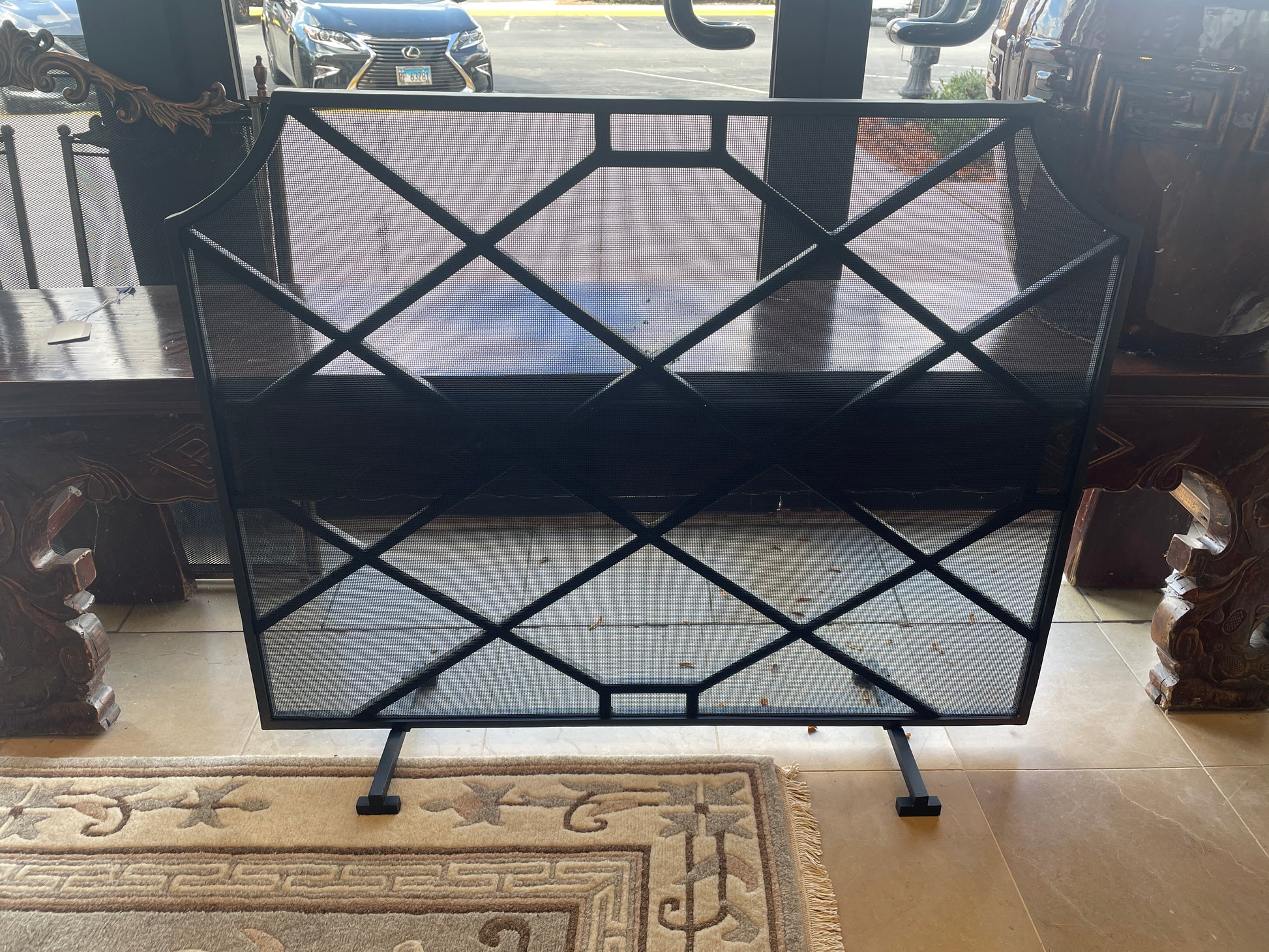 Frontgate Beckett fireplace screen. This elegant fireplace screen is black in color. It sits on small legs with rectangular feet. The piece is freestanding and does not mount to the floor. The face of the gate has a diamond pattern that is formed by the crossing bars of the powder coated aluminum frame. A functional piece that is sure to add class to any space.