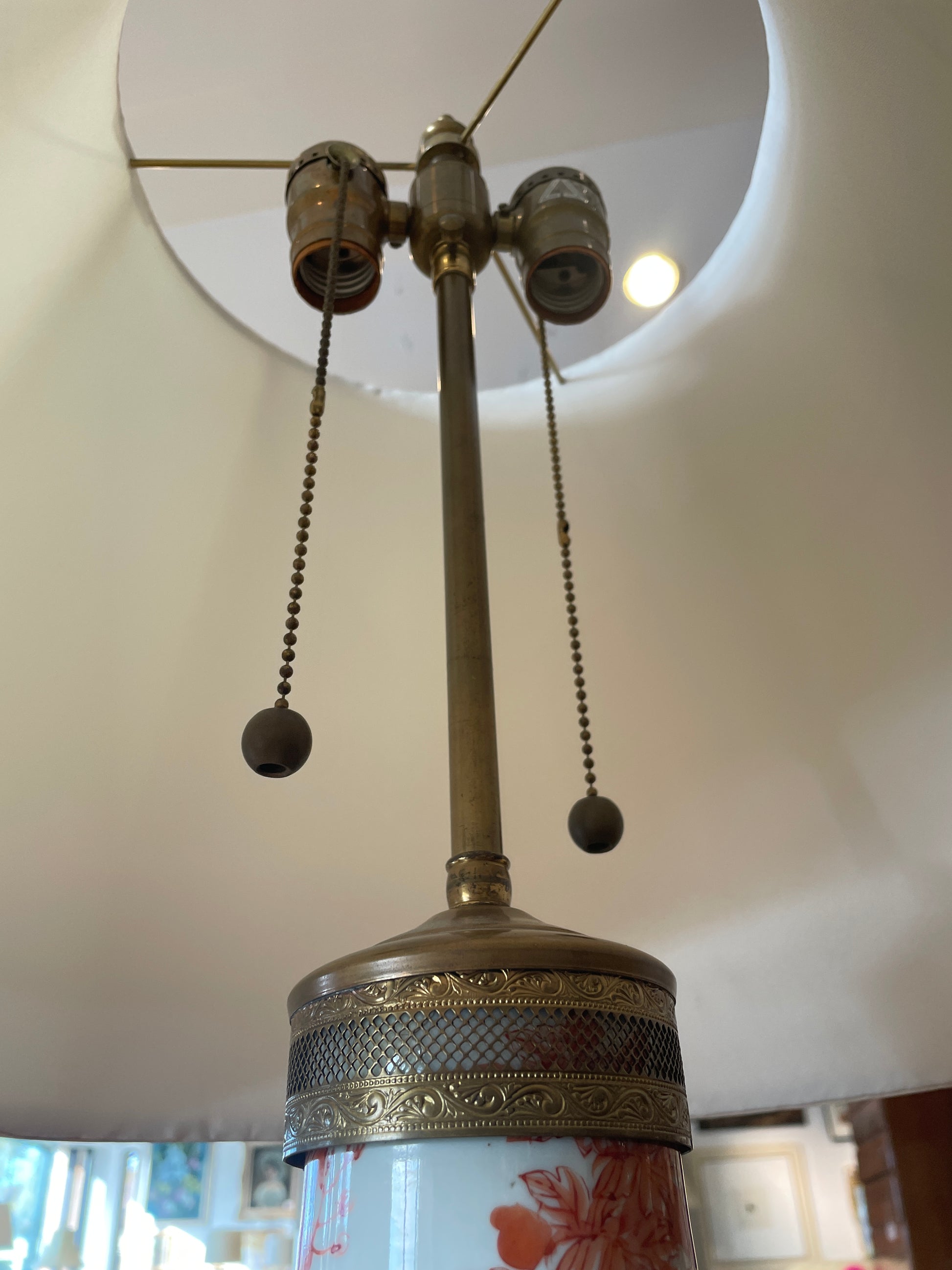 Fujita Kutani hand painted floral table lamp in orange. This beautiful table lamp is made by the Fujita company, known for their stunning hand-painted Japanese porcelain Kutani ware. The vase of this lamp is supported by a small wooden stand. The vase itself is painted with intricate orange botanical details that include chrysanthemum flowers. The piece is topped with a white bell shaped shade. This stunning piece of art is a beautiful display of Japanese craftsmanship.