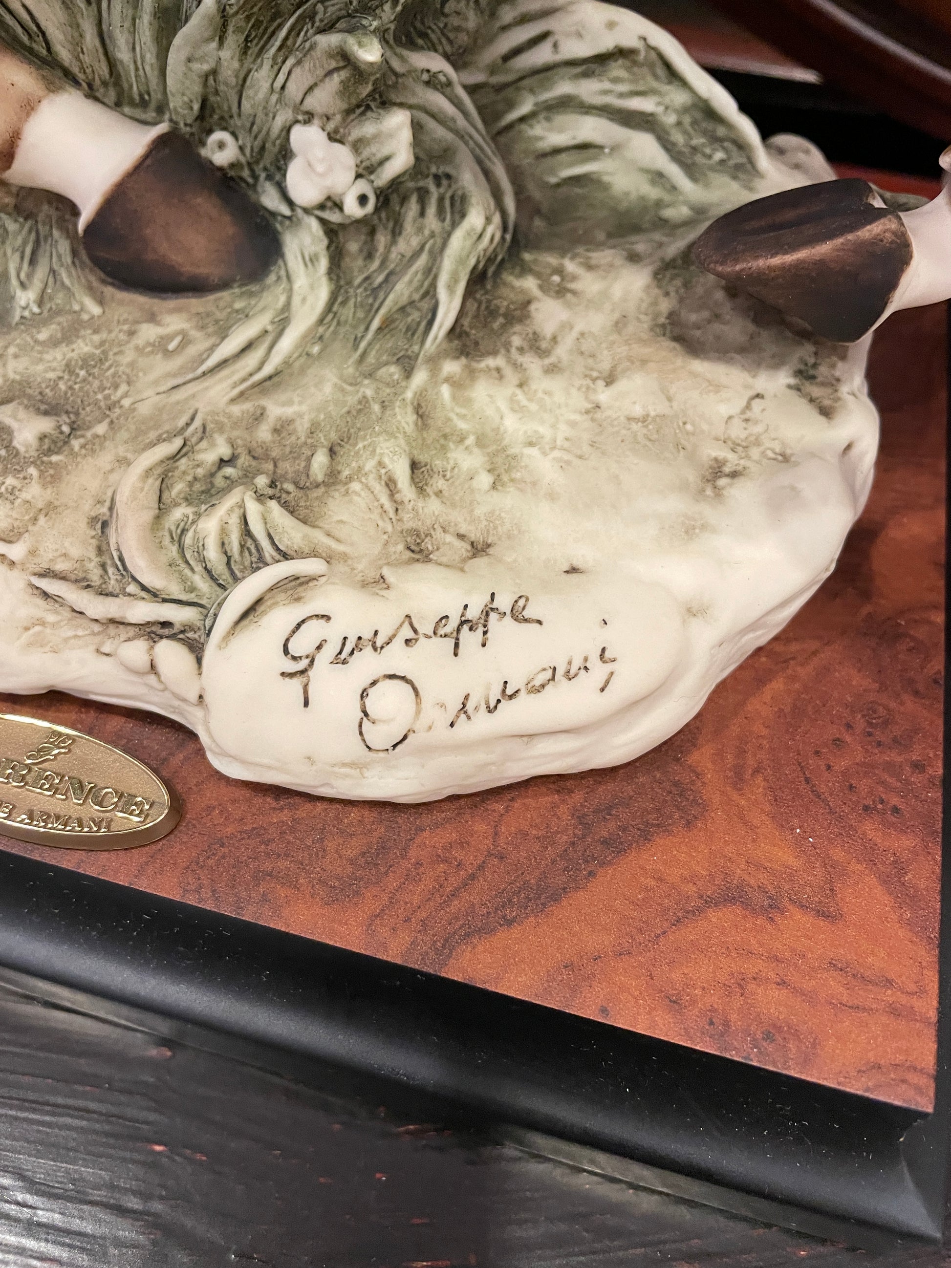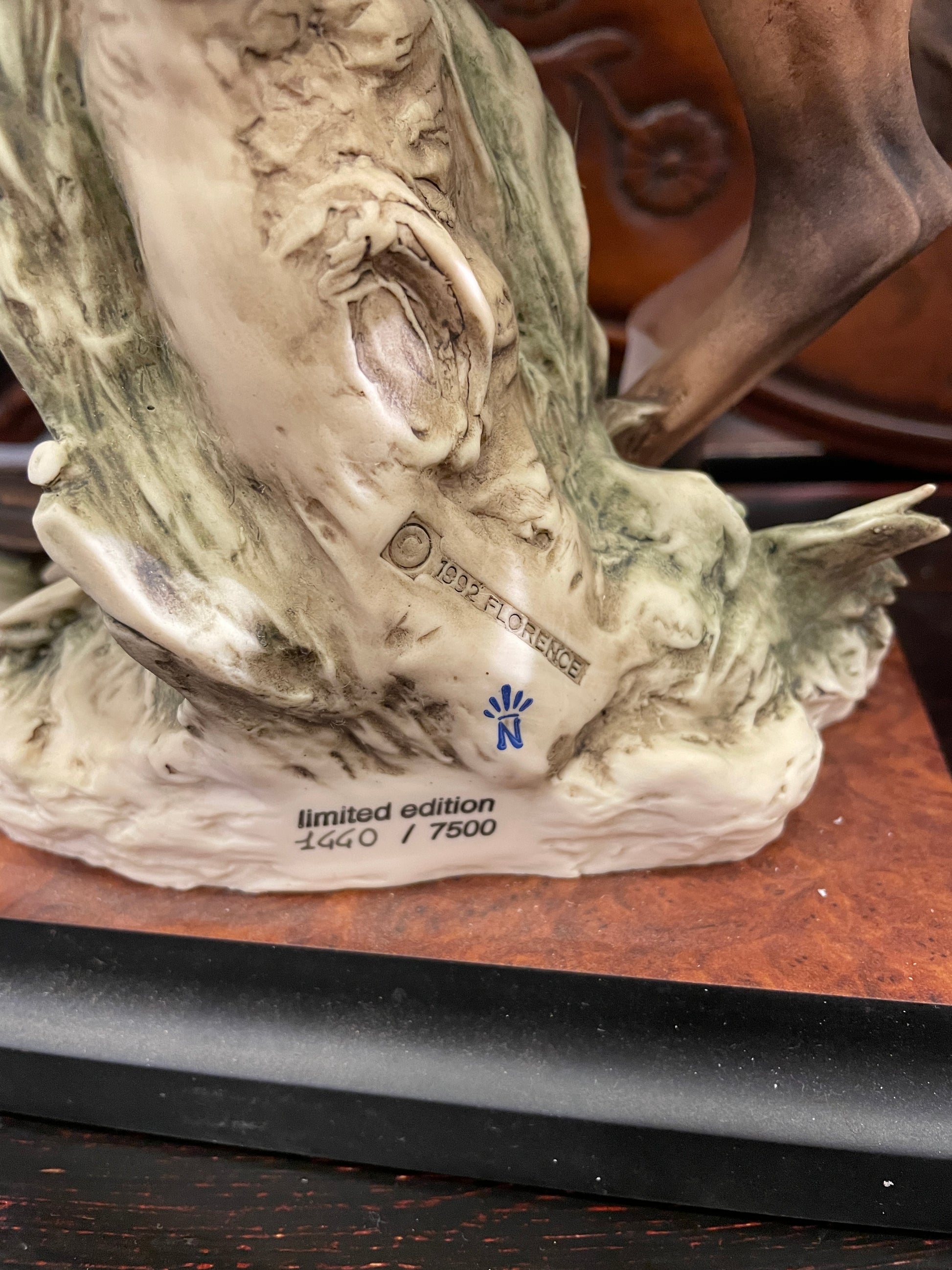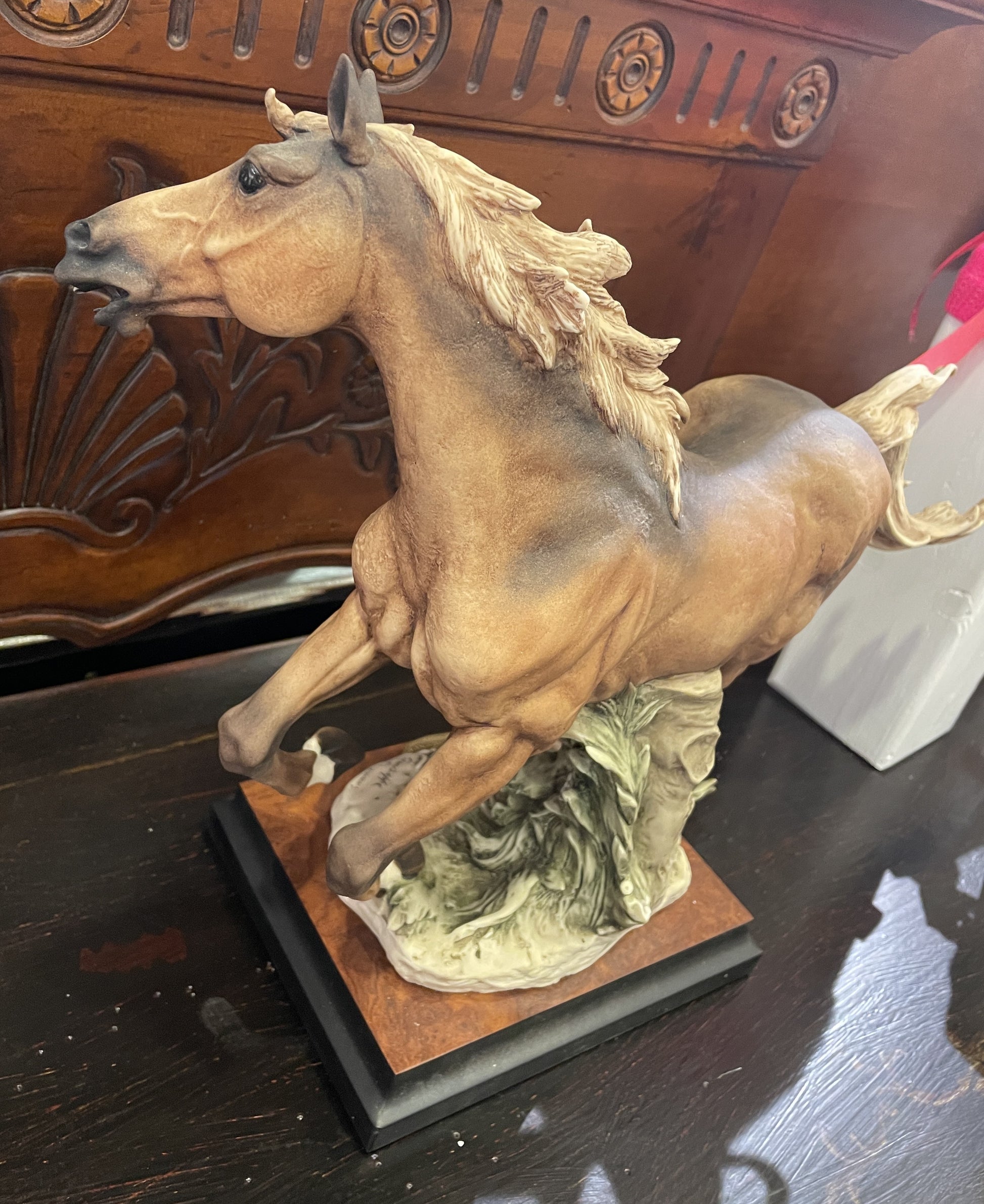 Giuseppe Armani galloping horse porcelain figurine with box. Limited edition 1440/7500. This stunning figurine sits on a wooden base with a placard displaying the title. The top of the base has a burled finish that surrounds a grassy pedestal. The pedestal holds up a palomino horse with a blonde coat, mane, and tail. The horse is galloping with its mane and tail flowing in the wind. A beautiful piece perfect for a horse lover, or a space that needs a little extra liveliness.