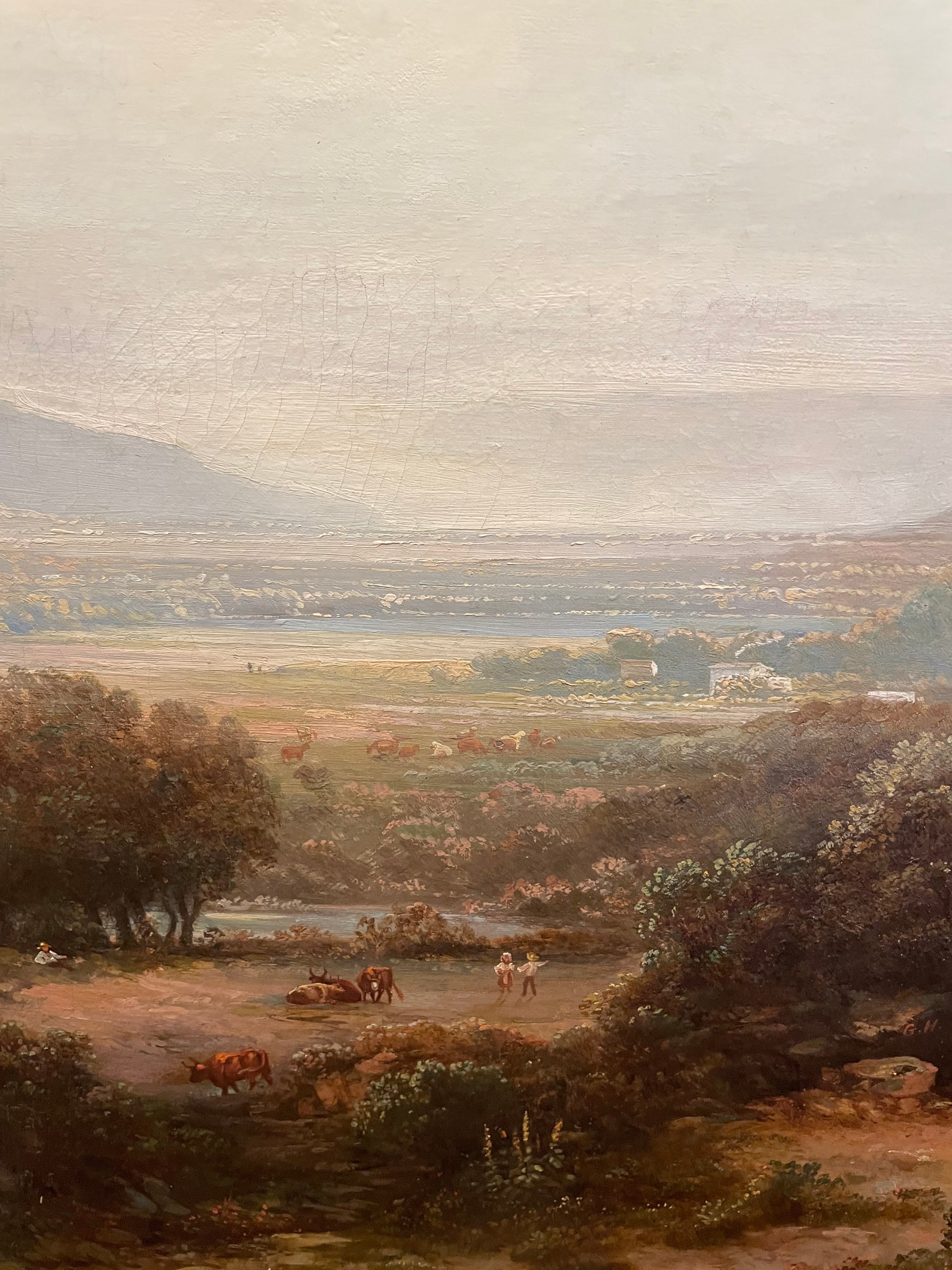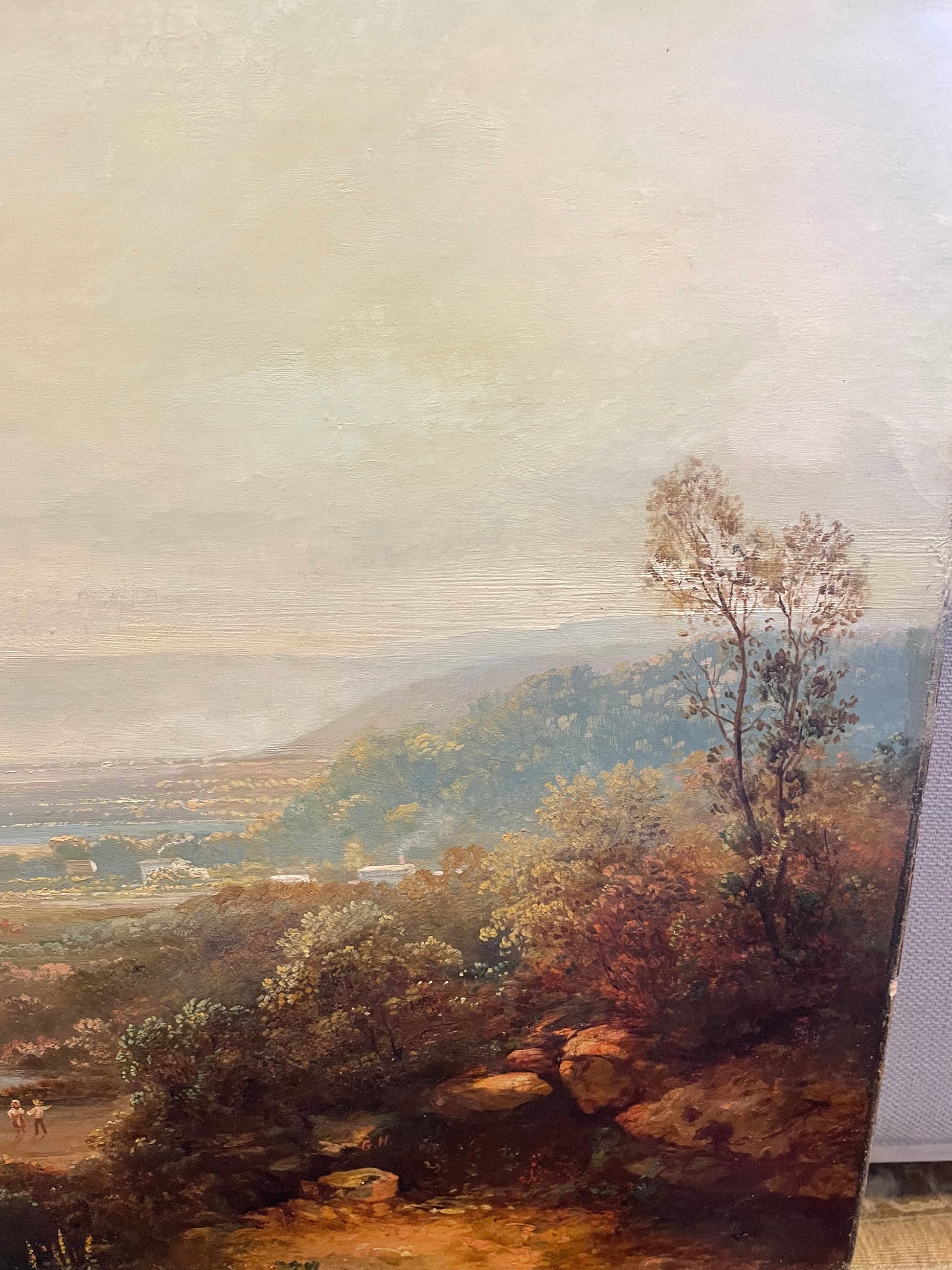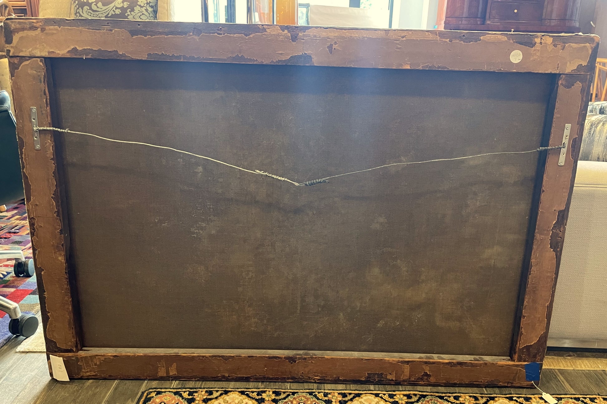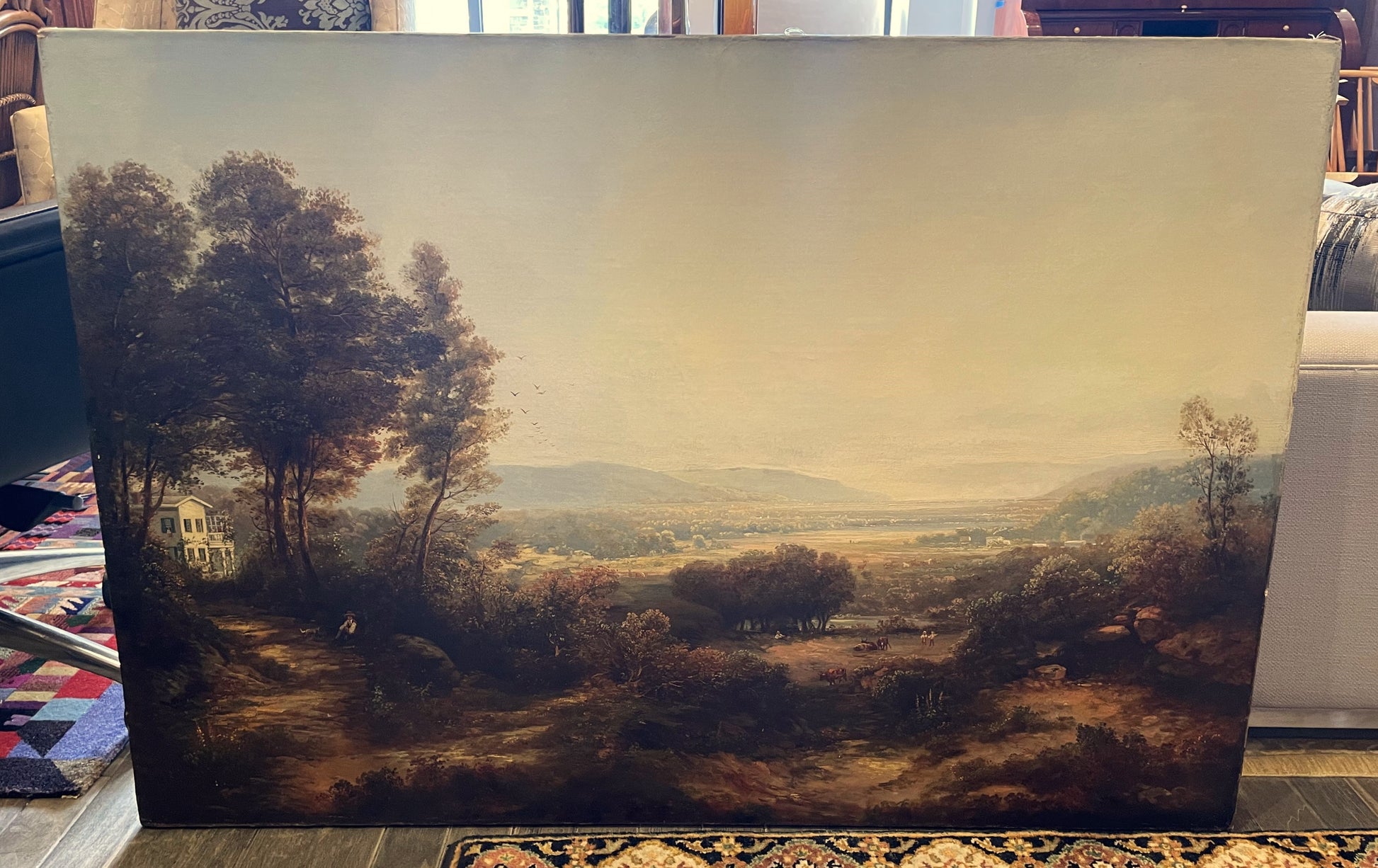 Large oil on canvas landscape by, George Herbert McCord. Features a stunning view overlooking a valley. There is a quaint, white house on the left side near large, billowing trees. Cattle and a variety of brush can be seen in the distance under the vast sky. Copper nails hold the canvas to the frame.