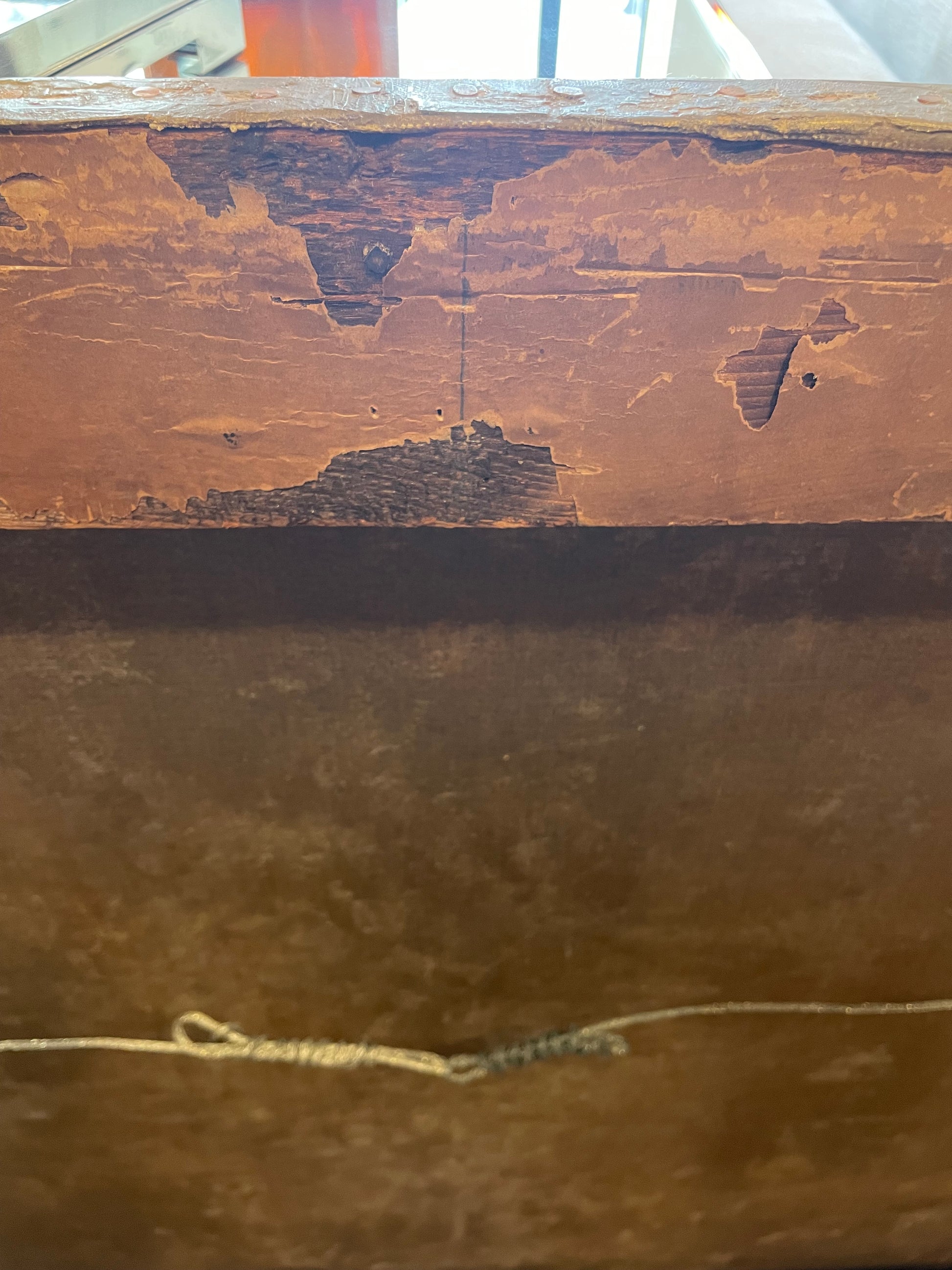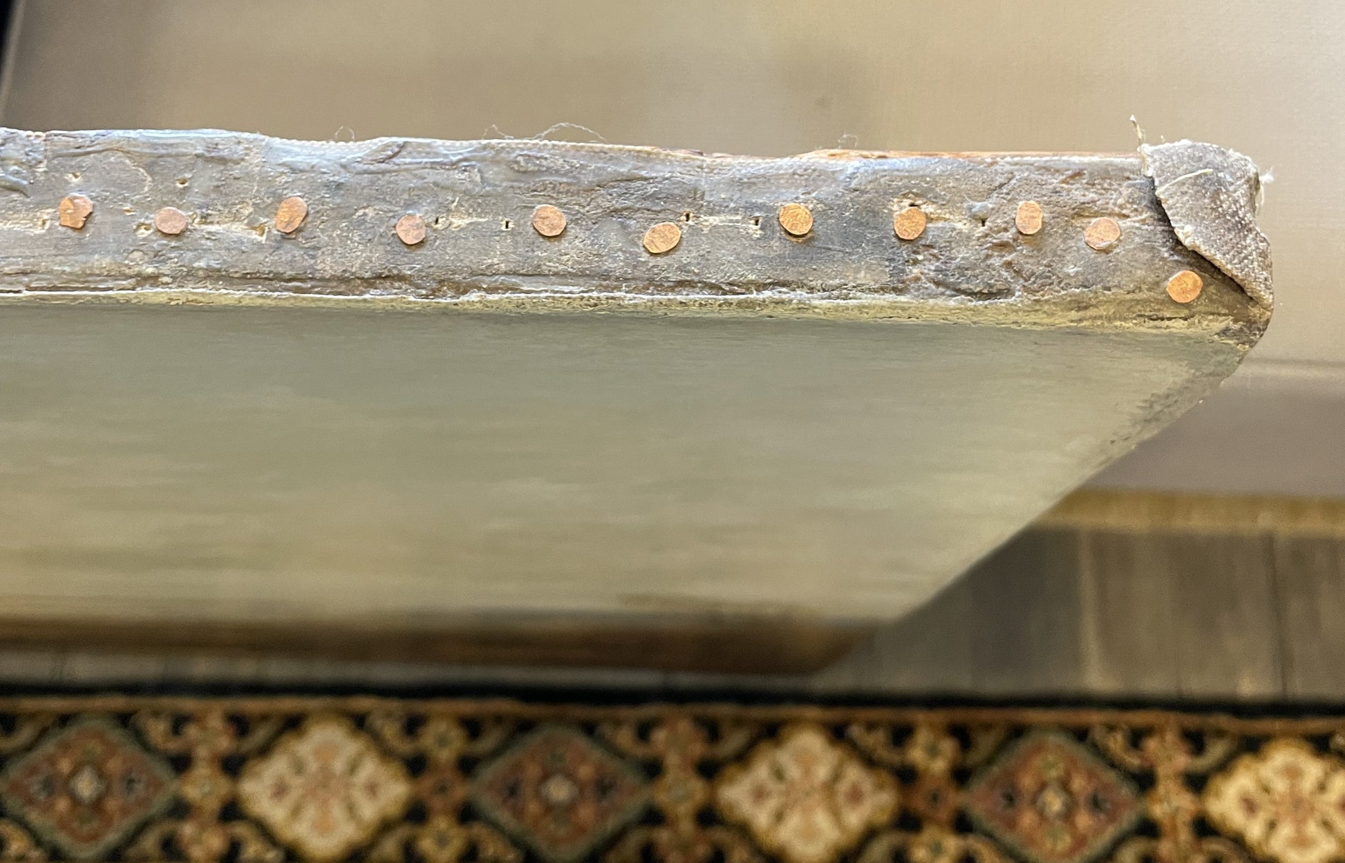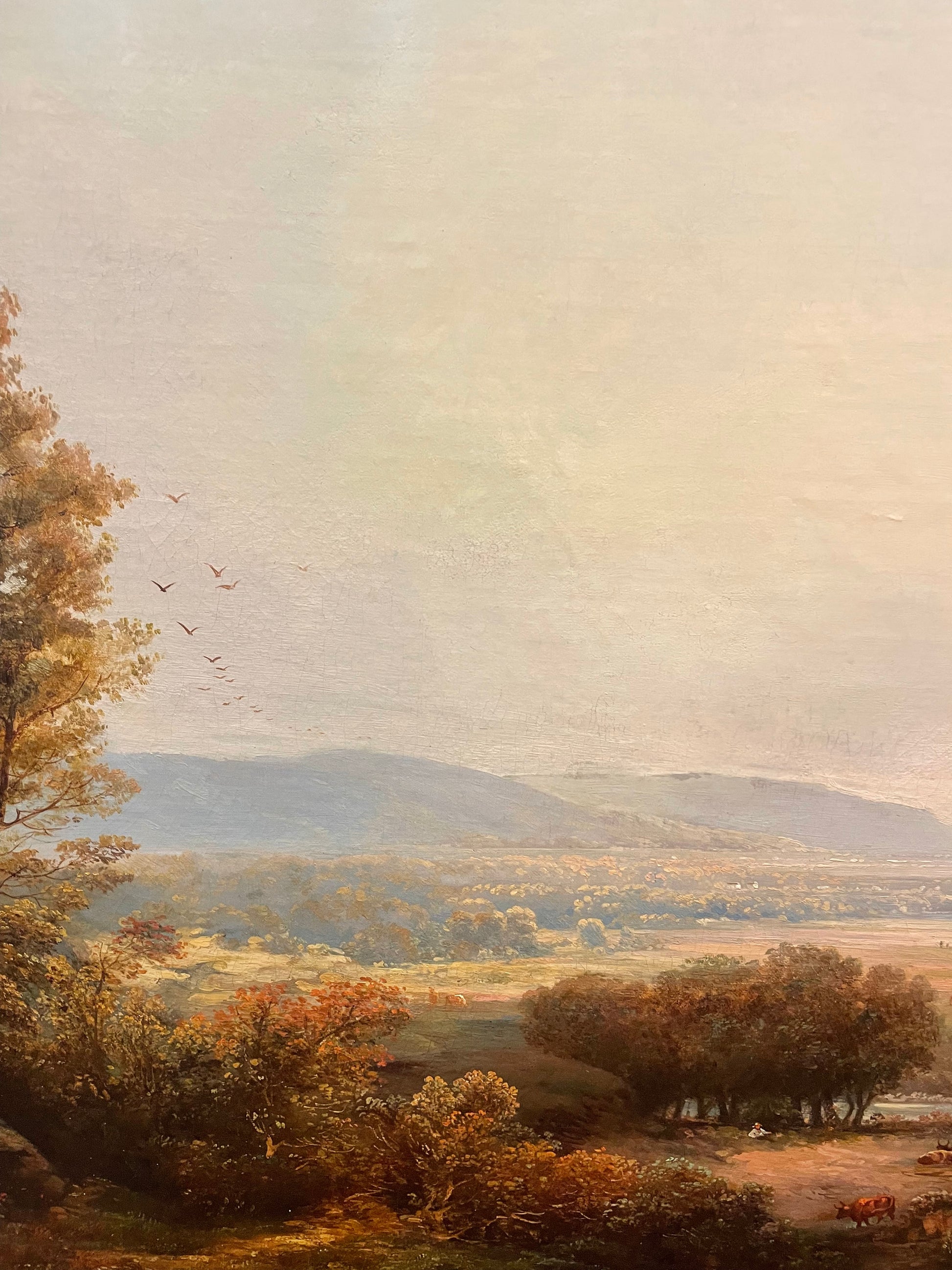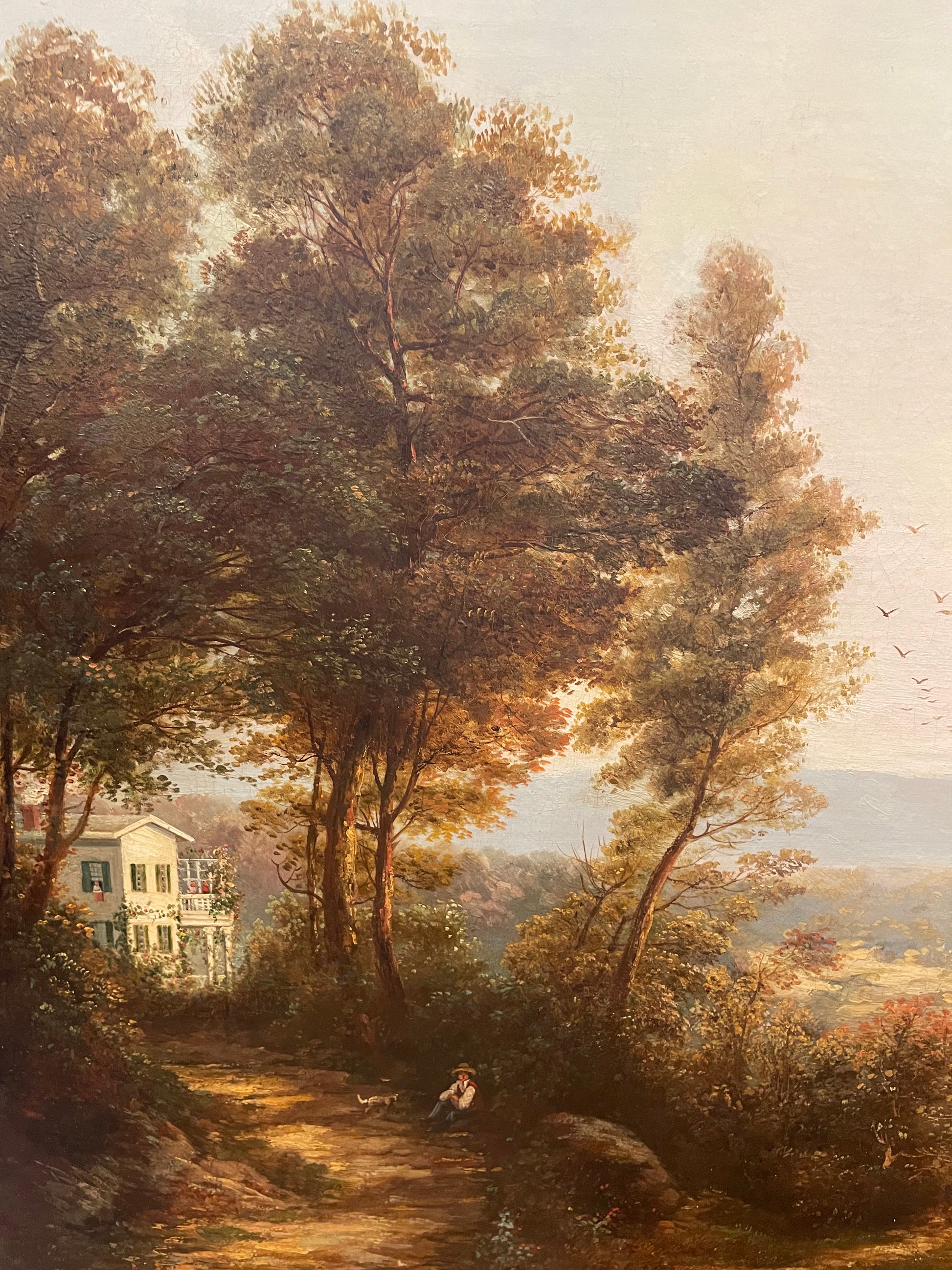 Large oil on canvas landscape by, George Herbert McCord. Features a stunning view overlooking a valley. There is a quaint, white house on the left side near large, billowing trees. Cattle and a variety of brush can be seen in the distance under the vast sky. Copper nails hold the canvas to the frame.