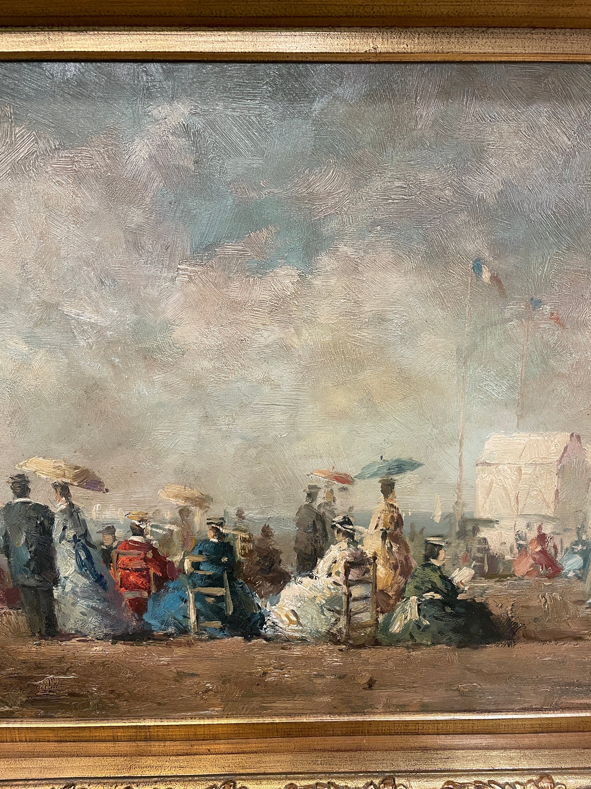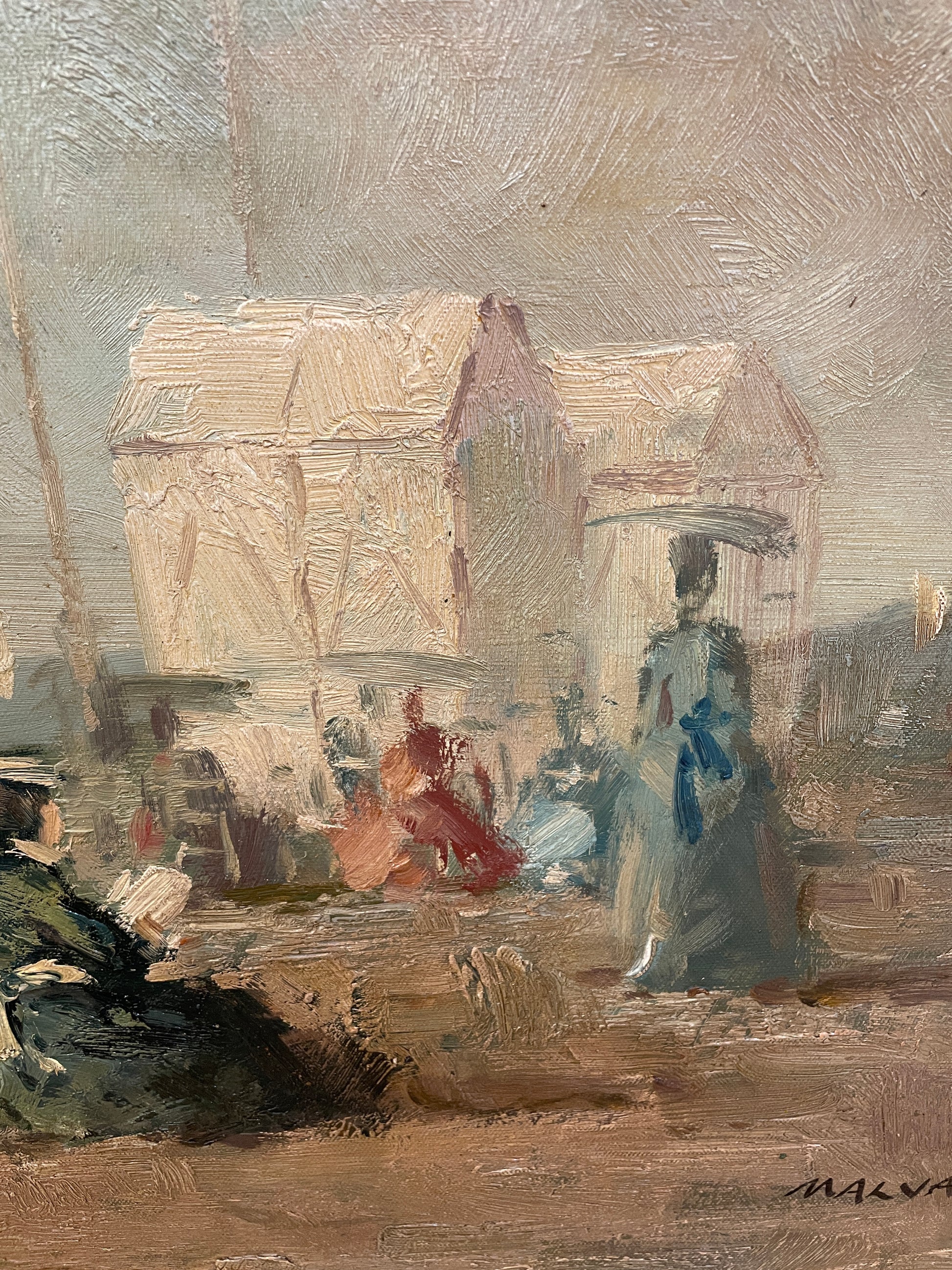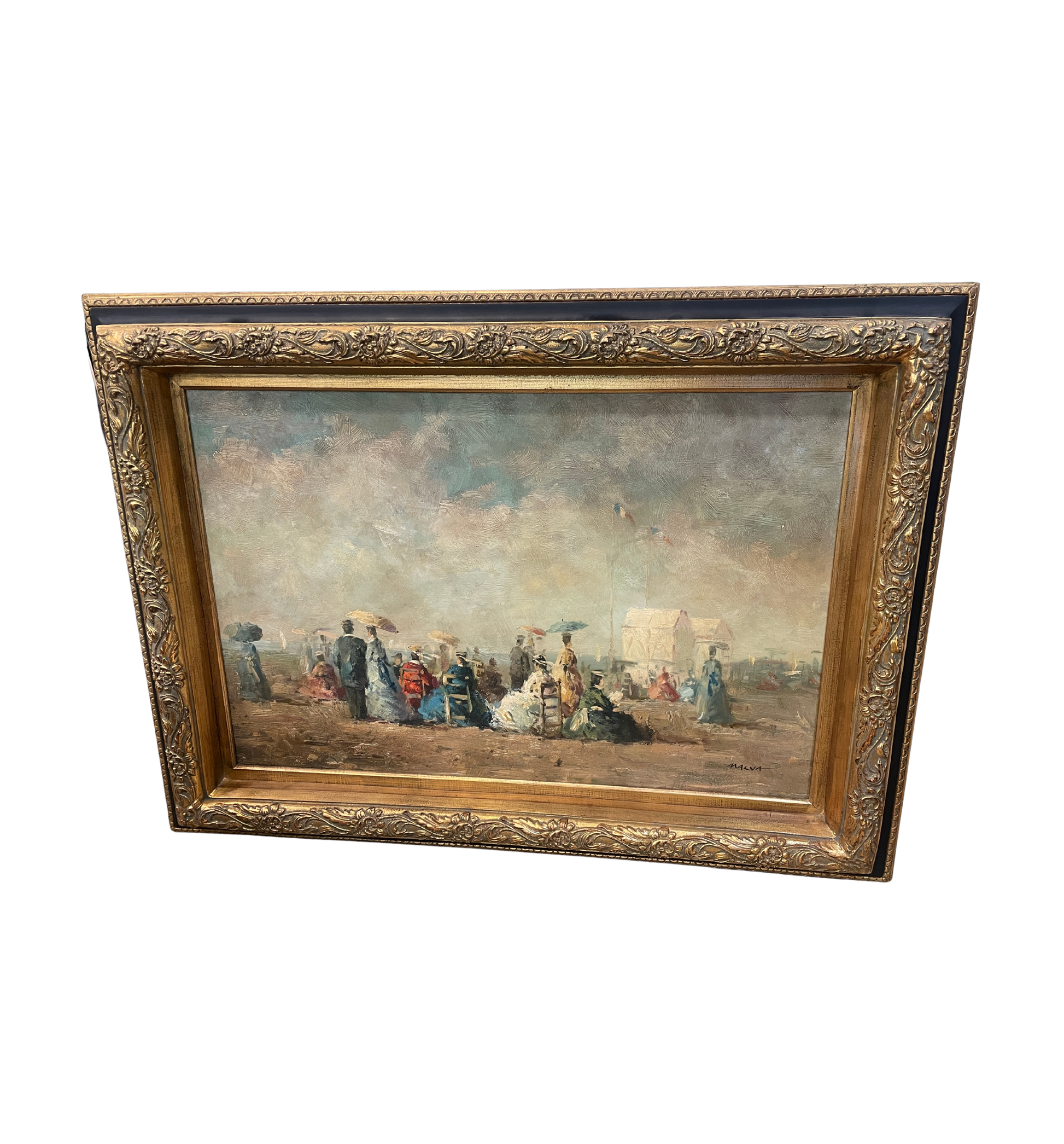 George Malva (1951-2015) oil on canvas sea scene. Signed lower right. This beautiful piece depicts a group of well-dressed individuals on a beach. The people are mainly grouped in the center of the piece, some of which are sitting, some holding parasols, and others simply standing. Closer to the coast sits two tall white beach tends that sit with French flags flying behind them. The impressionist style of this piece gives it an alluring feel that asks the viewer to look closer. The piece is held in a gilt ornate carved frame with a black center band. A beautiful piece that's sure to add a subtle nautical touch to any space.