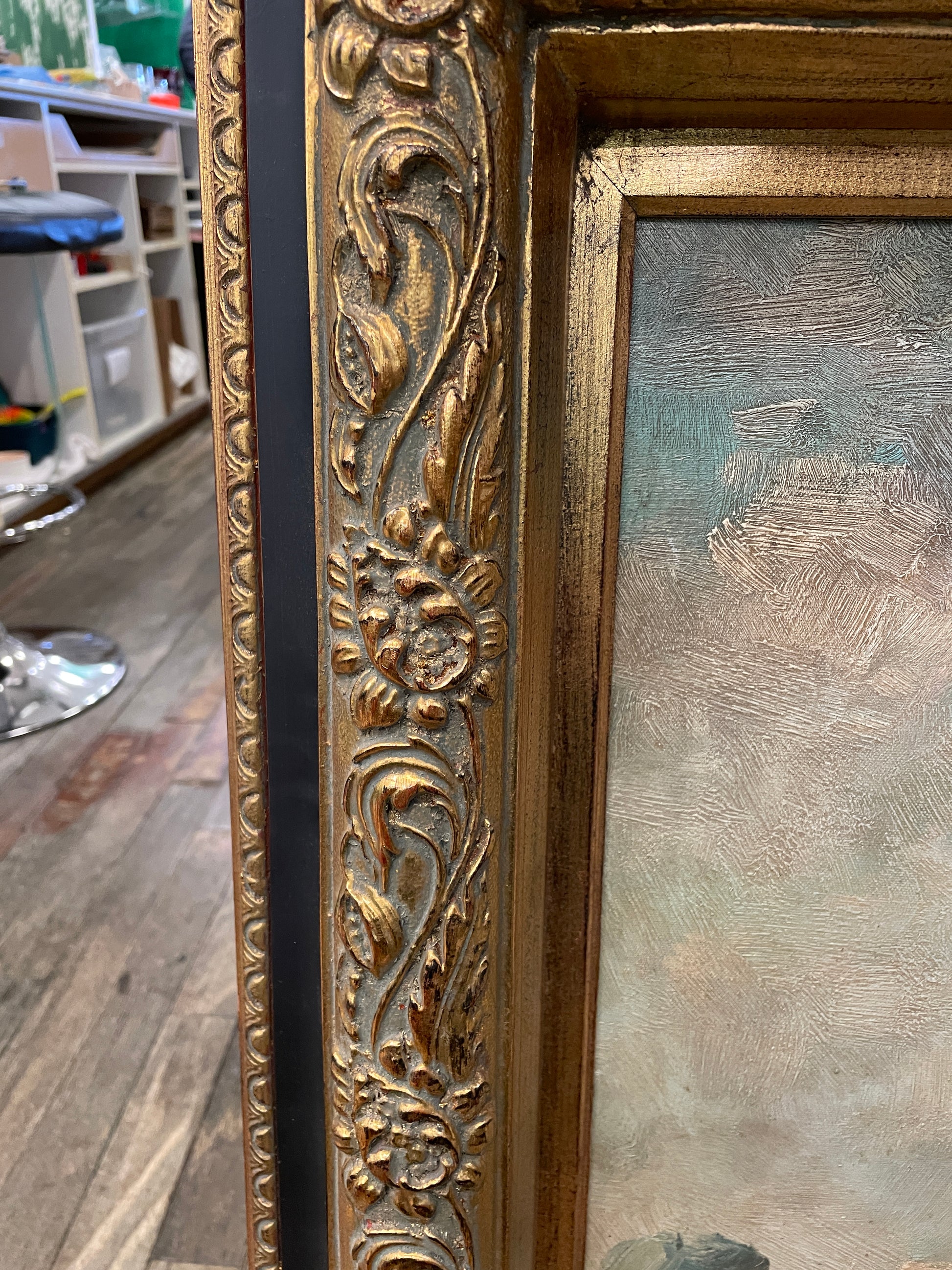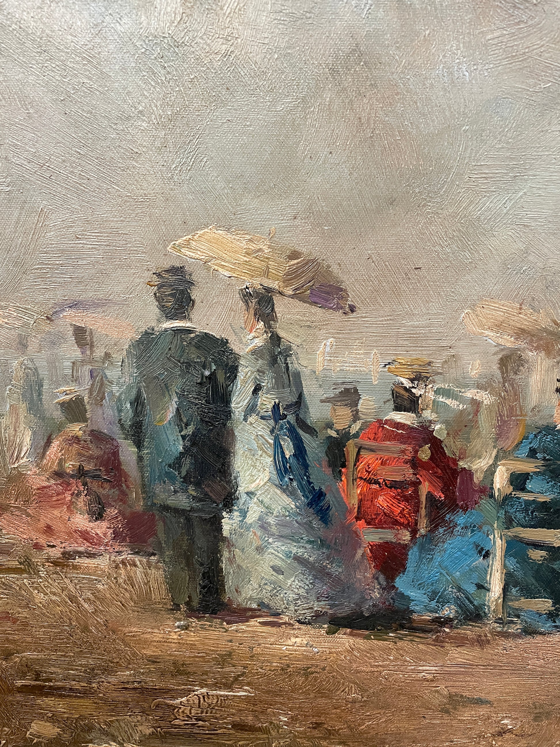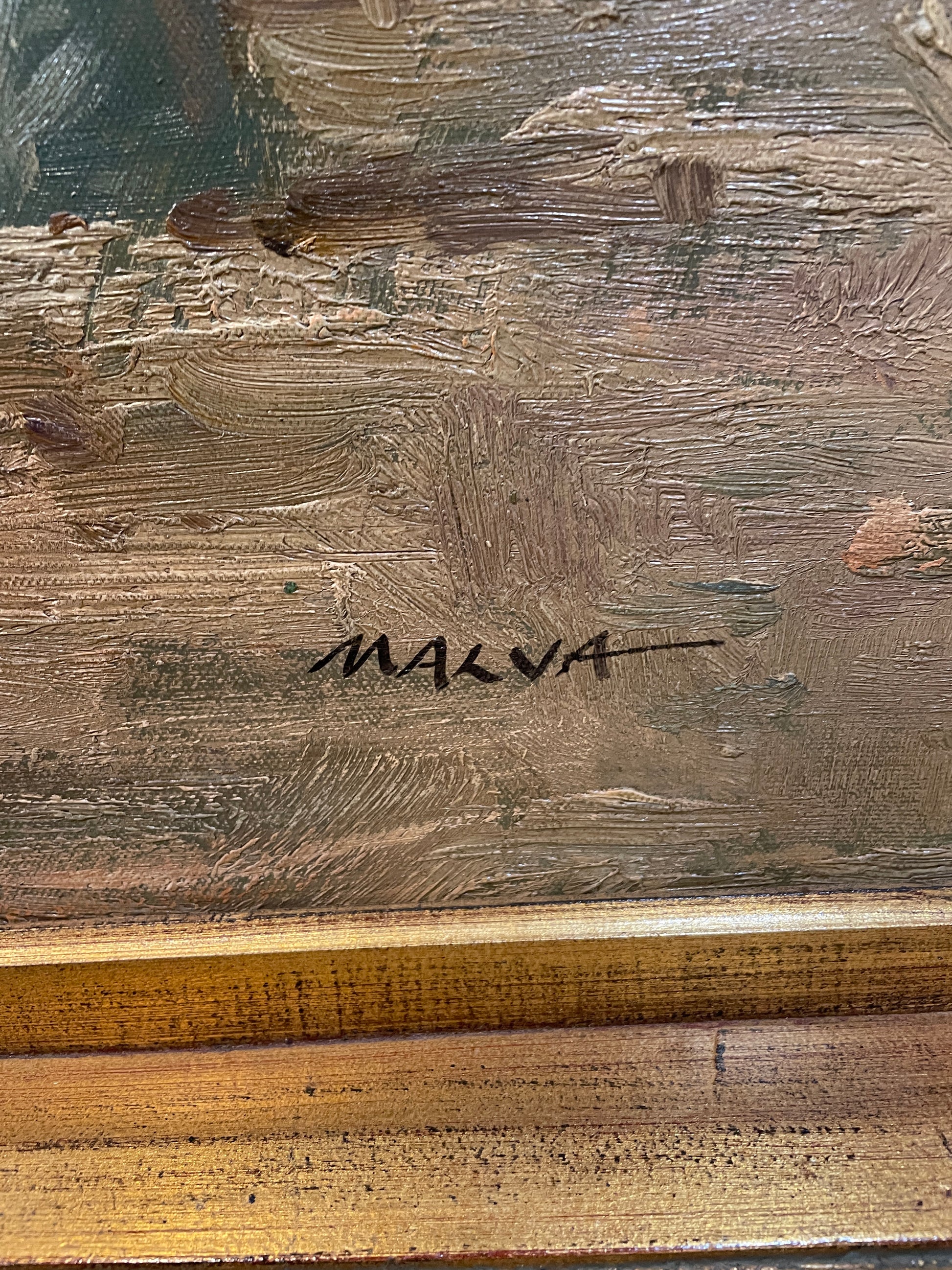 George Malva (1951-2015) oil on canvas sea scene. Signed lower right. This beautiful piece depicts a group of well-dressed individuals on a beach. The people are mainly grouped in the center of the piece, some of which are sitting, some holding parasols, and others simply standing. Closer to the coast sits two tall white beach tends that sit with French flags flying behind them. The impressionist style of this piece gives it an alluring feel that asks the viewer to look closer. The piece is held in a gilt ornate carved frame with a black center band. A beautiful piece that's sure to add a subtle nautical touch to any space.