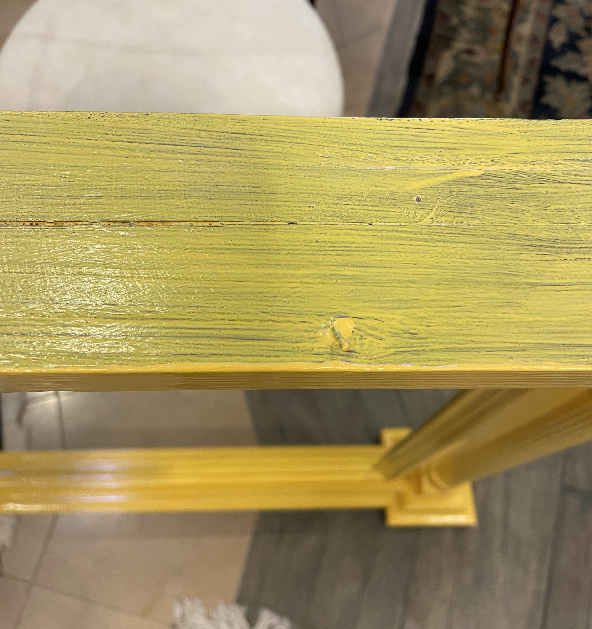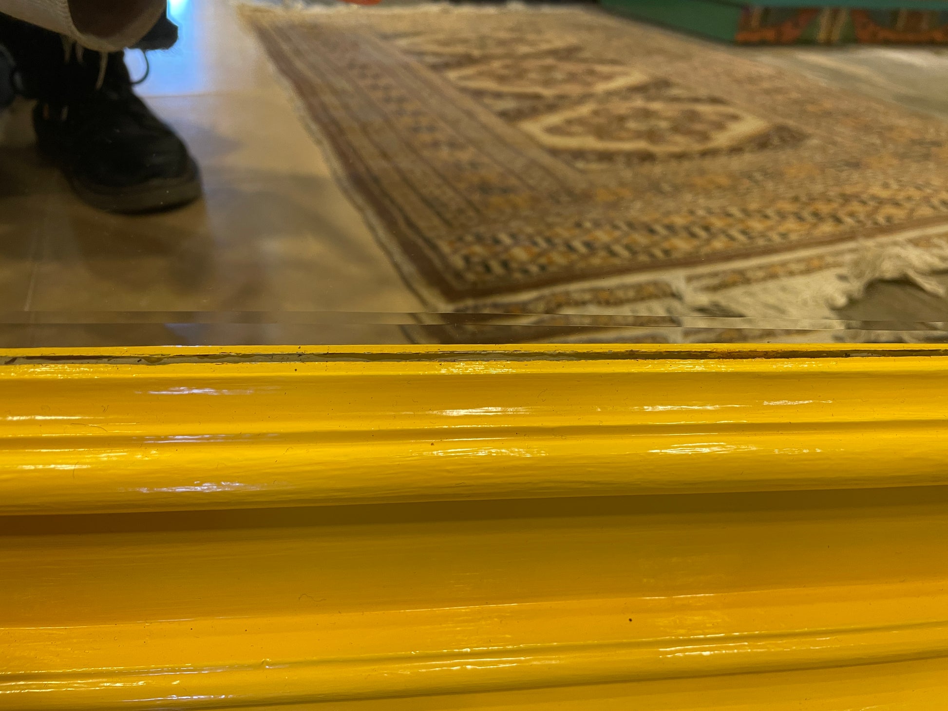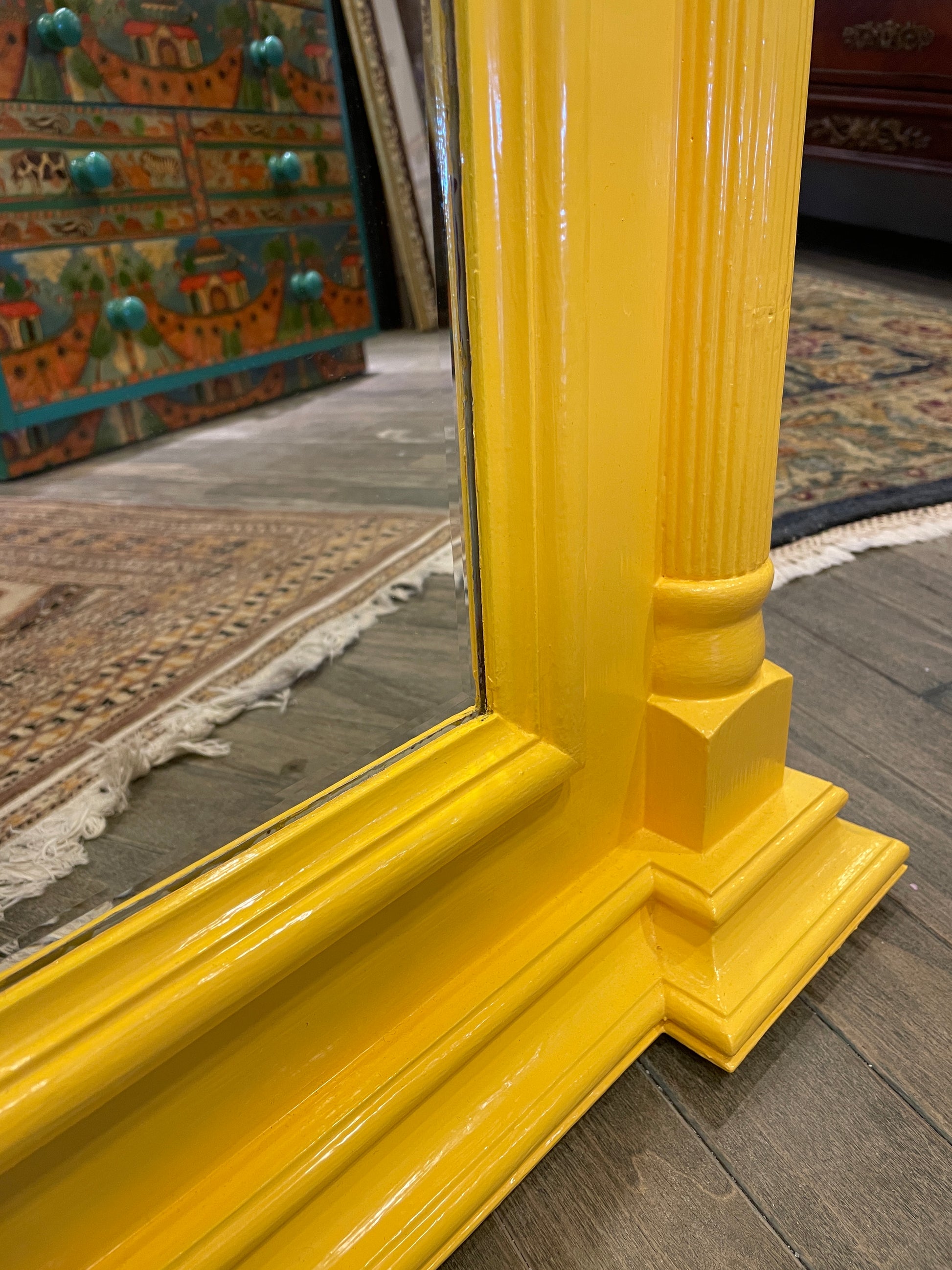 Rectangular mirror features beveled glass in a Georgian style frame with a bright yellow finish. Perfect accent piece for over a dresser.
