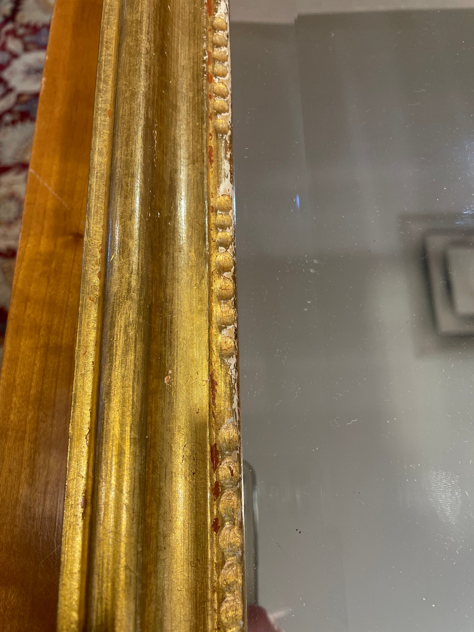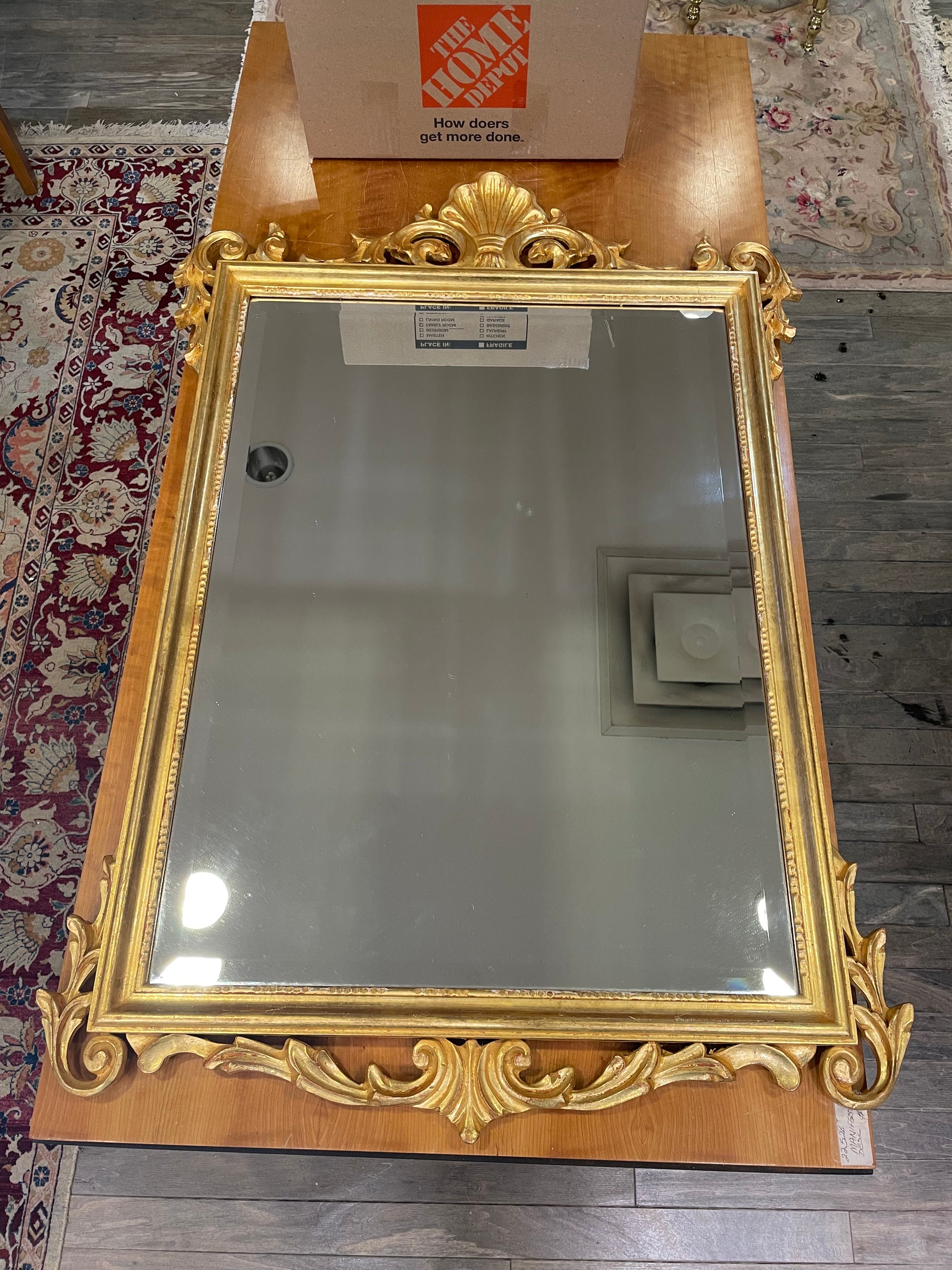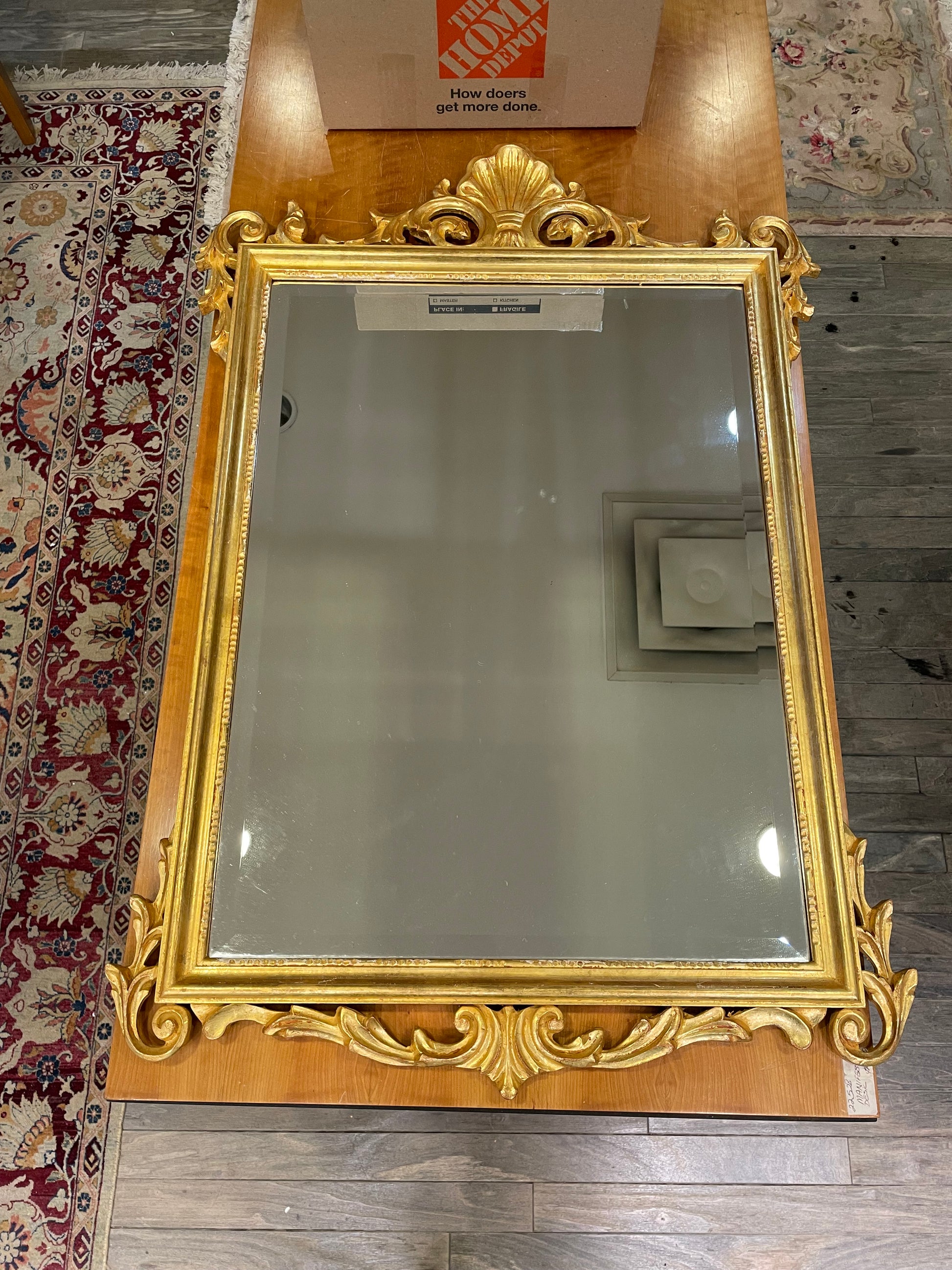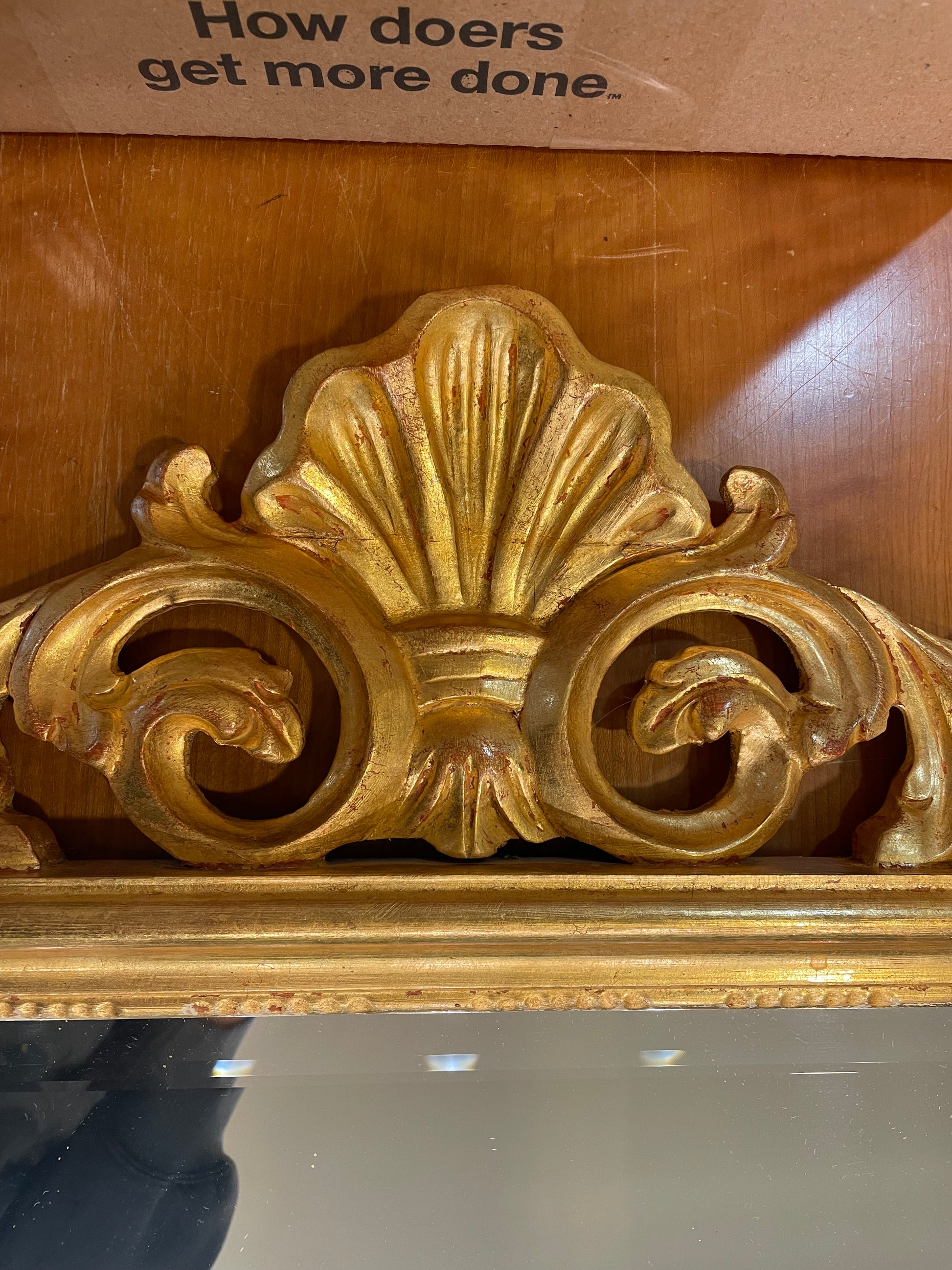 Traditional style wall mirror, unbranded. Features bevel-edge mirrored glass with a carved wood frame. It has a gilt finish with a shell finial and swirling leaves. The shell was cracked off but has since been repaired.