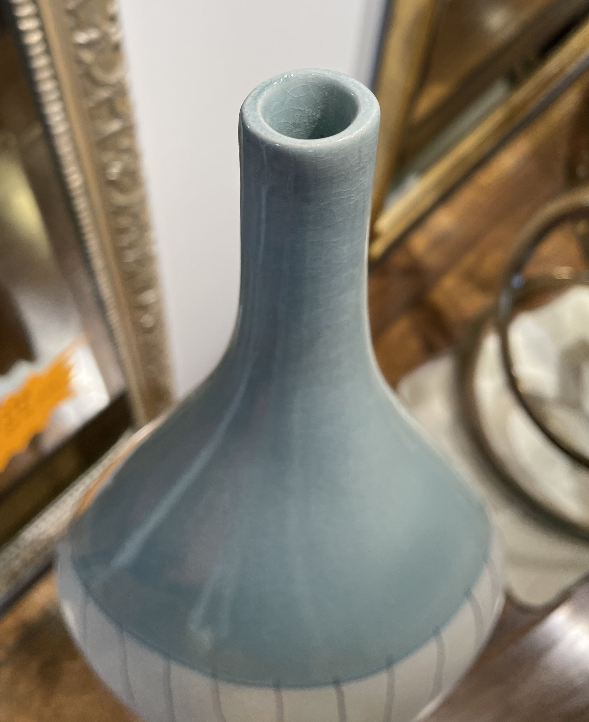Decorative ceramic vase from Global Views. Features a sleek, tall design with a glazed aqua bottleneck and a matte white base accented with vertical blue pin stripes.