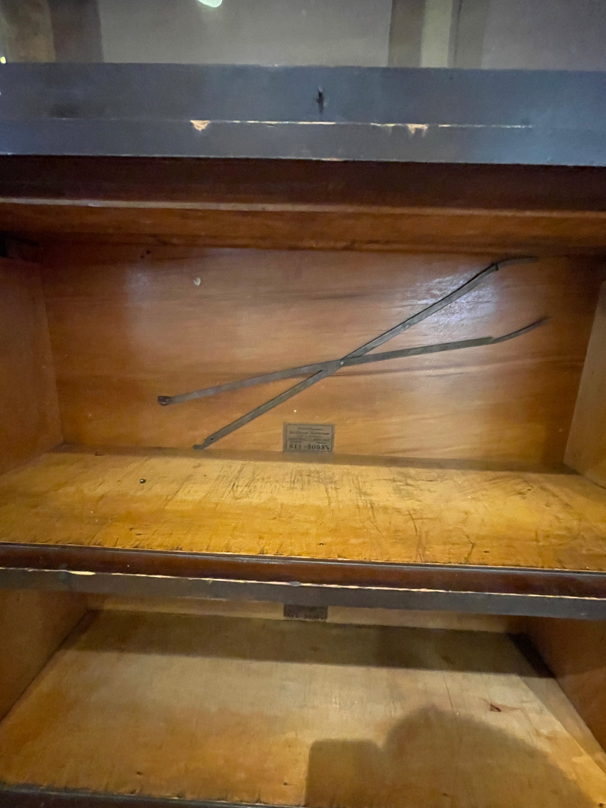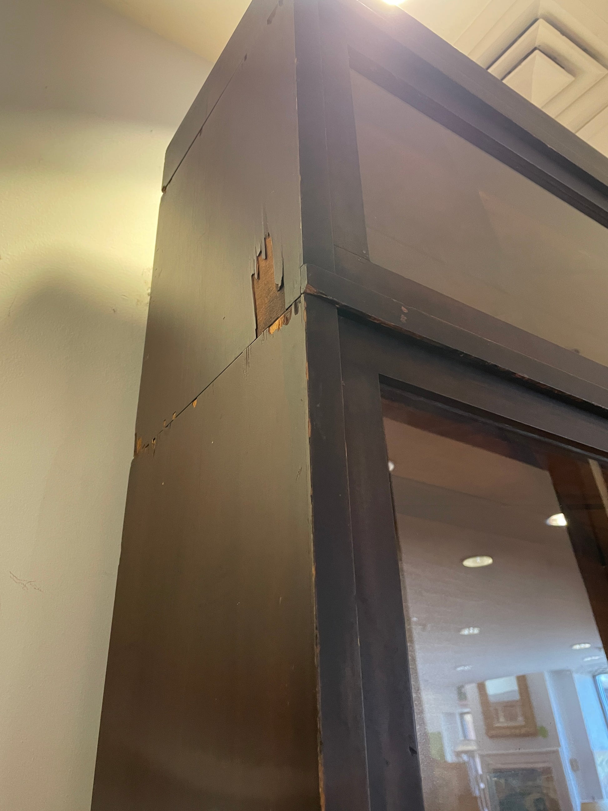 This item is sold in AS IS condition. Bottom two doors need to be re-attached, and there are some dings and chipping on the wood. Please see photos for details.