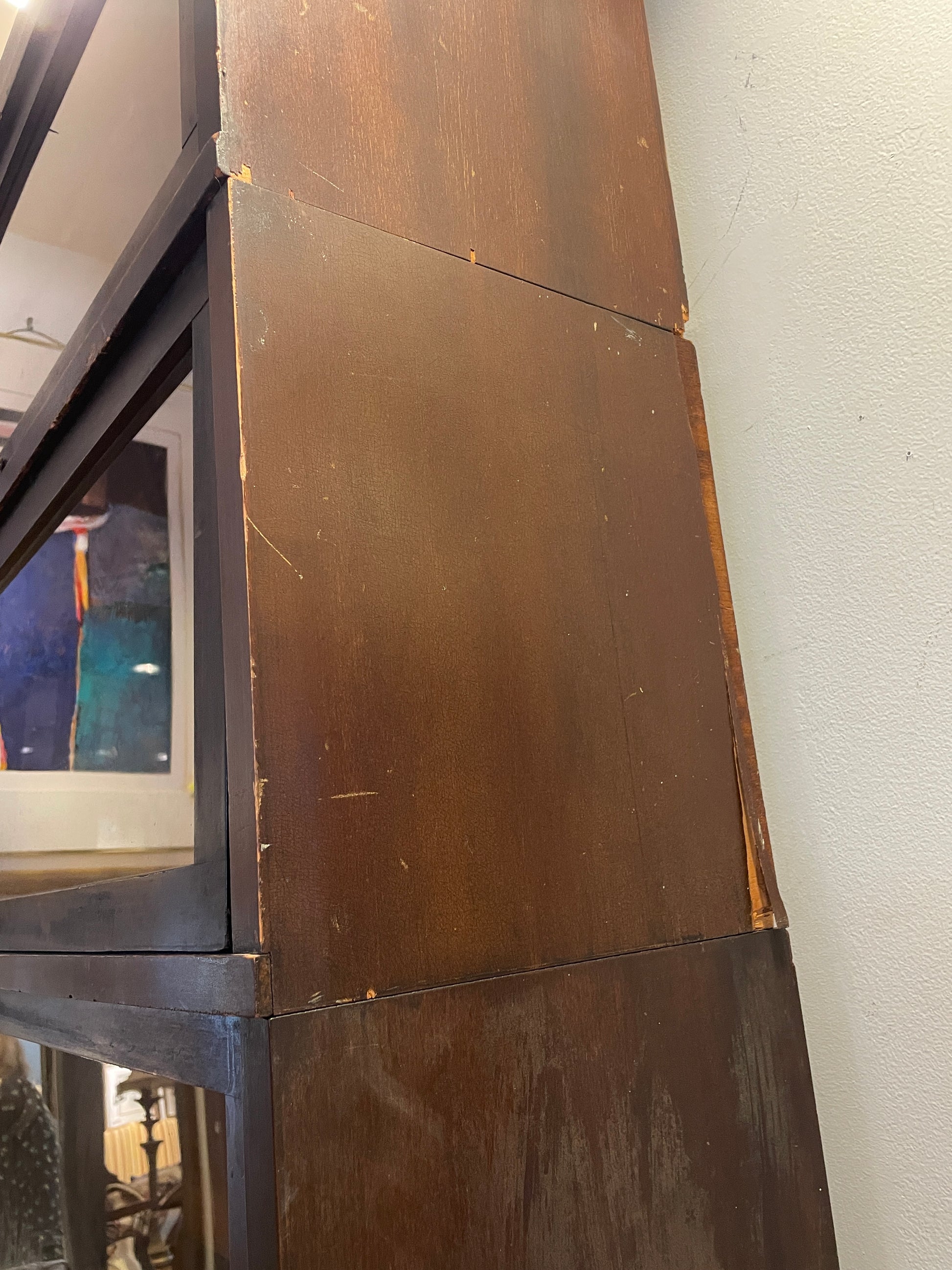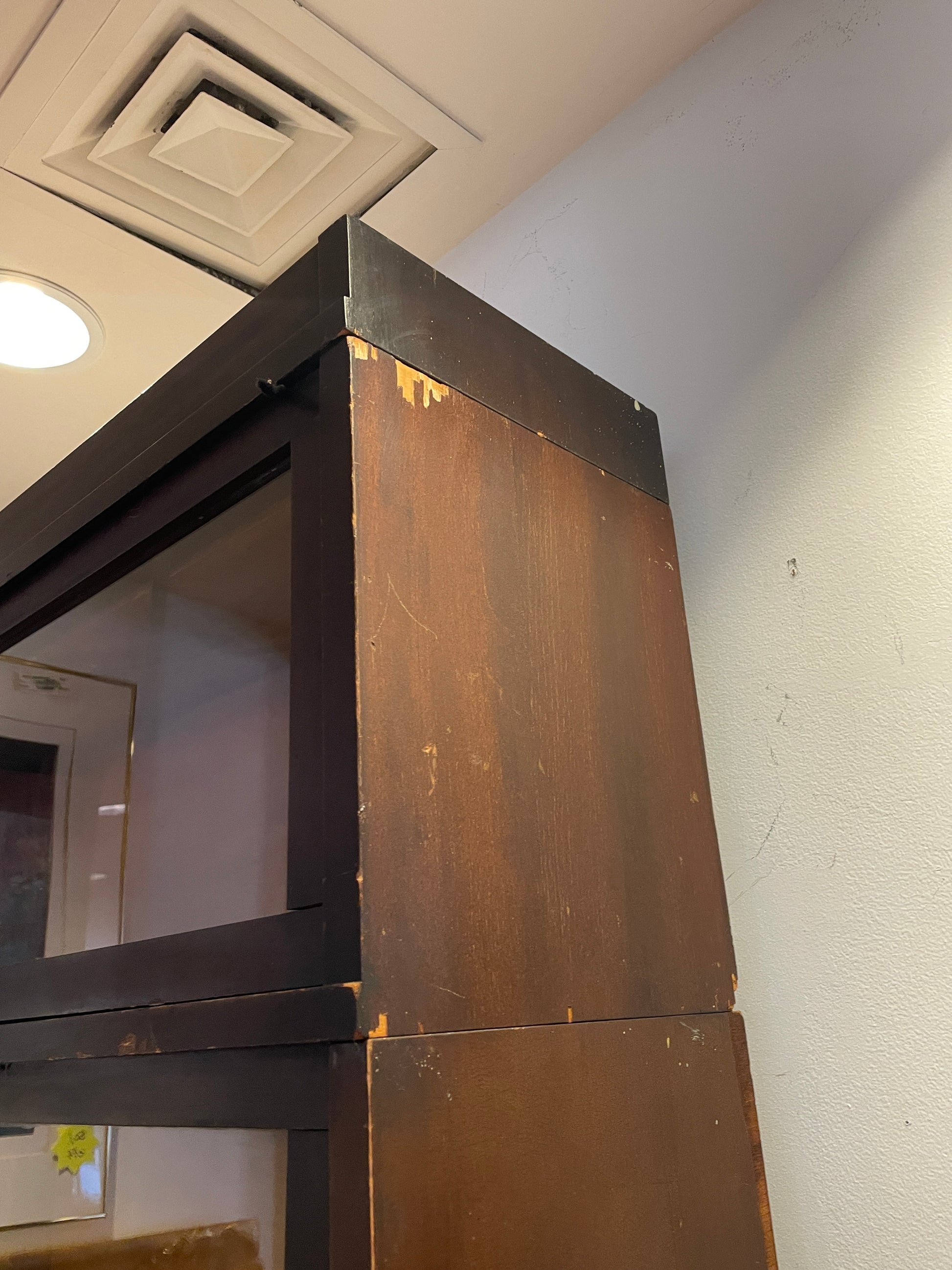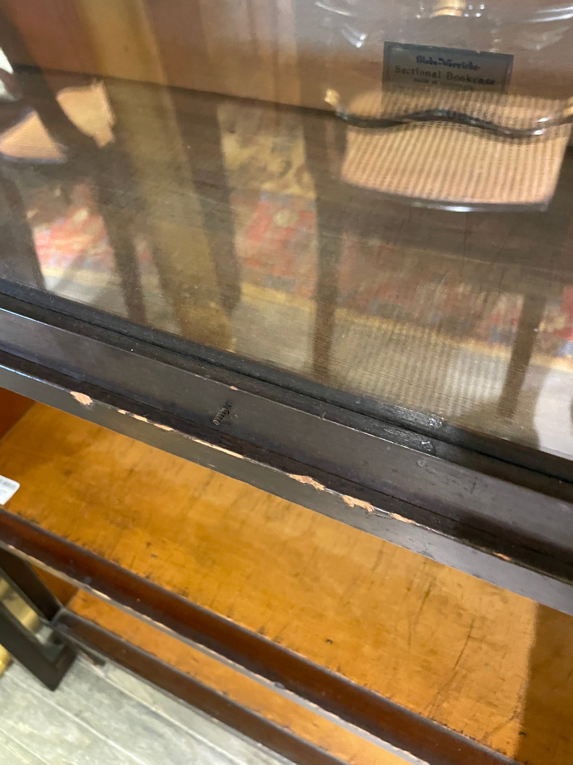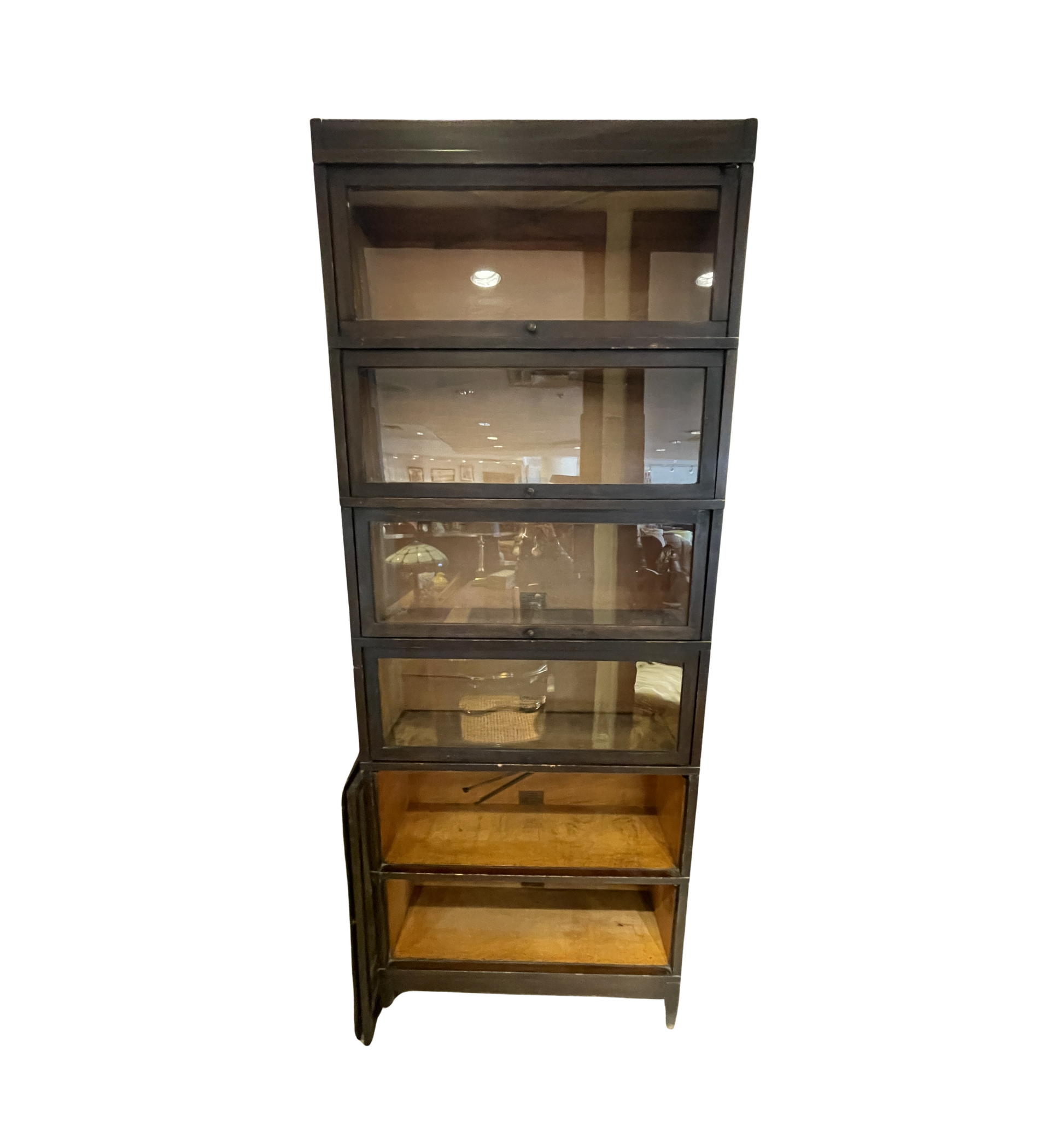 Globe Wernicke 6 stack barrister bookcase. This beautiful wooden piece features 6 shelves, each with a glass door that opens upwards. The doors have small knobs for ease of opening. This bookcase has a dark finish, which exudes elegance. It sits atop squared feet. Though this piece needs a little extra love to get back into shape, it would make a beautiful addition to a space.