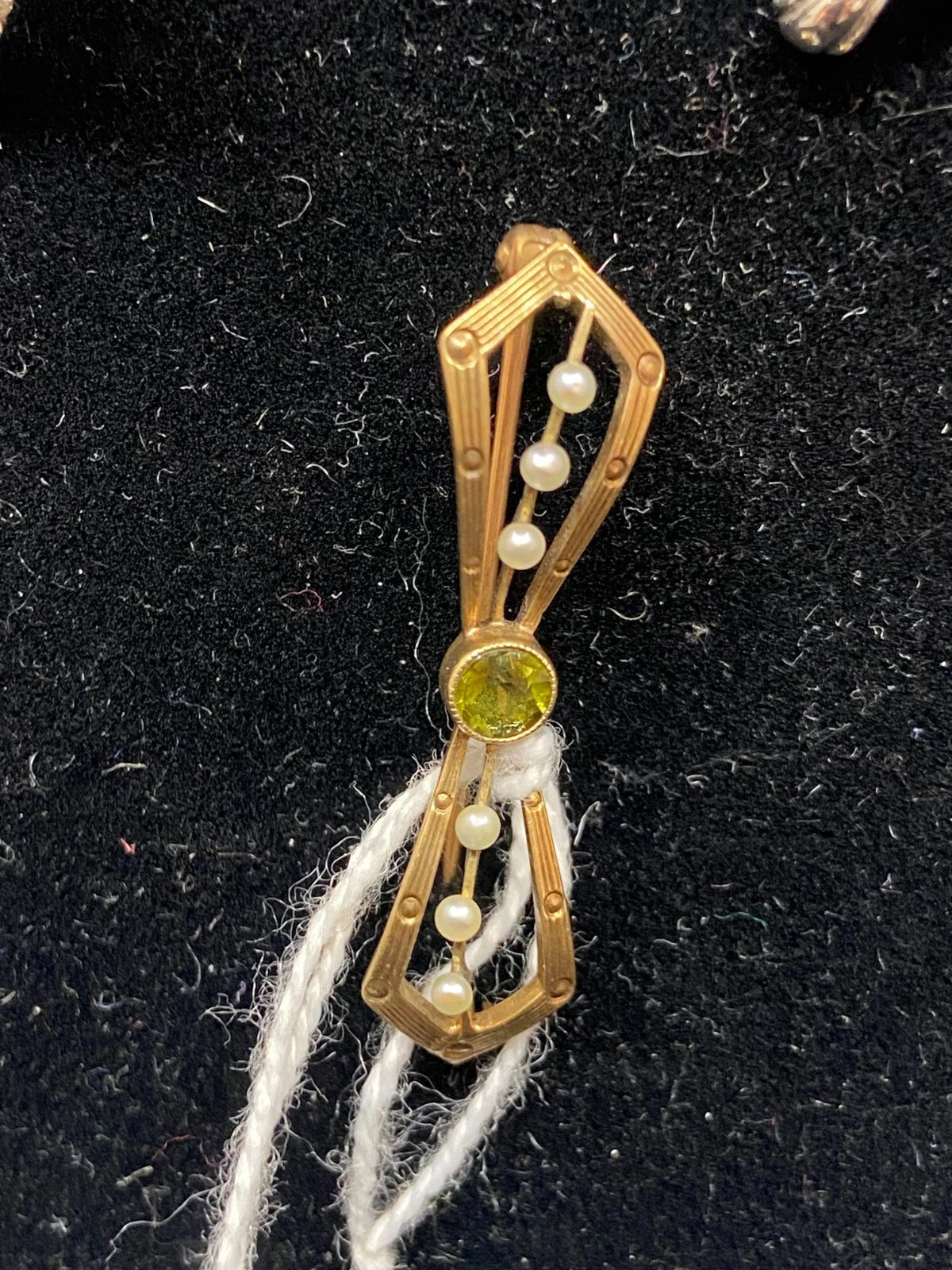 Pin features a golden bow design with three pearls flanking an Emerald.