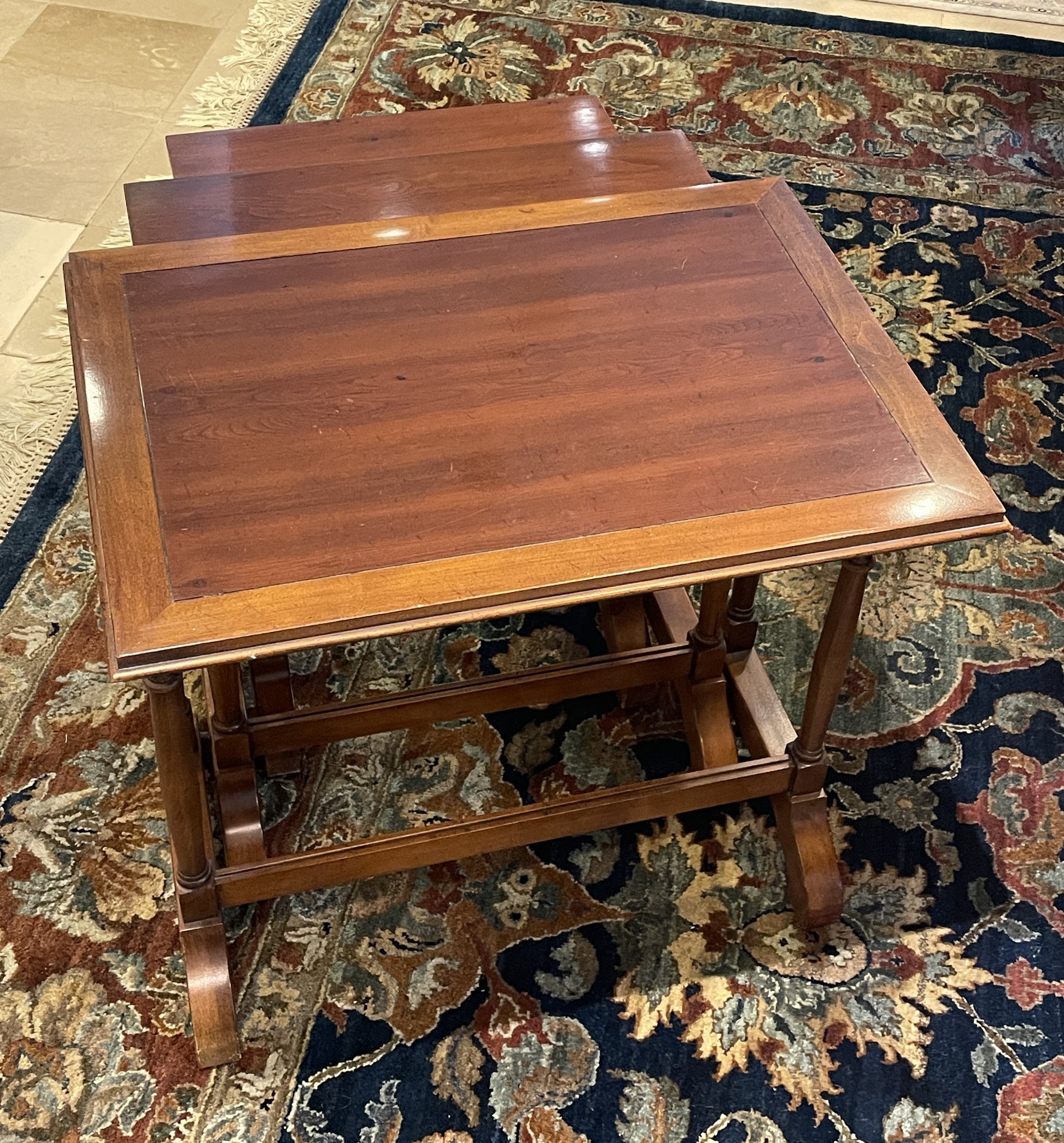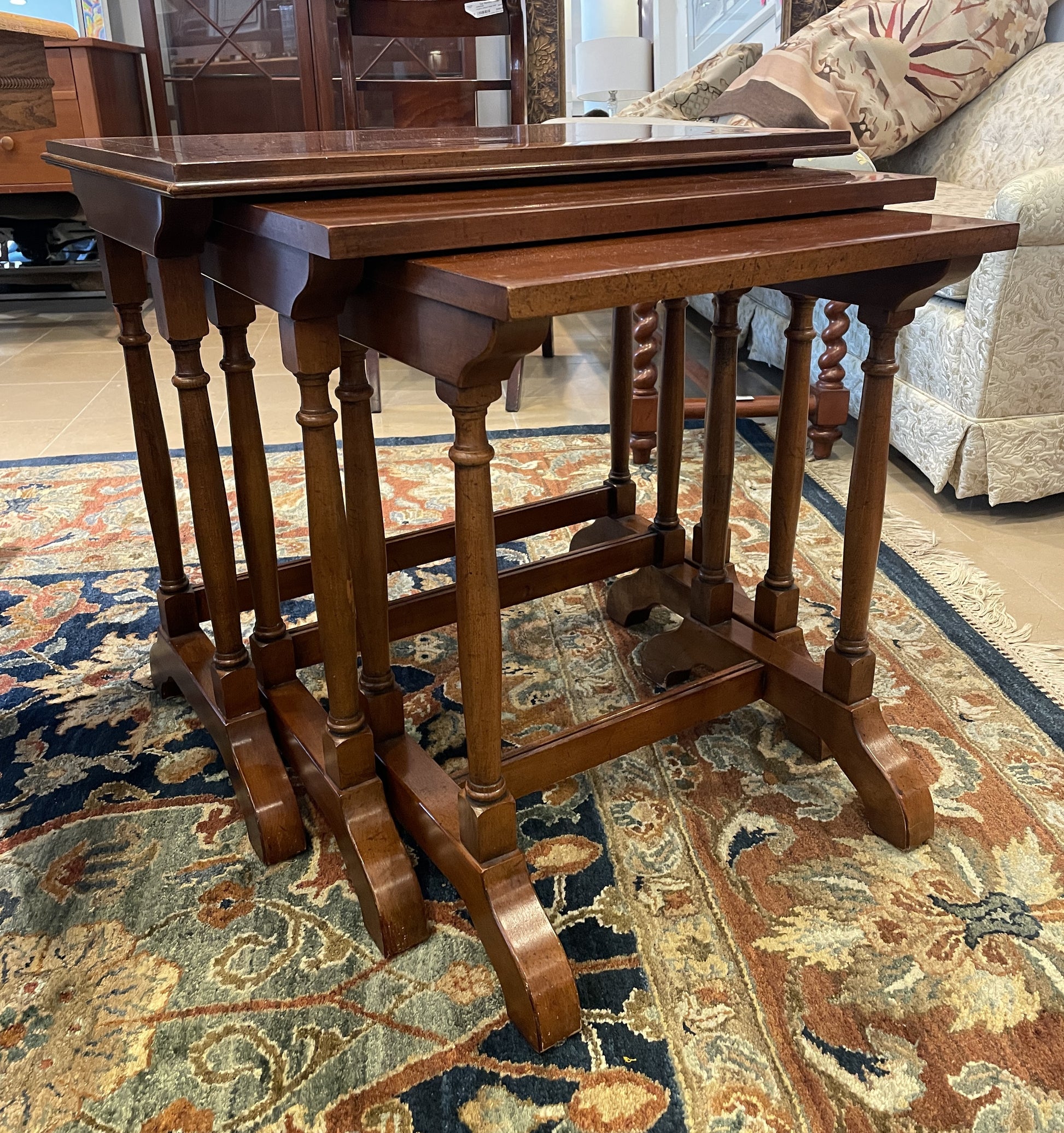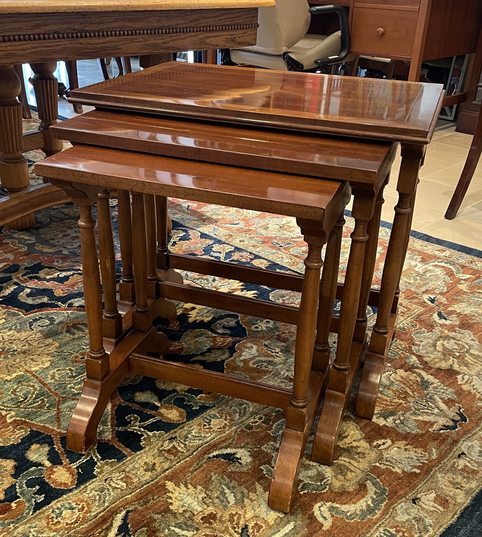 Gordons mahogany vintage nesting tables. These beautiful, functional pieces have class and charm. The set of three contains a small, medium, and large table all with similar, but slightly different designs. The smallest has a full wooden top, and an H stretcher connecting its legs. The medium one has a similar design, but the stretcher is at the back instead of in the middle. The Largest has the same back stretcher, but has a border on the tabletop. The legs on all three tables are the same. They are turned legs with sturdy bases connecting the two legs on either side. These elegant nesting tables are a versatile, and compact way to add more purpose to a room.