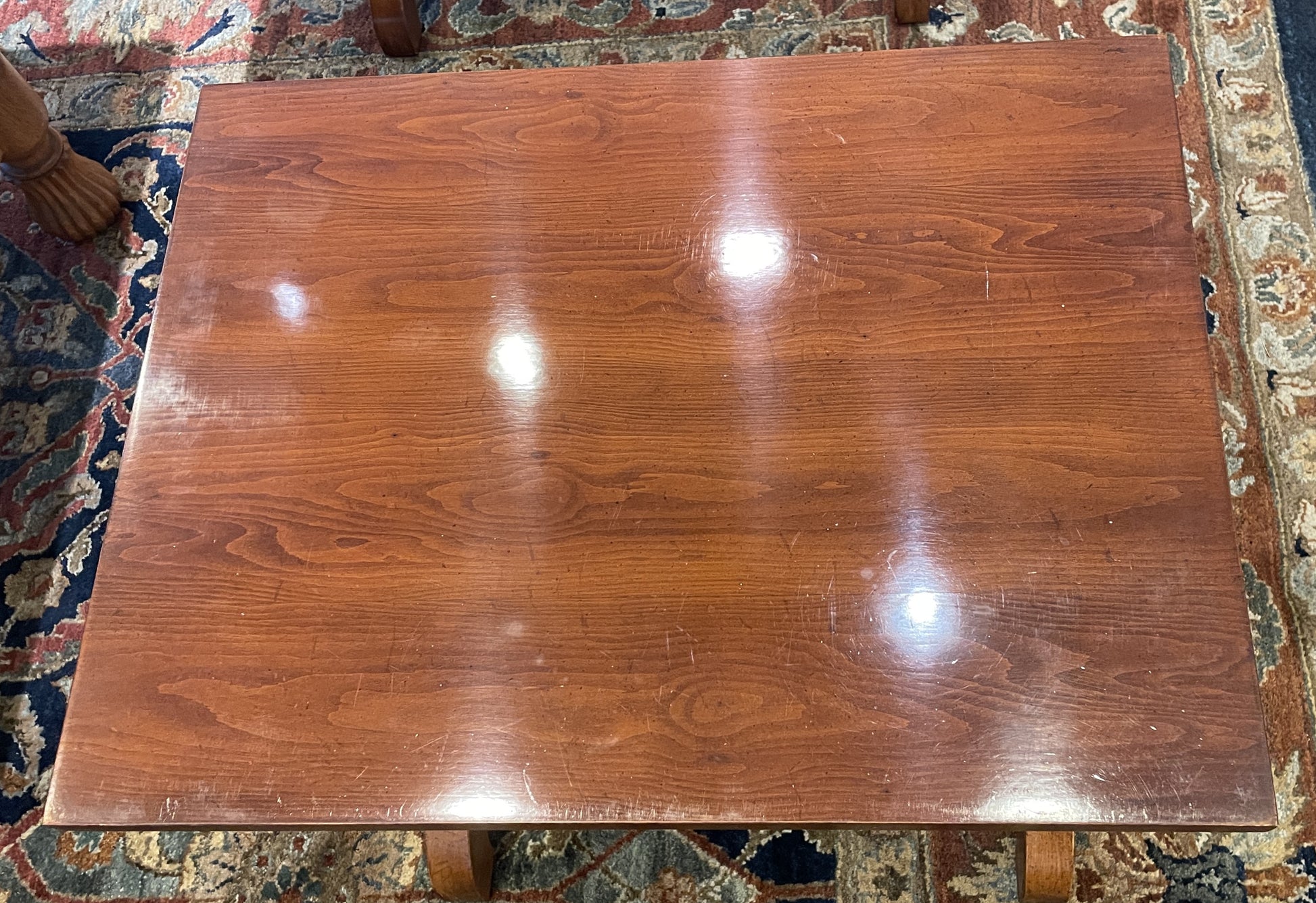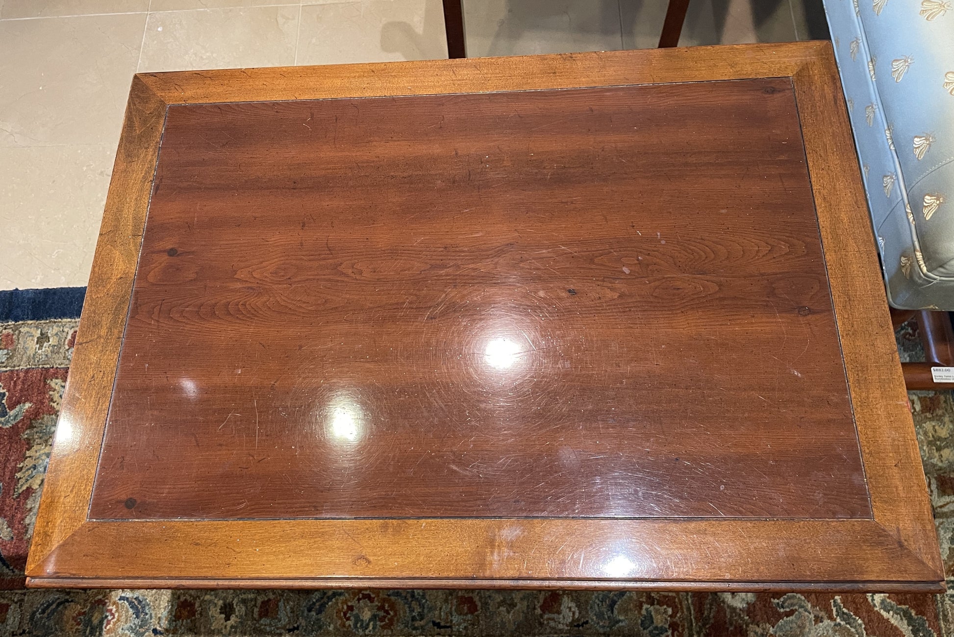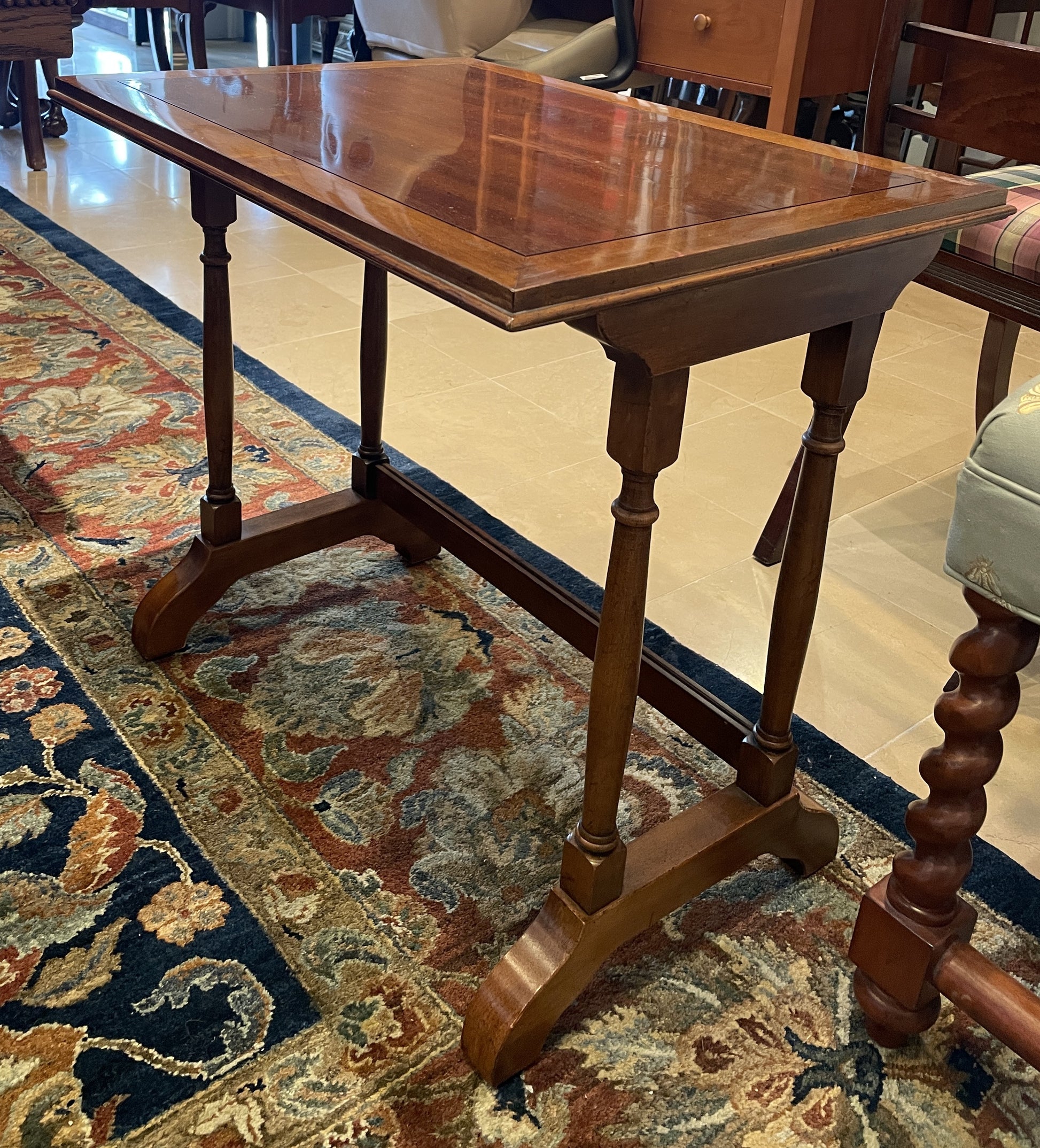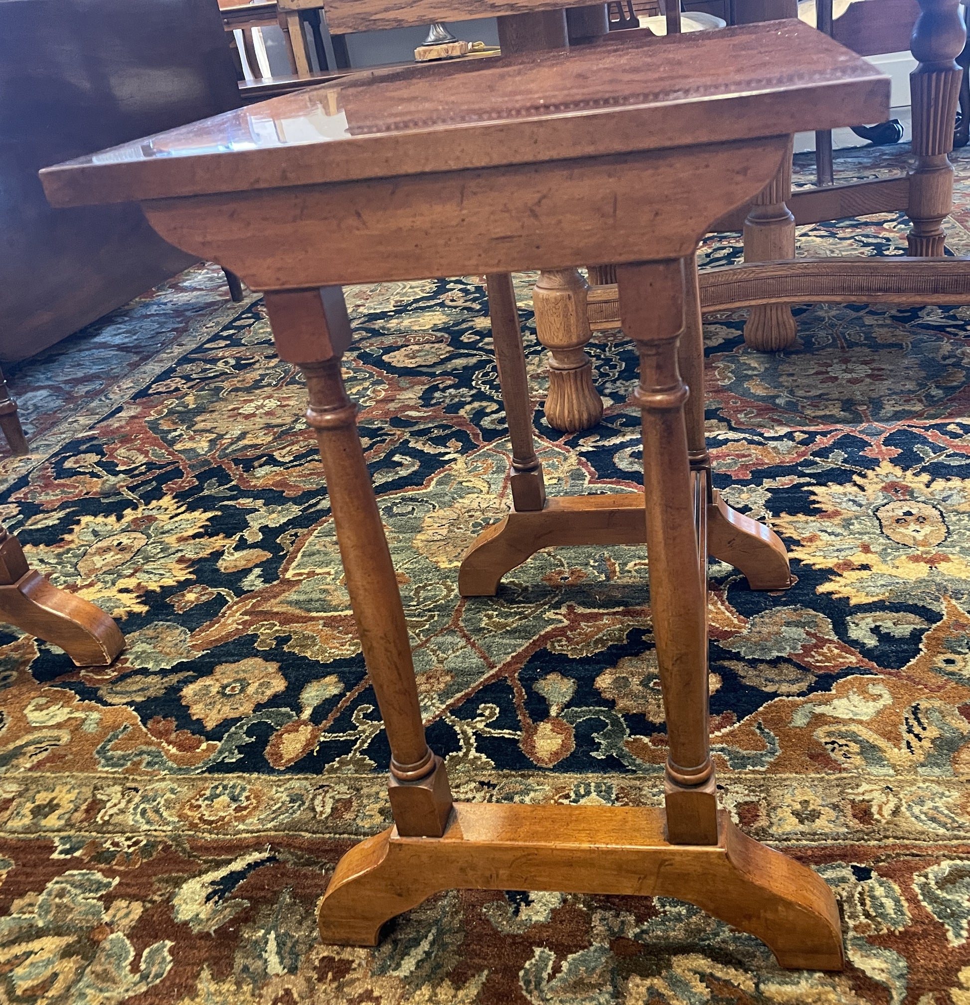 Gordons mahogany vintage nesting tables. These beautiful, functional pieces have class and charm. The set of three contains a small, medium, and large table all with similar, but slightly different designs. The smallest has a full wooden top, and an H stretcher connecting its legs. The medium one has a similar design, but the stretcher is at the back instead of in the middle. The Largest has the same back stretcher, but has a border on the tabletop. The legs on all three tables are the same. They are turned legs with sturdy bases connecting the two legs on either side. These elegant nesting tables are a versatile, and compact way to add more purpose to a room.
