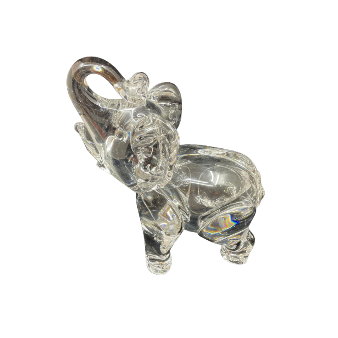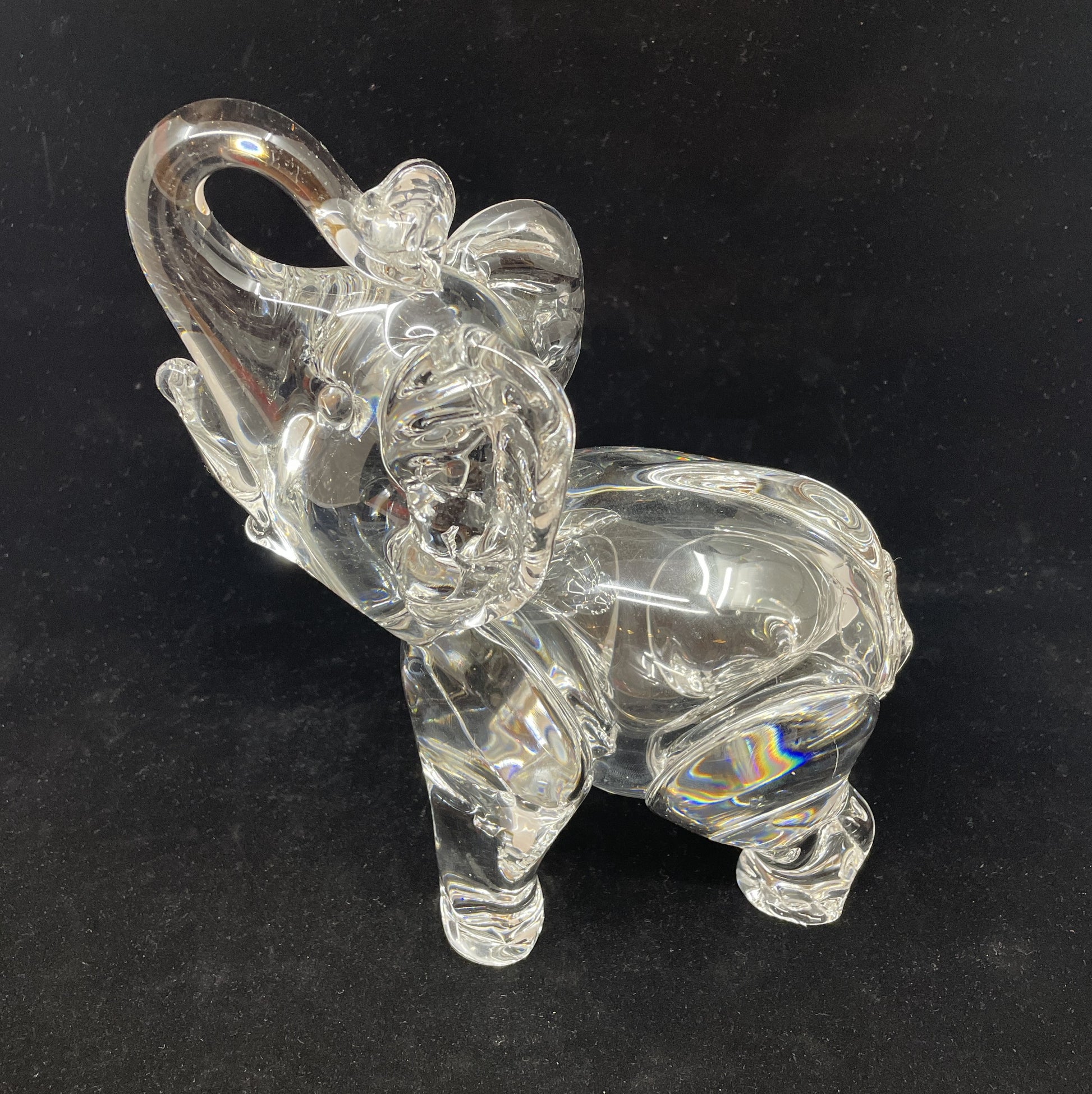 Solid hand blown glass elephant from Murano. Features a heavy elephant with its trunk raised above its head. Tusks can be seen near its mouth. The ears have ribbed details.