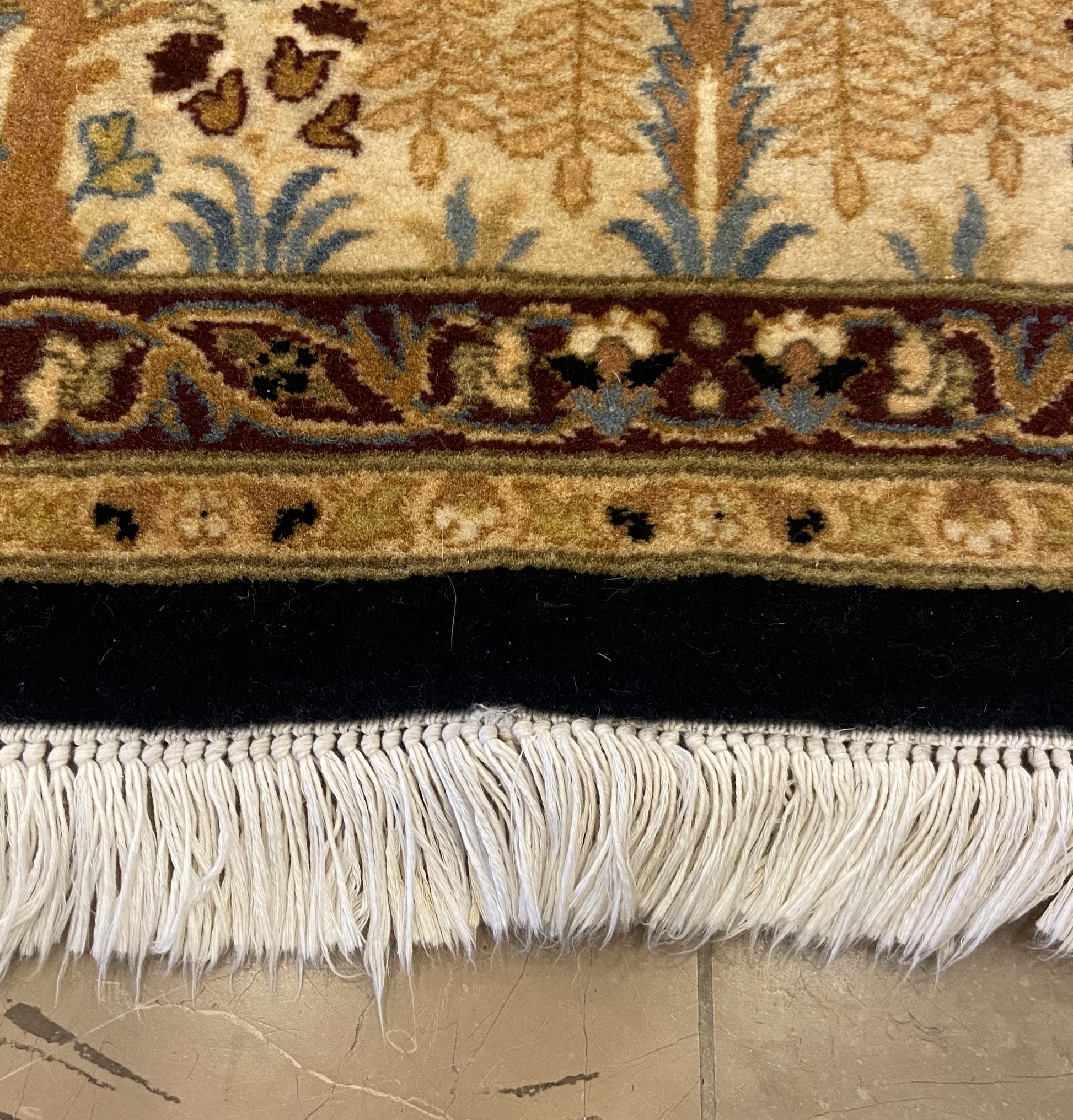 Gorgeous hand-knotted rug. Features a traditional style with gold and black squares with some blue, green, and maroon detailing. An ornate pattern surrounds the perimeter while cream fringe adorns the top and bottom edges of the rug.