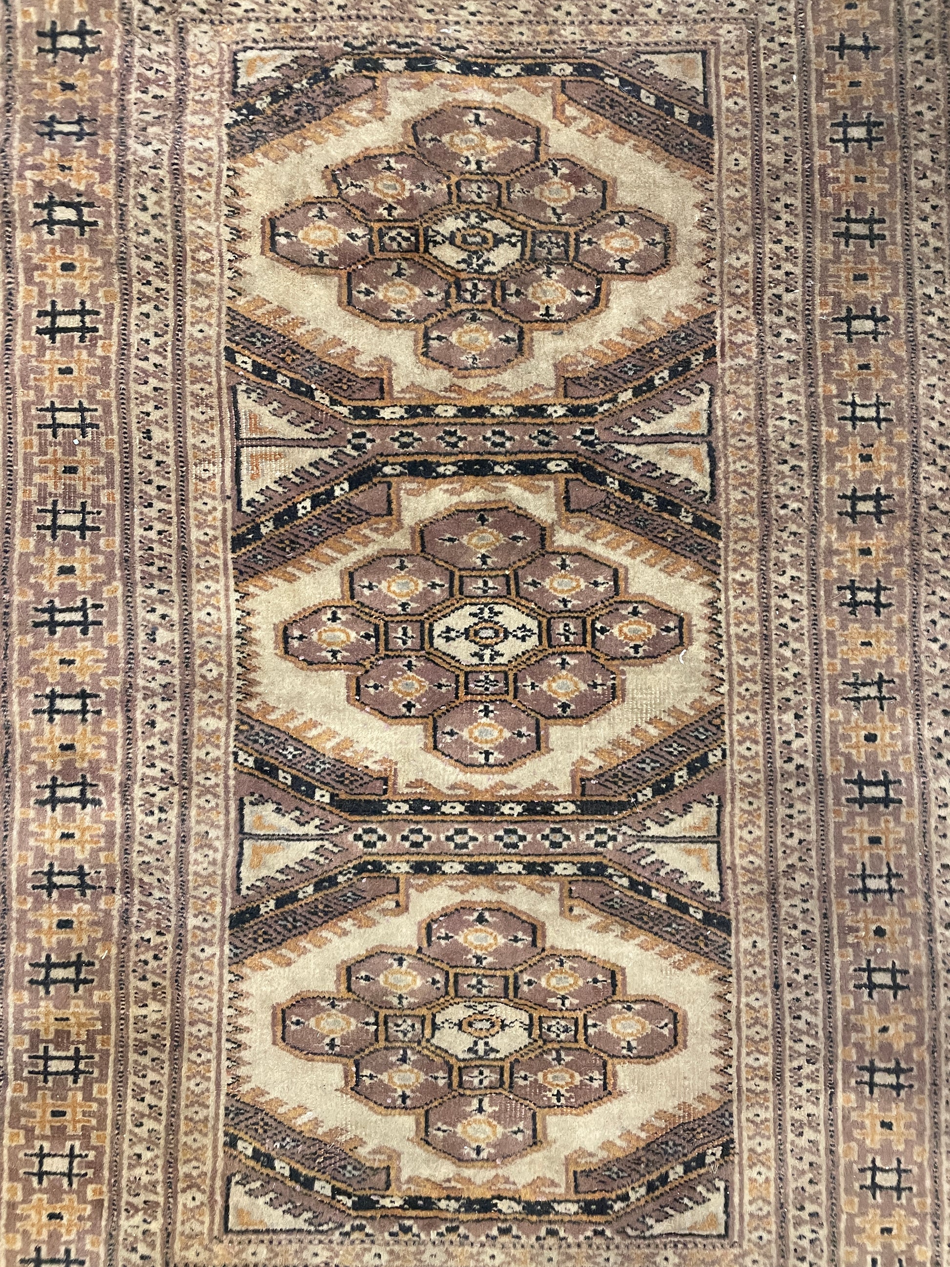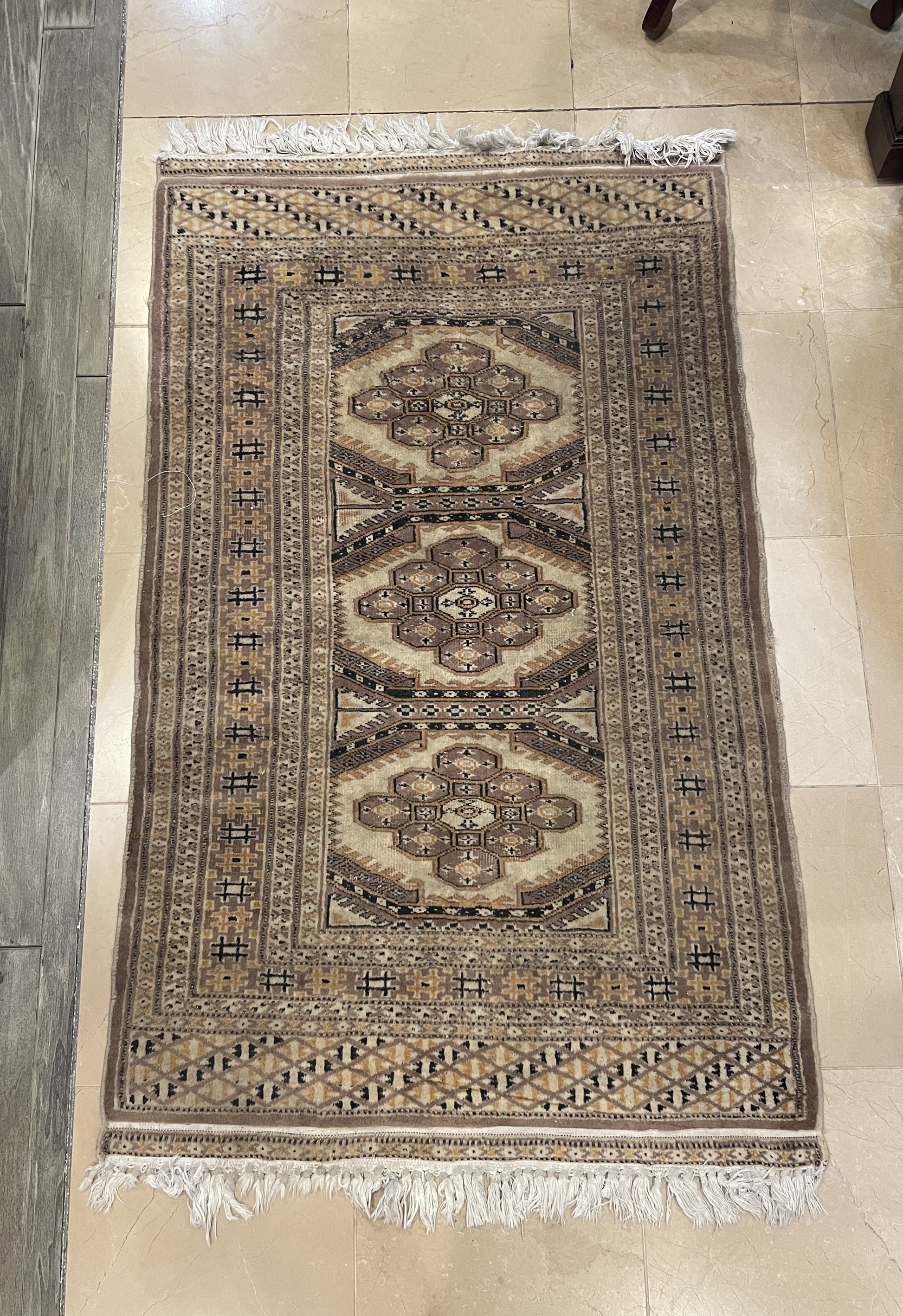 This small hand knotted Turkish rug features a brown and cream geometric pattern throughout. There is white fringe along the top and bottom edges.