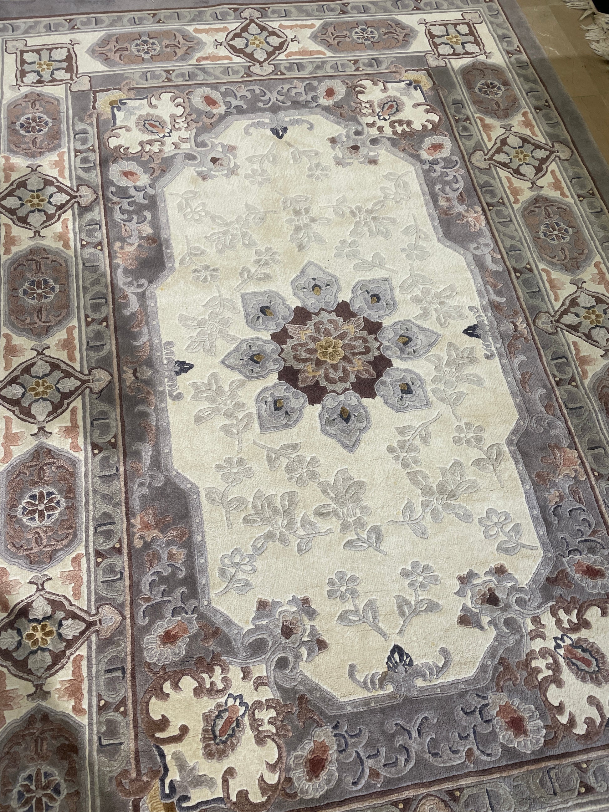 Features a light, peaceful appearance with white, gray, and pale pink and purple colors. A floral motif is present throughout the rug found in its banded edge, center medallion, and the stems of flowers dancing in its center. A fringe is affixed to each side of the rug in a complimentary creamy white color.