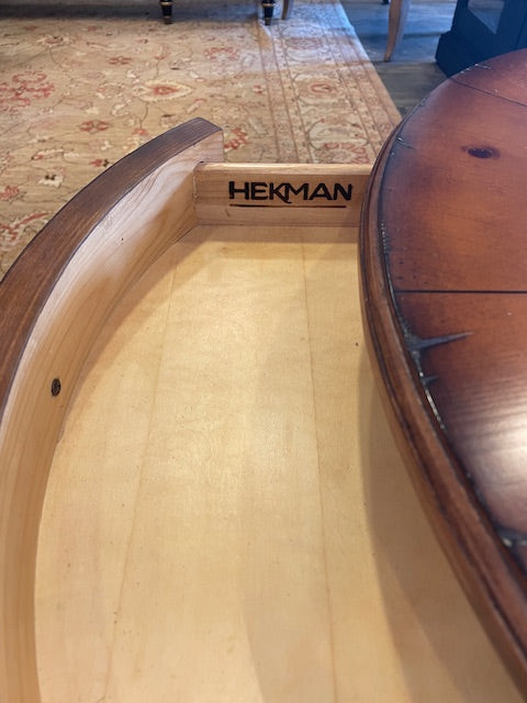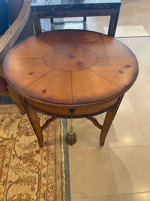 Hekman oval shaped end table with drawer. This mid-century modern piece with one drawer is full of character and charm. It is a round, almost circular shape that is slightly longer in width than length. It features an X-shaped stretcher that holds together tapered legs. The drawer is opened via a small brass pull handle that is embellished with a large green and brown hanging tassel. The tabletop has a wheel-like design with a central oval with spokes stretching out towards the edges. This beautiful piece would be a great complement to a similar style sofa or chair.