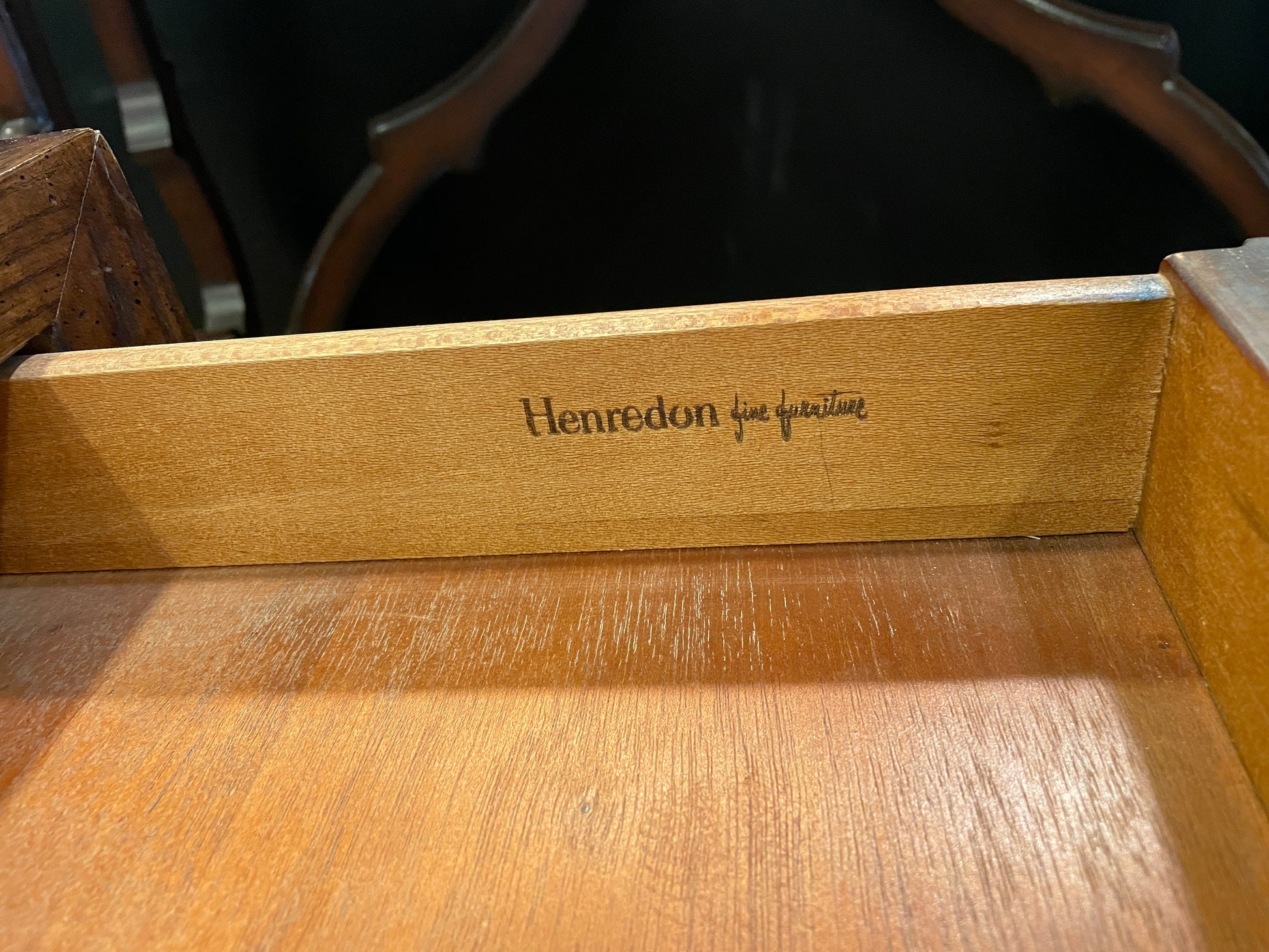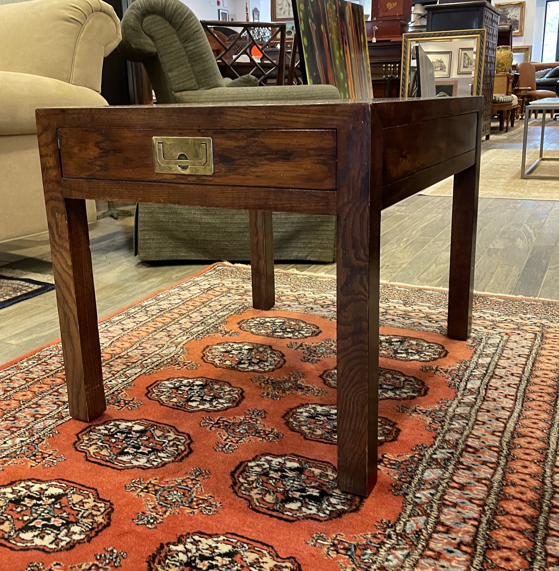 Campaign-style end table by the brand Henredon originating in the mid-20th century. This particular end table reflects Henredon's commitment to quality and design. The table contains one drawer marked with the Henredon branding in its interior. The parquetry top, burl walnut veneer, and brass hardware are characteristic of their mid-20th century production. Campaign furniture, traditionally designed to be portable for military officers, is known for its functionality and durability, making this table both stylish and practical.