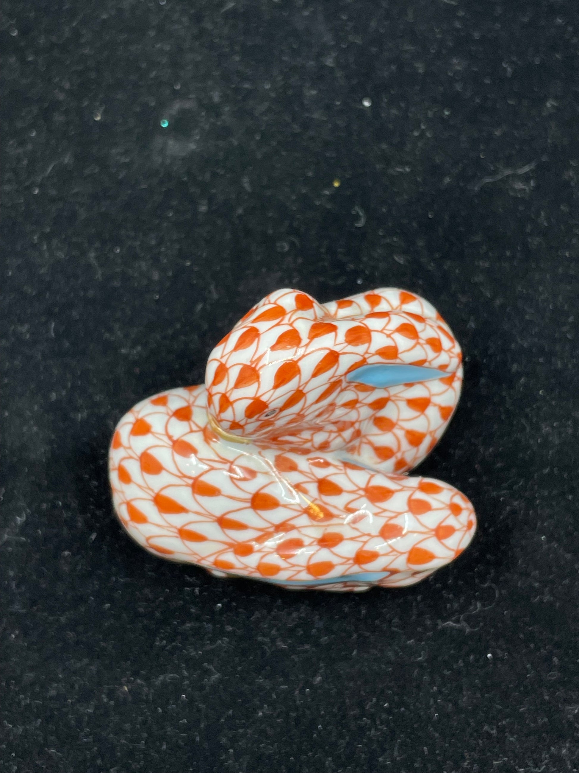 Herend porcelain figurine features two snuggling bunnies intricately hand-painted with a rust-colored fishnet pattern and gilt accents. It is stamped on the bottom and numbered "242".